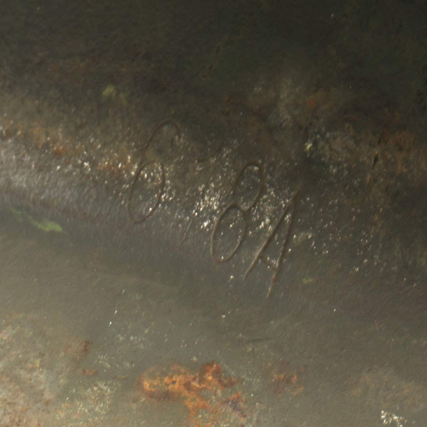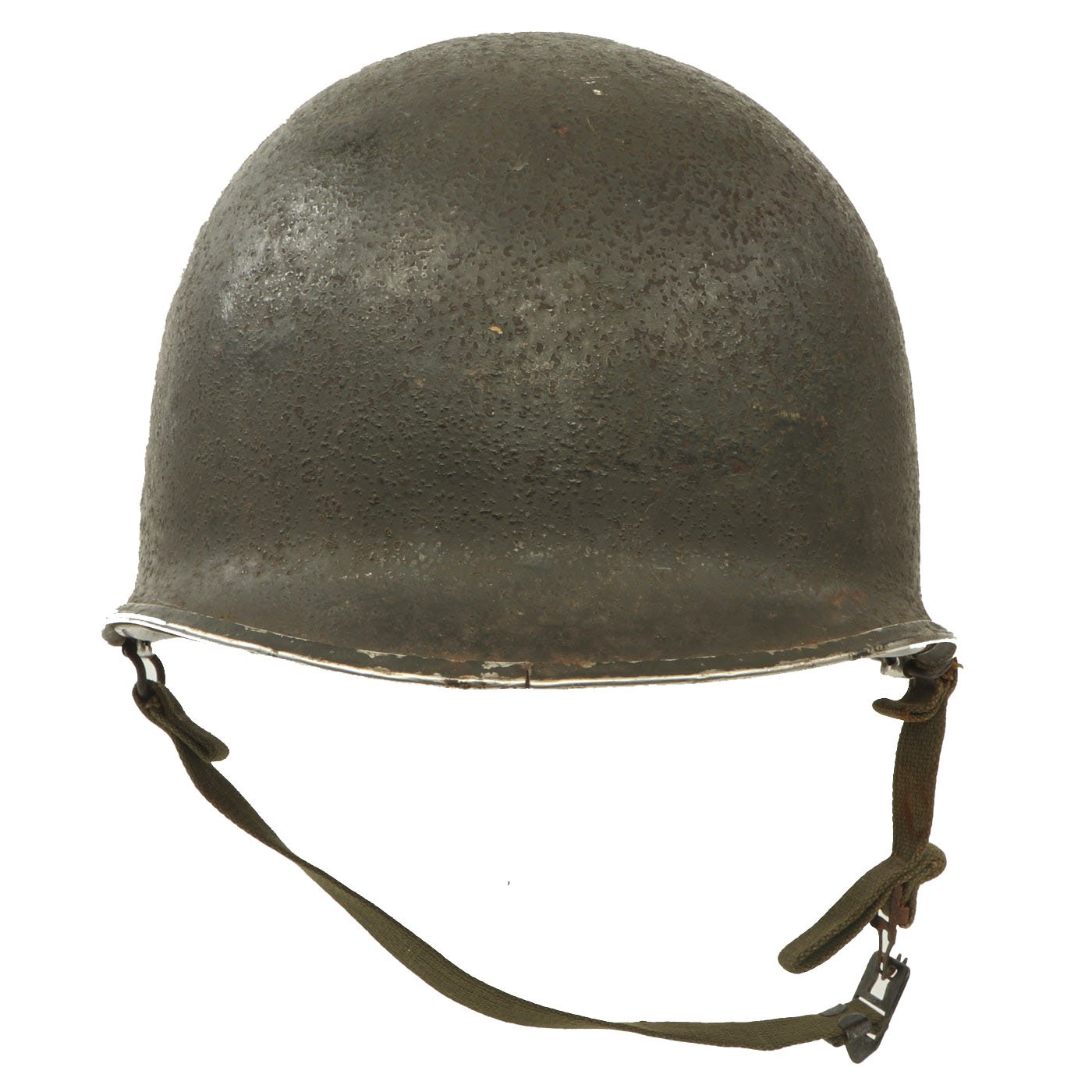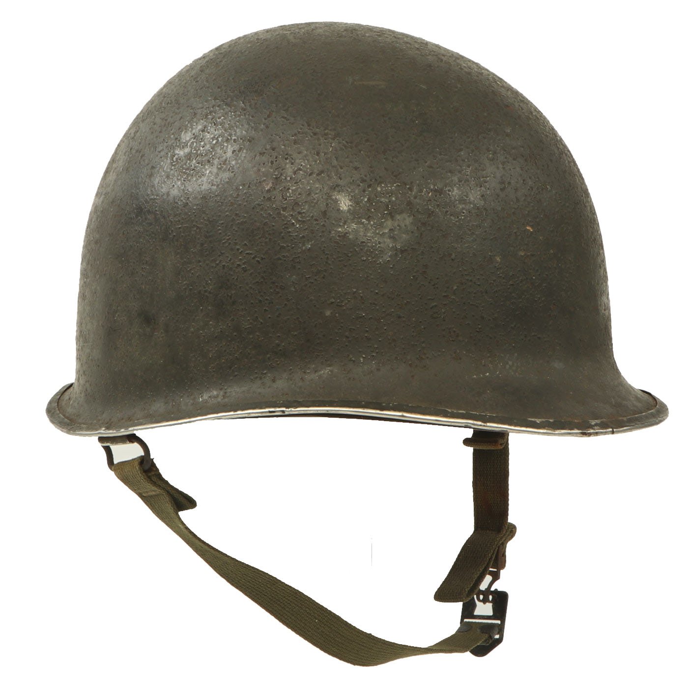 This M1 shell has correct mid-late war swivel chinstrap loops, called "bales," and a stainless steel rim with a front seam. These rims were both rust resistant and had "non-magnetic qualities" that reduced the chance of error readings when placed around certain sensitive equipment (such as a compass). In October 1943, issues with the fixed bales breaking off resulted in a change to the "swivel bales". Then in October 1944, the rims were changed to non magnetic manganese steel, due to issues with the paint wearing off the rim. Shortly after this in November 1944 the specification was changed to have the rim seam in the rear of the helmet.
