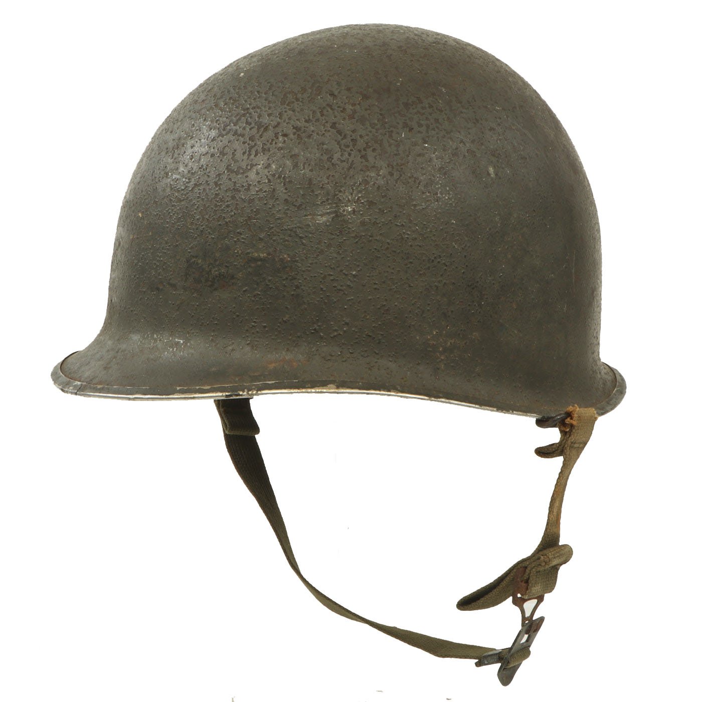 This helmet is a fine example and still retains most of its original WWII parts. The original "corked grain" can still be seen on the exterior, however the shell does show quite a bit of wear, so a lot of the cork has worn off over the years. It has the correct swivel bails and a front seam stainless steel rim, which is missing paint, as is typical. The chin strap is the correct mid war OD Green #3 with a stamped steel buckle.