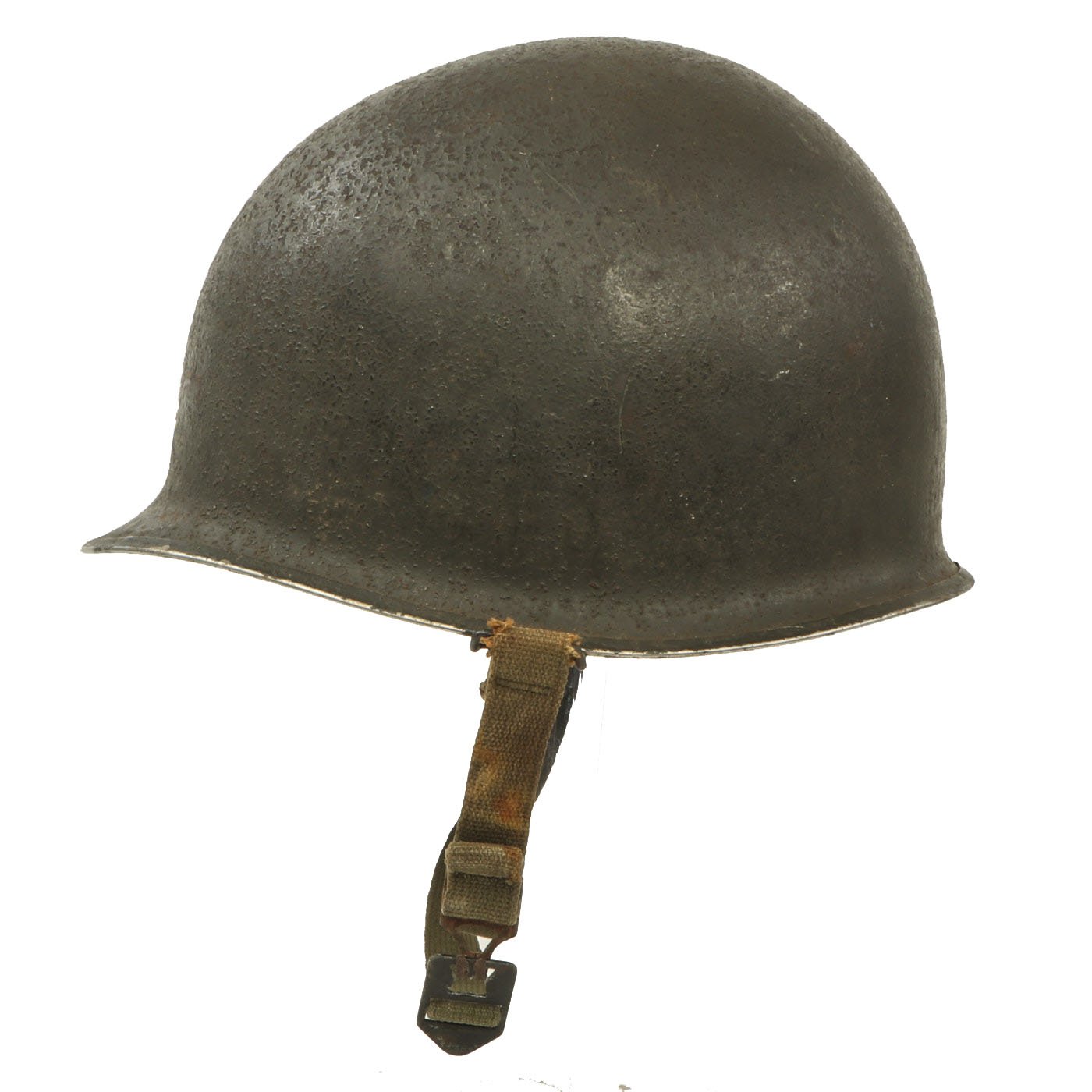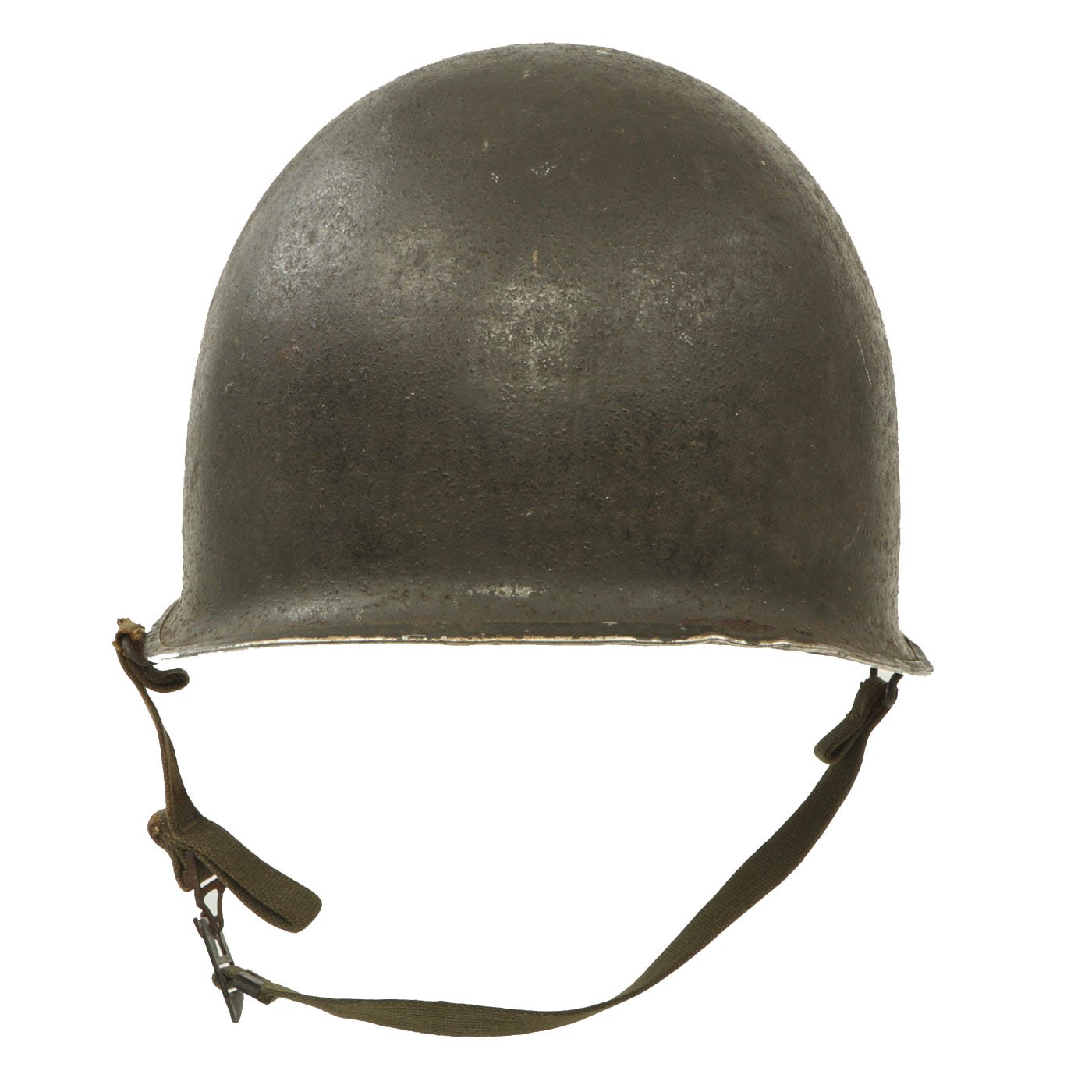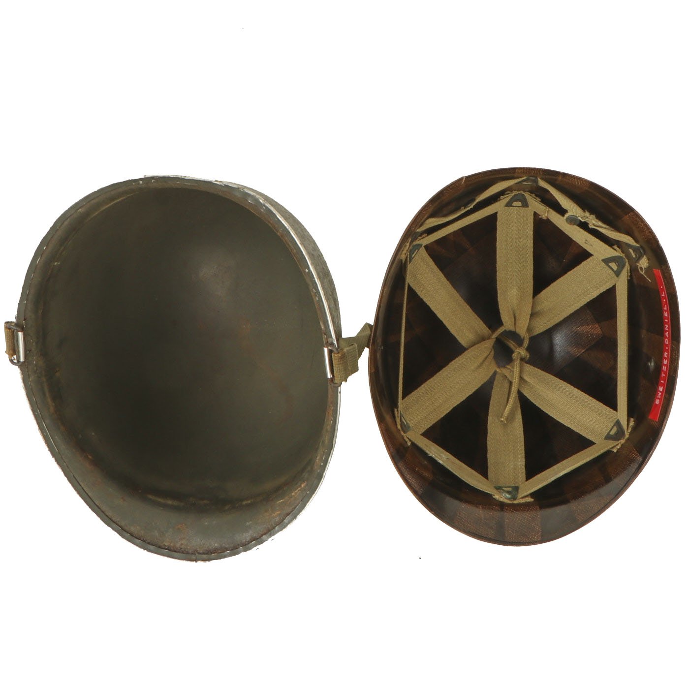 Original Item: Only One Available. This is a very nice example of a genuine WWII Front-Seam Swivel Bale M1 Helmet made by McCord Radiator, with a Westinghouse liner. The U.S. WWII M-1 helmet was only produced from 1941 to 1945. The first production batch resulted with over 323,510 M-1 helmets before the start of the American involvement in the war. This helmet is heat lot stamped 618A, which indicates the approximate manufacture date of October 1943, right when wartime production was in full swing.