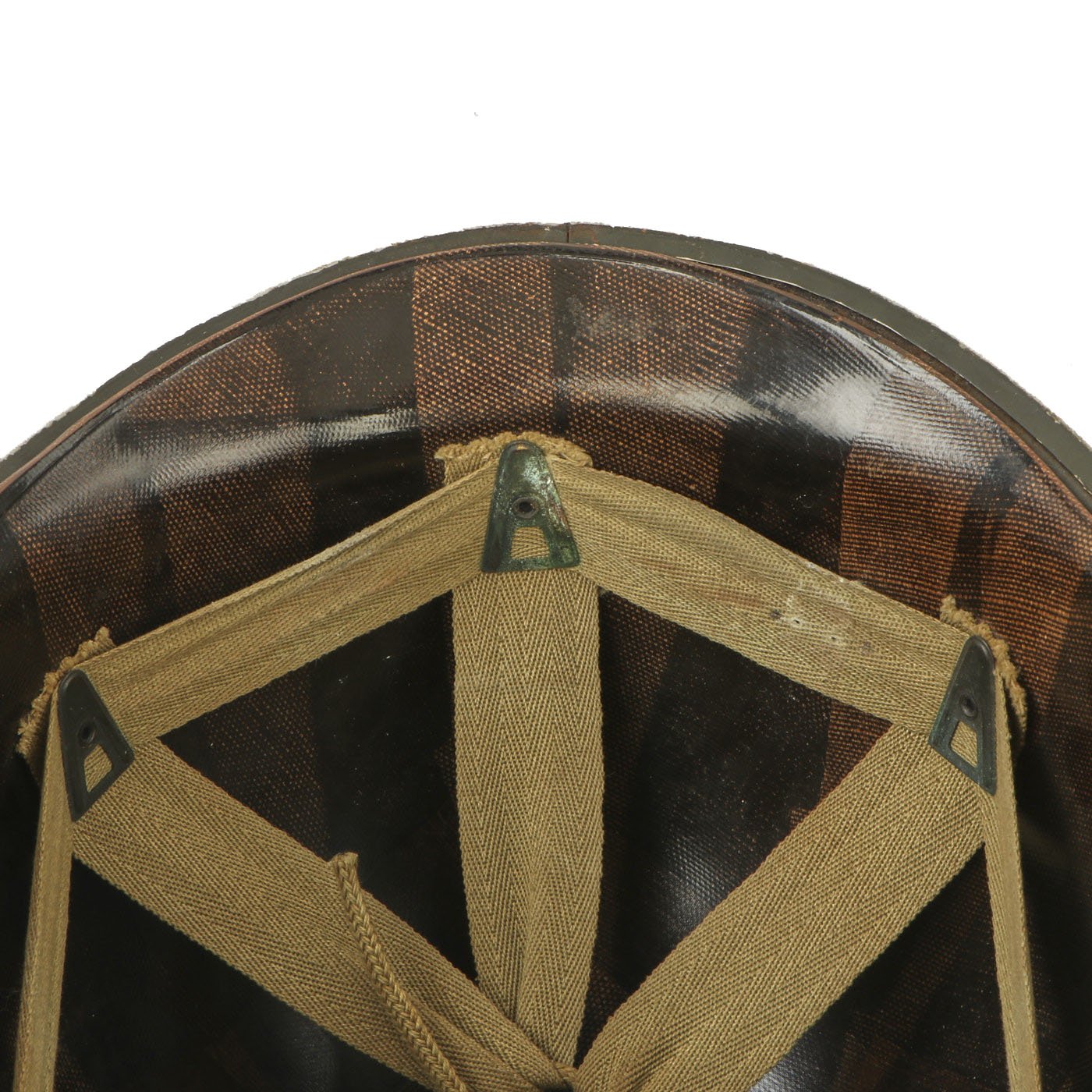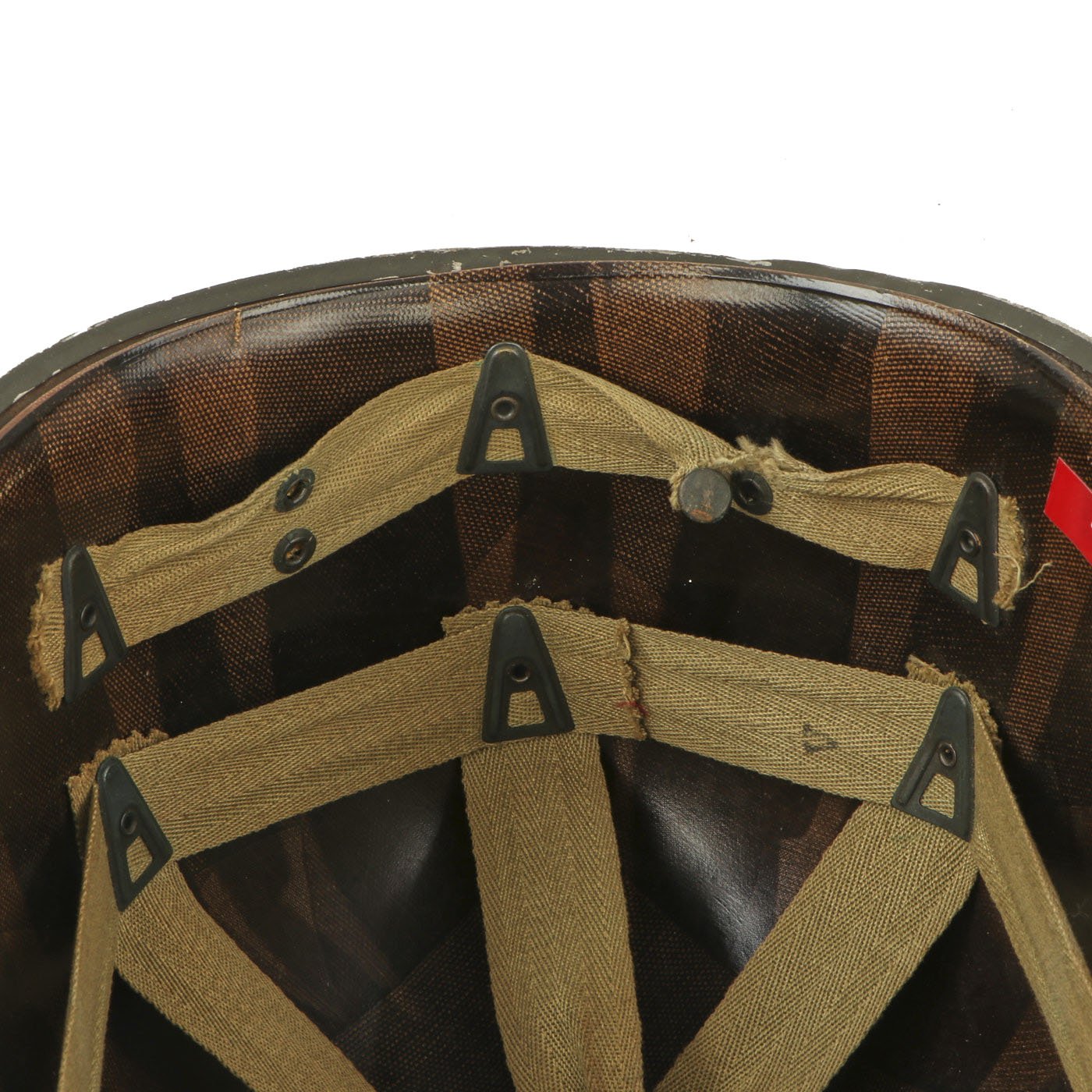 This true US WWII M-1 helmet liner be identified through the frontal eyelet hole. Other correct WWII features include cotton OD Green #3 herringbone twill (HBT) cloth suspension liner, with the webbing in very good shape. This HBT suspension is held tightly within the M-1 helmet liner by rivets and a series of triangular "A" washers. The three upper suspension bands are joined together with the correct OD green string. This way the wearer could adjust the fit. The sweatband and liner chin strap are completely missing on this liner. It also has a post war red name label, indicating it was probably in service after the war.