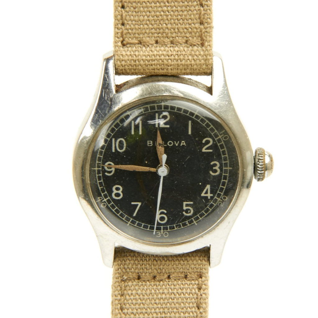 Original Item: Only One Available. This is a very nice genuine WW2 issue 1943 dated Elgin A-11 military watch. This example has been fully cleaned, tested and runs perfectly. The watch was manufactured in 1943 for Pilots and Navigators in the US Army Air Force (USAAF). Watch case is 30mm. Bulova model 10AKCSH hand-winding and hacking movement. The band is a correct high quality khaki web reproduction.