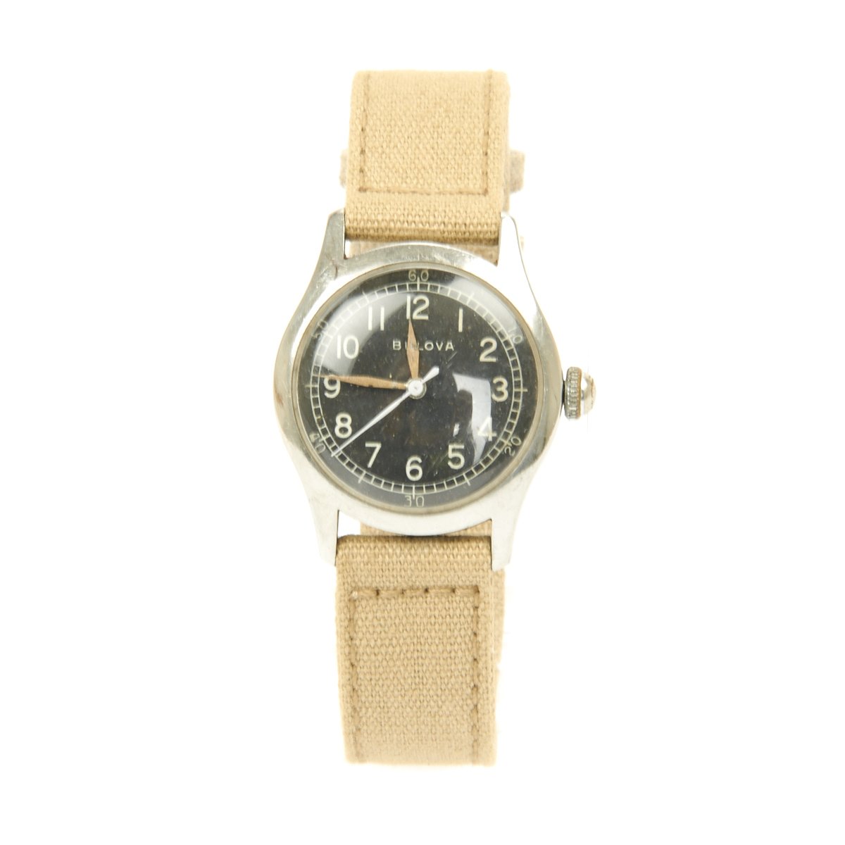 Now, the Bulova version of the A-11: this was the watch that was issued by the British as the Mark VIII, with an A. Schild SA Cal. 1238 movement (10.5'''), which while basically a Swiss movement was actually built in the US by Bulova as the cal. 10AKCSH, which also resulted in the lack of "Swiss Made" on the dial. The name can be parsed so: cal. 10AK, CS = center sweep, H=hack.