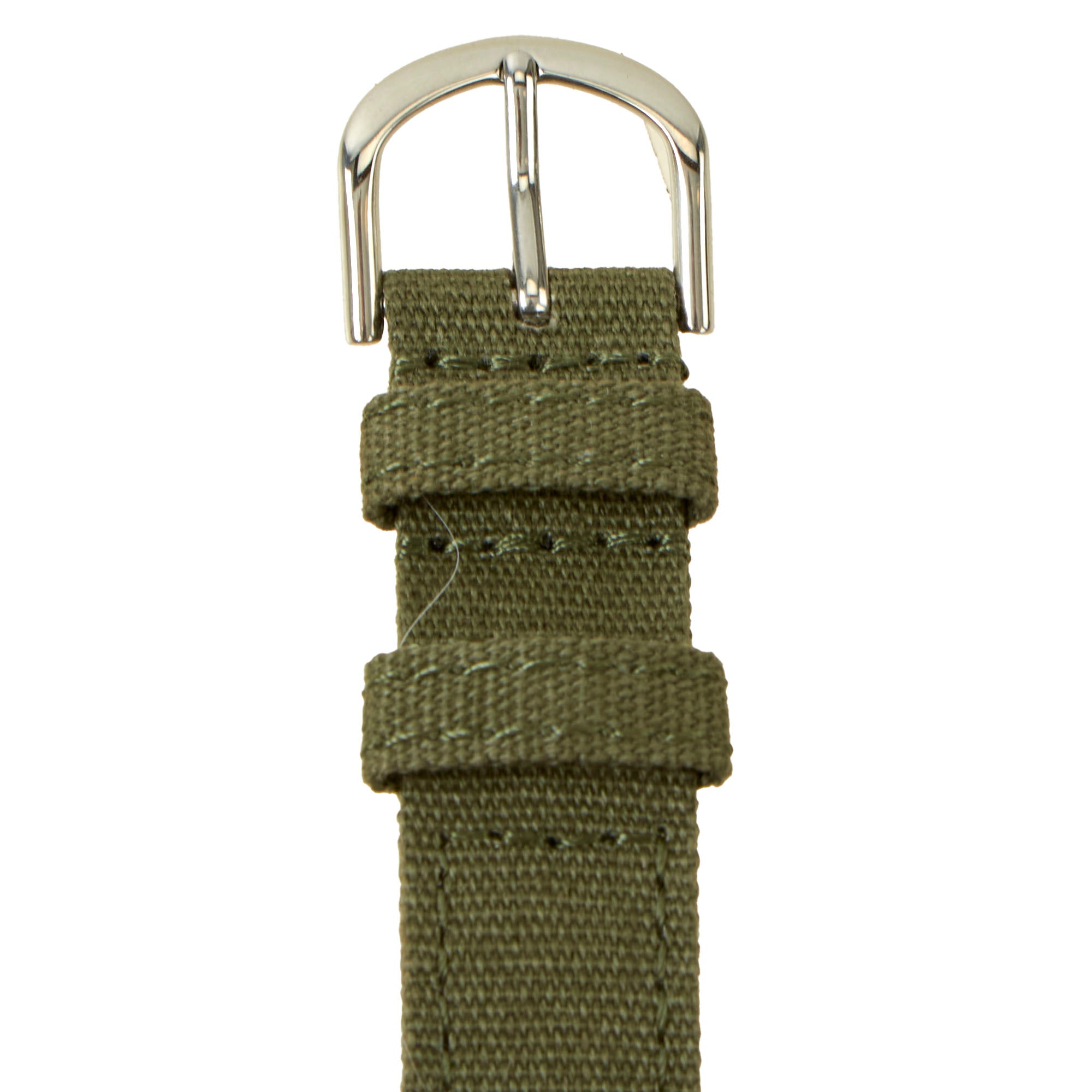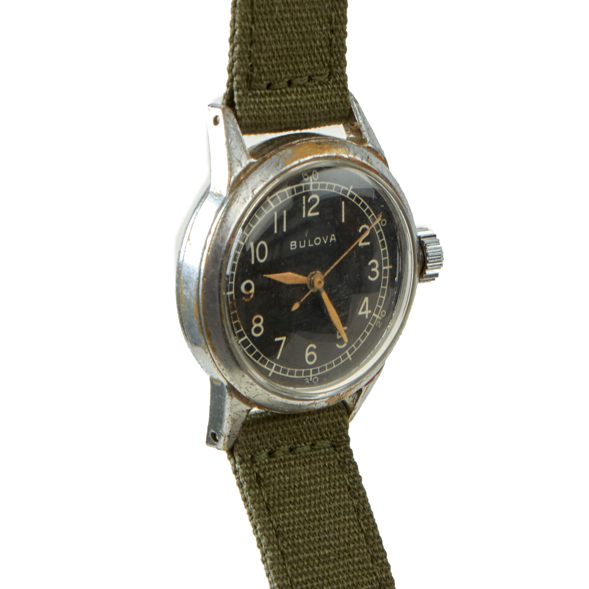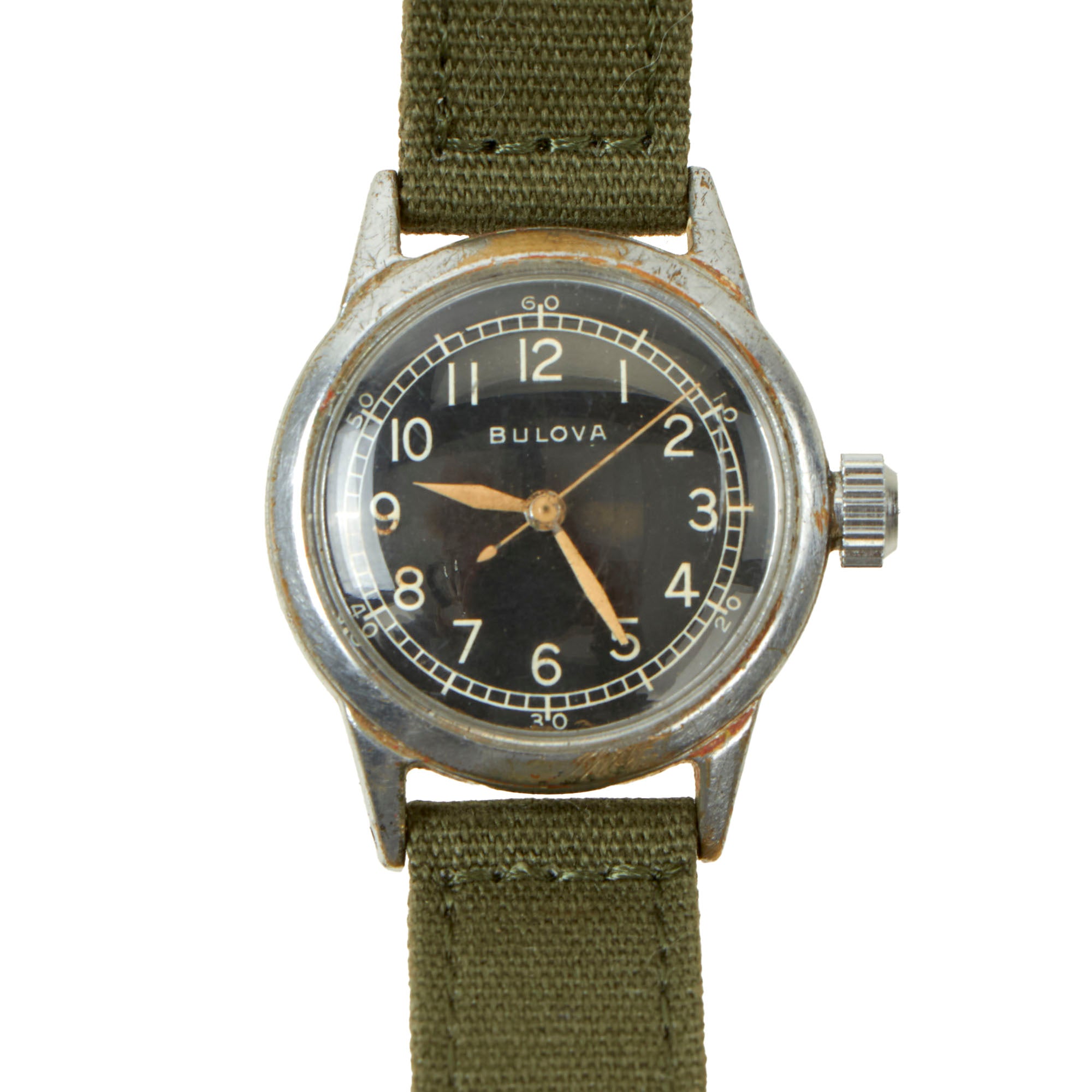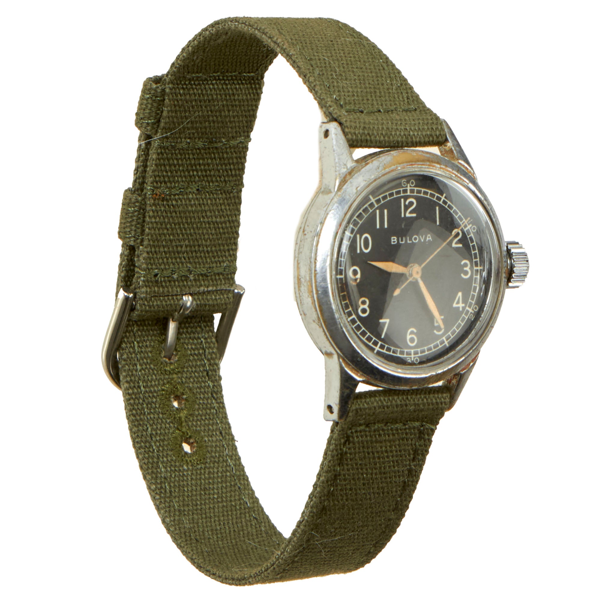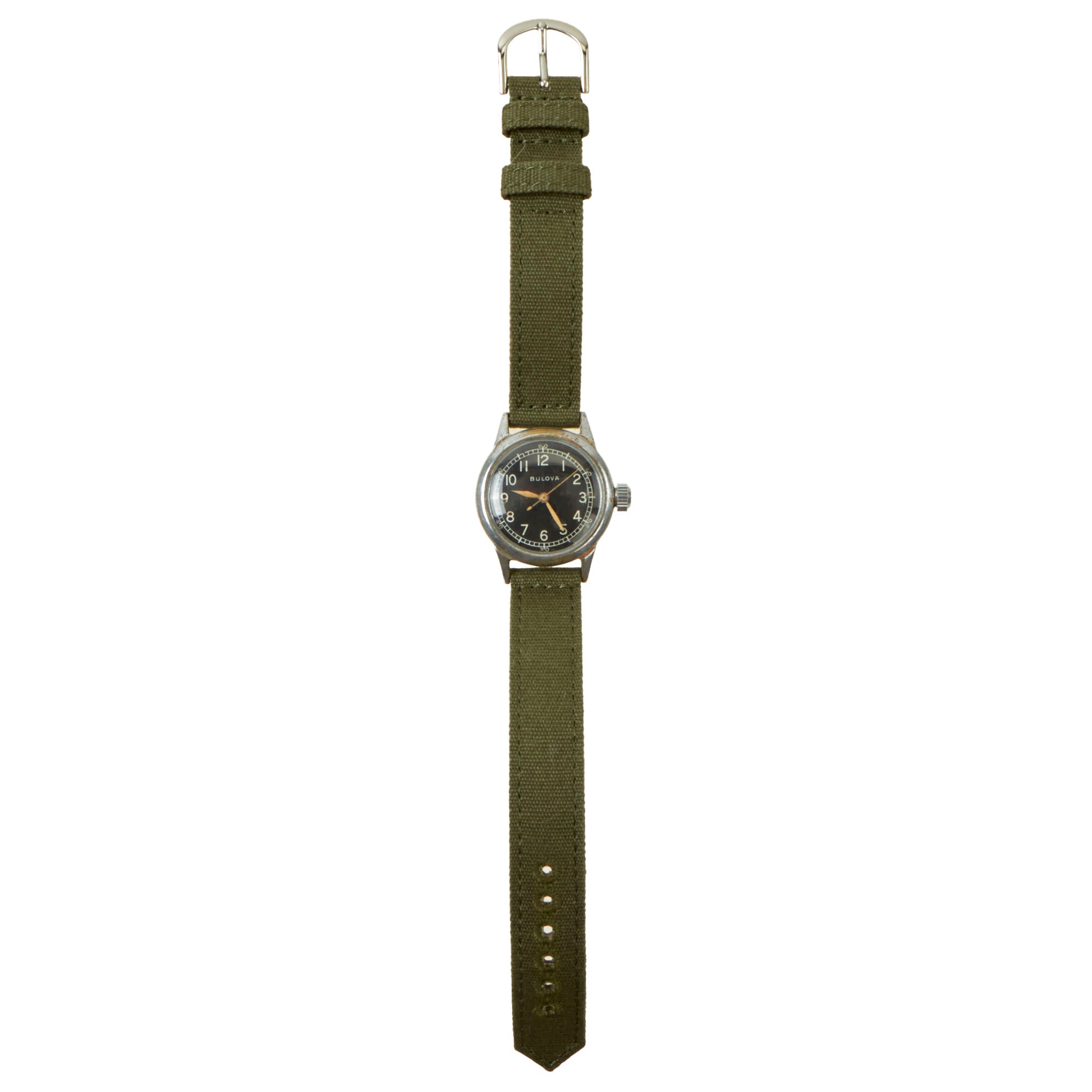 This is a very nice genuine WWII-issue 1943 Dated Bulova A-11 military watch. This example has been fully cleaned, tested and runs perfectly. The watch was manufactured in 1943 for Pilots and Navigators in the US Army Air Force (USAAF). Watch case is 30mm. Bulova model 10AK/CSH hand-winding and hacking movement, which allowed the movement to be stopped for "watch synchronization". The band is a correct high quality khaki web reproduction.