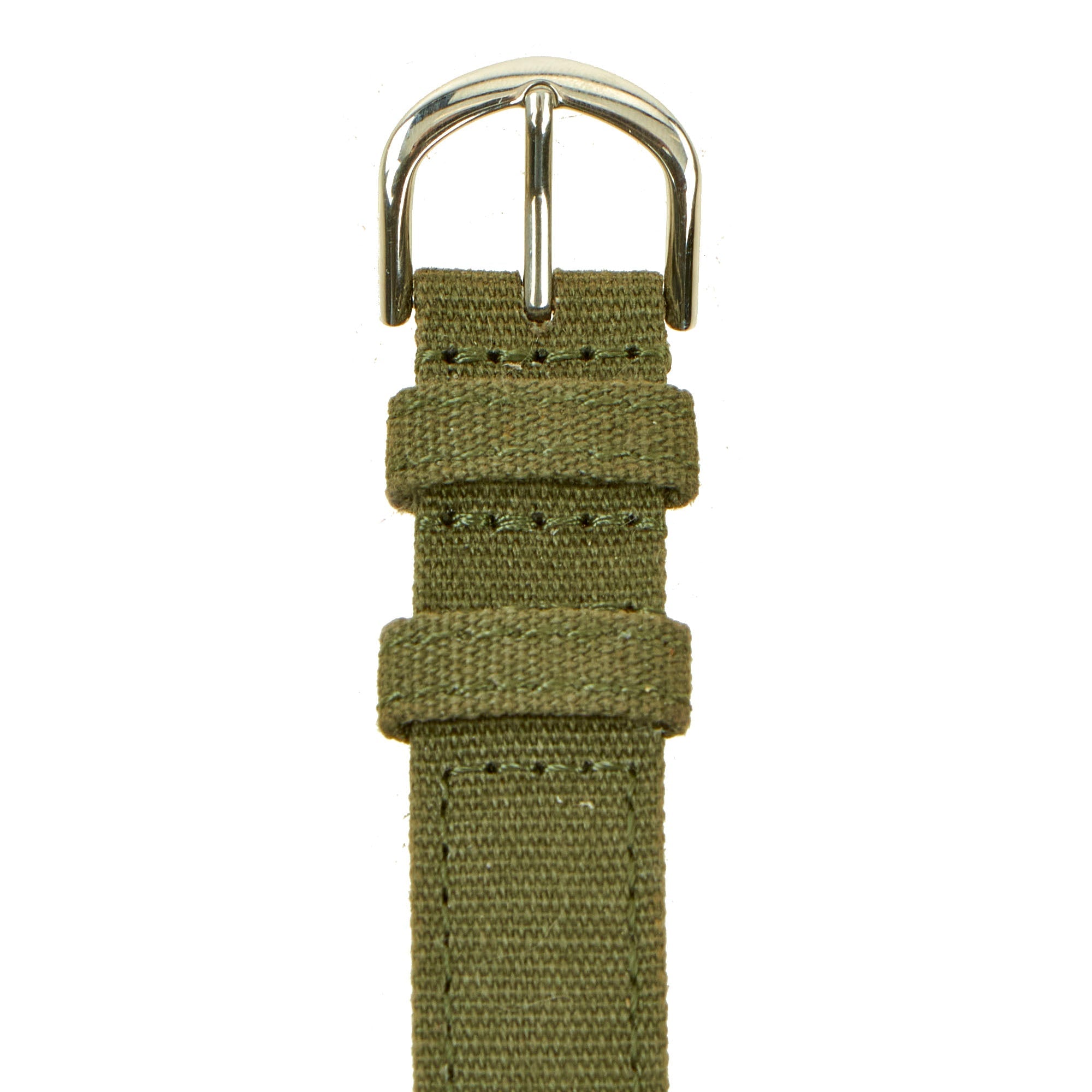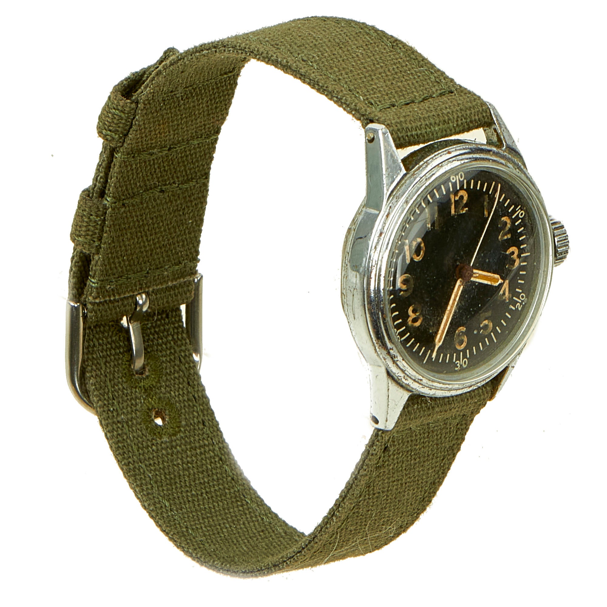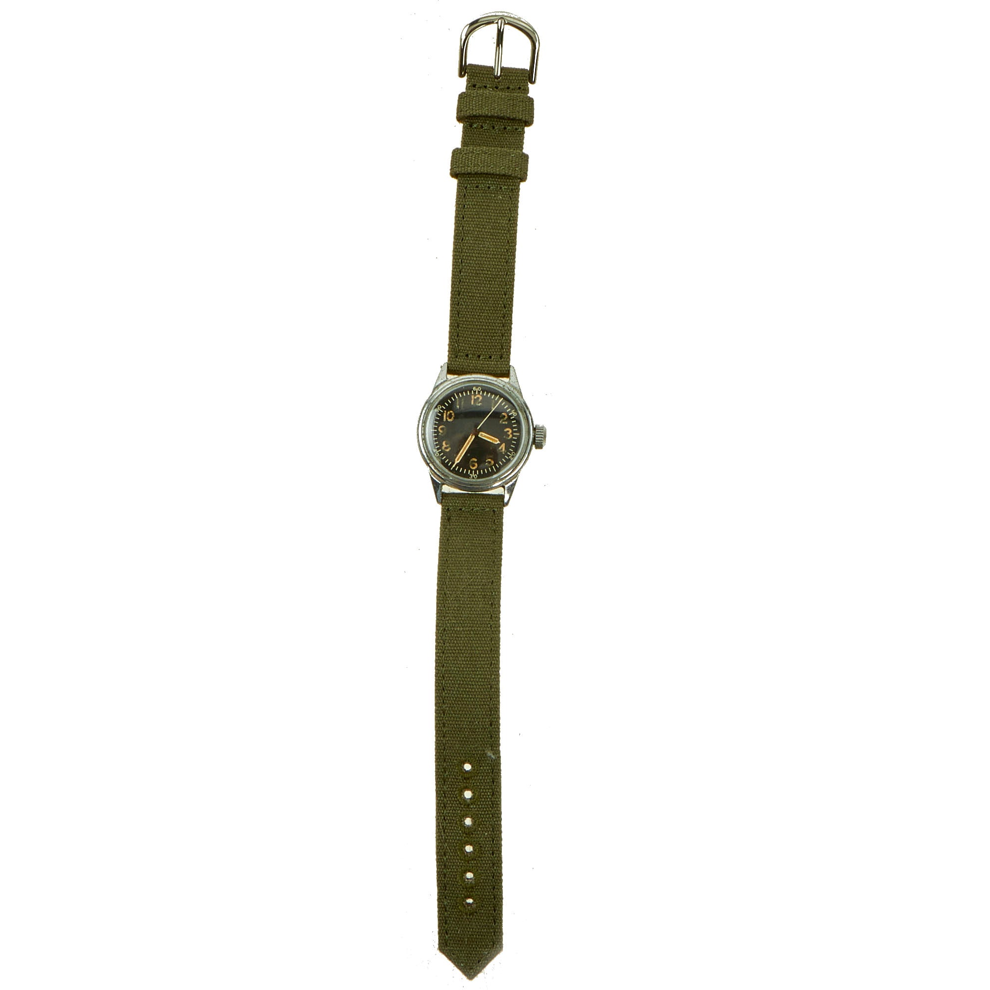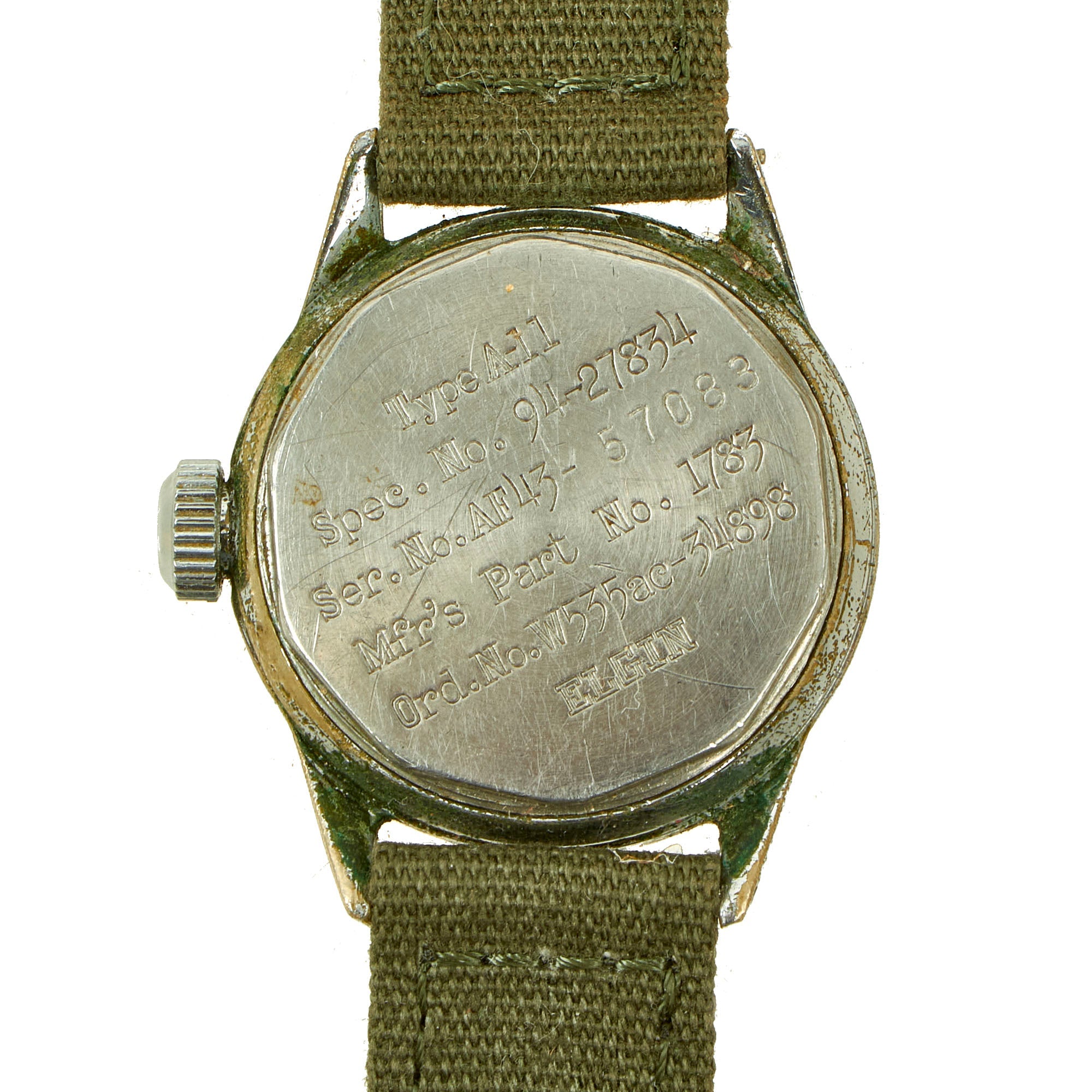 Original Item: Only One Available. This is a very good condition genuine WW2 issue 1943 dated Elgin A-11 military watch. This example has been fully cleaned, tested and runs perfectly. The watch was manufactured in 1943 for Pilots and Navigators in the US Army Air Force (USAAF). Watch case is 30mm. It features a hand-winding and hacking movement, which allowed the movement to be stopped for "watch synchronization". The band is a correct high quality OD Green web reproduction.