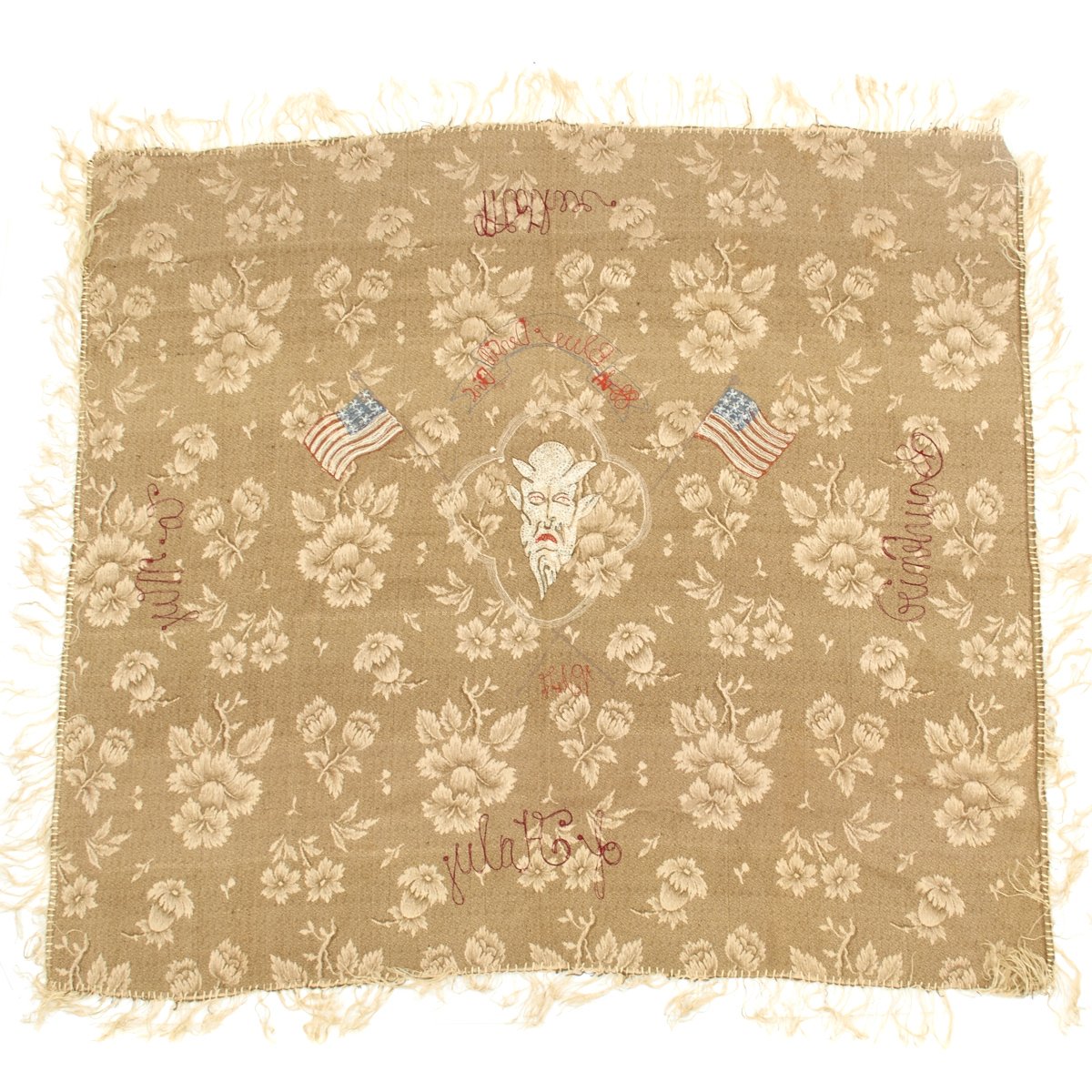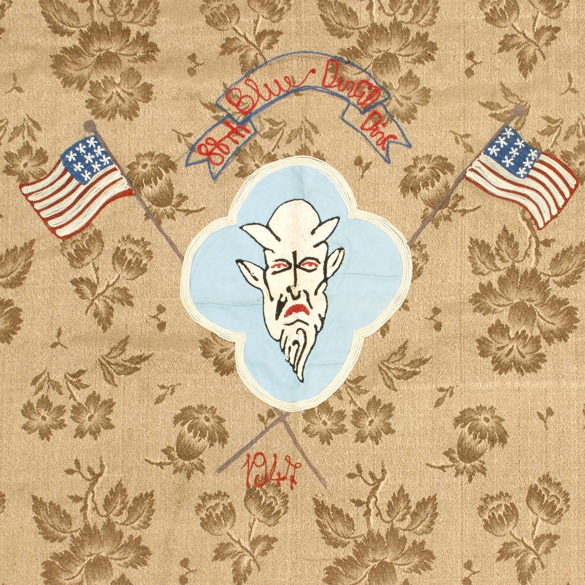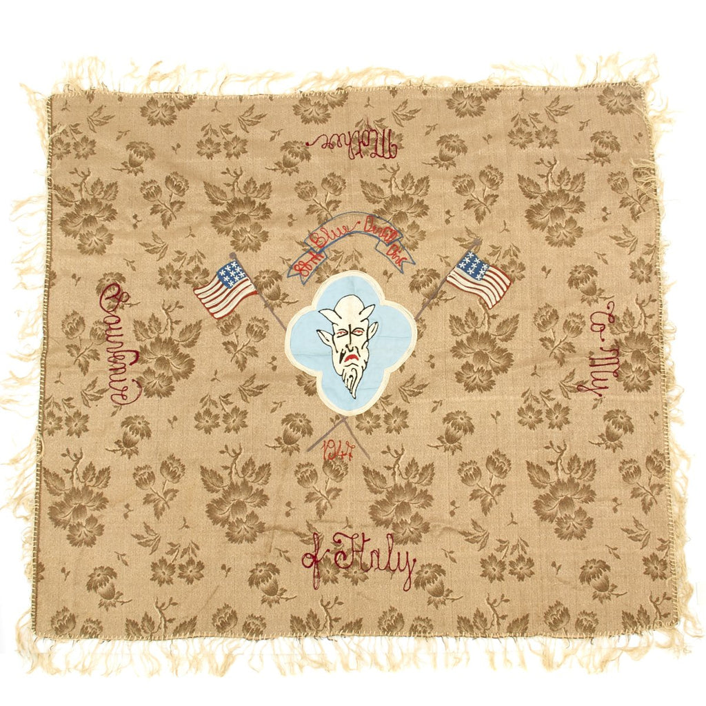 Original Item: Only One Available. This is an exceptional heavily embroidered handmade custom tapestry of the 88th Infantry Division also known as the Fighting Blue Devils. This is an Italian made blanket, table covering, couch throw etc, that was handmade in Italy in 1944 after the 88th deployed there in early 1944. It features a blue devil to the center and reads: