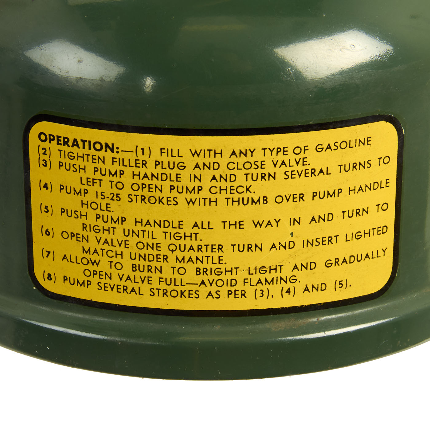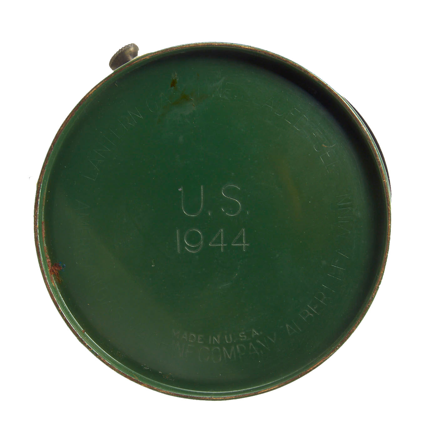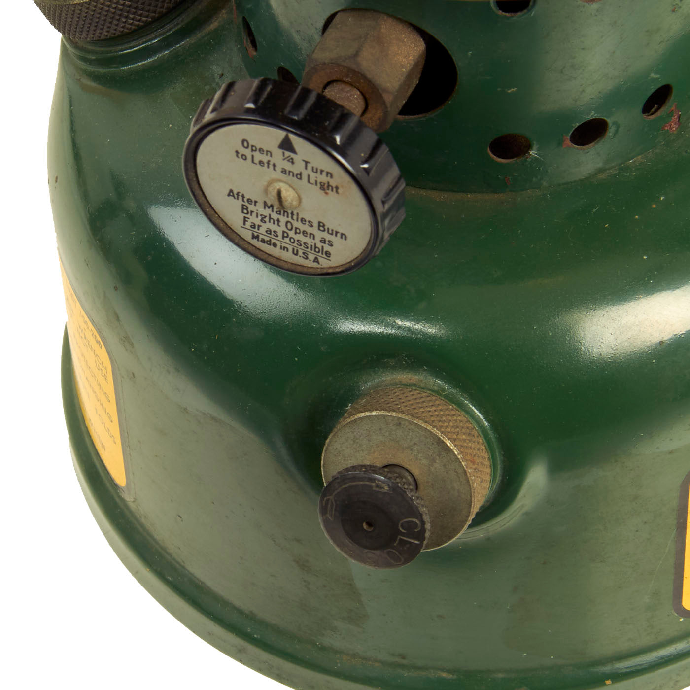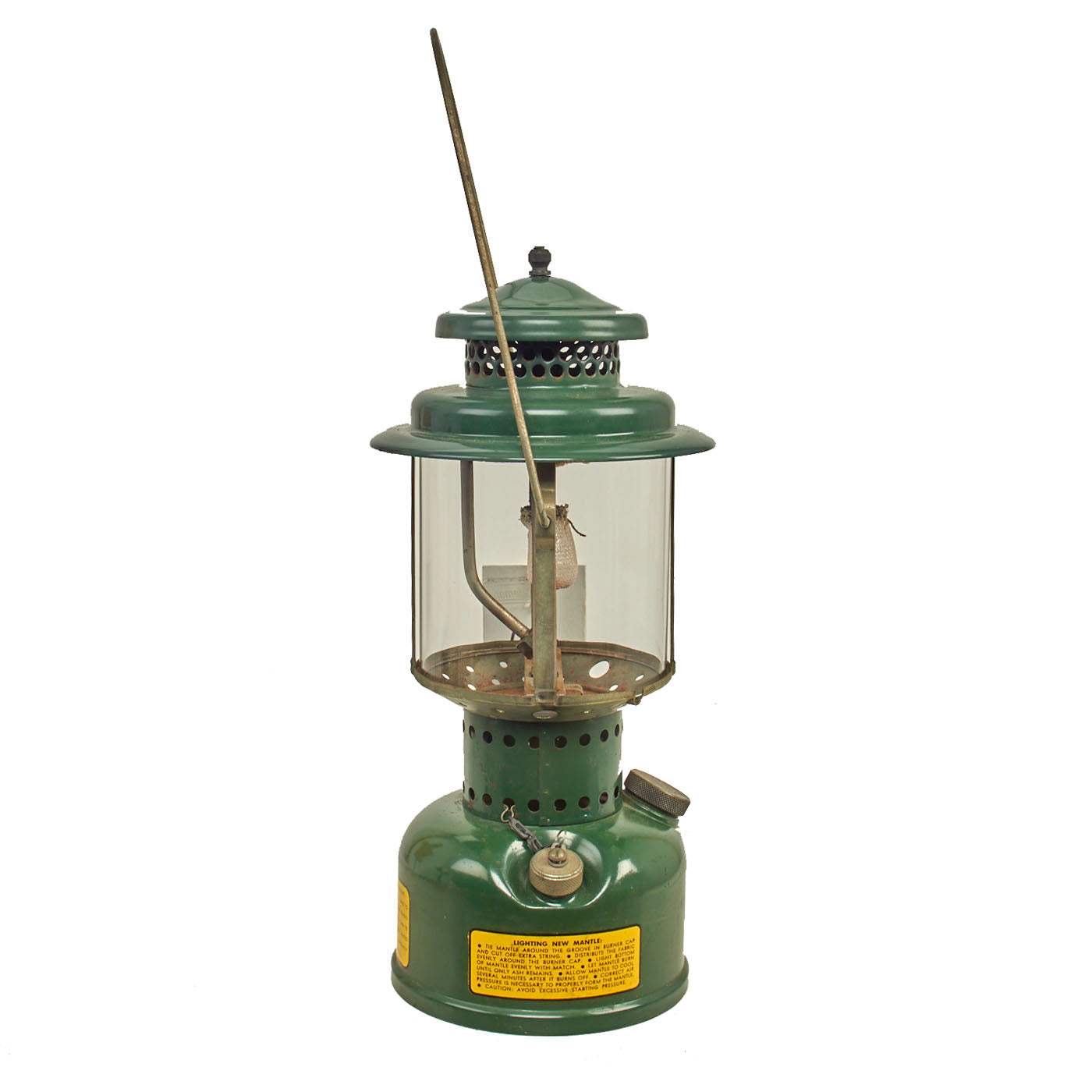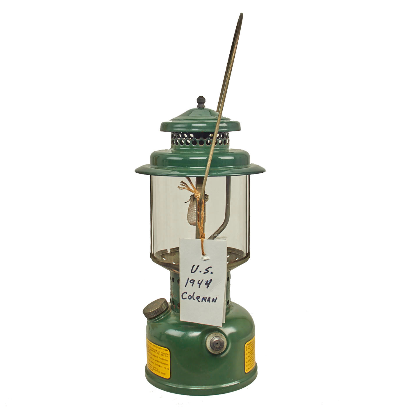 This 252 Milspec lantern has a single mantle and is dated U.S. / 1944 on the bottom. "White gasoline" use was recommended, but this lantern was special as it was the first that could burn anything that counted as gas. Designed by Coleman in conjunction with Aladdin and the American Gas Machine Company under instruction from the Department of War, these lanterns were built exclusively for military use from 1943 until World War II ended in 1945. This demand brought several unique features to the 252, such as a built-in compartment for spare parts (none present), a chained-on funnel and filler cap, and twin curved air tubes. Unfortunately the funnel is missing. The condition is really good, though it does have a modern Coleman brand replacement globe that someone appears to scratch off the “Made In China” marking on. All aspects of the lantern are original American made components except for the globe.