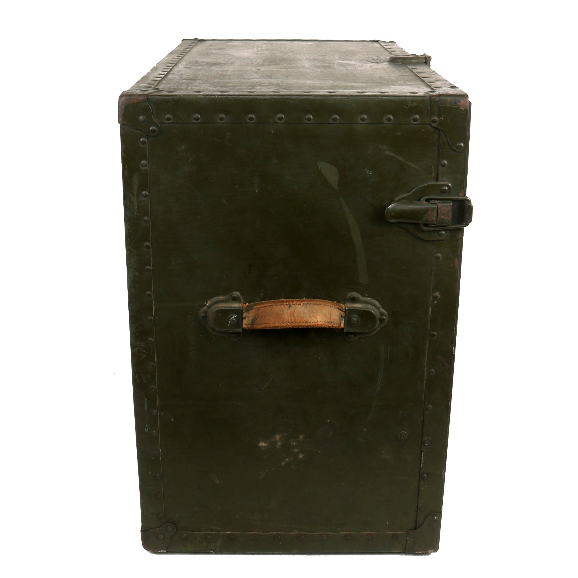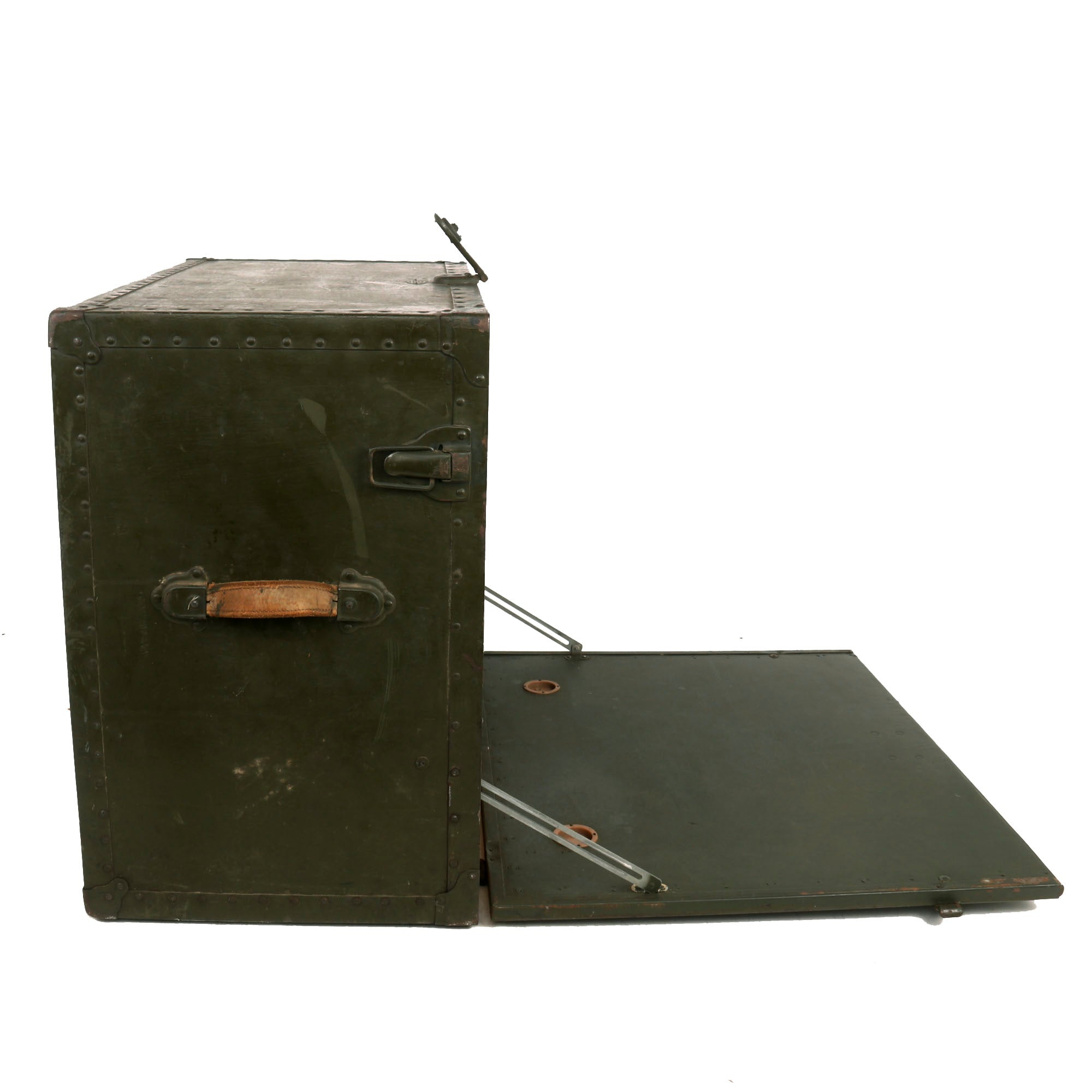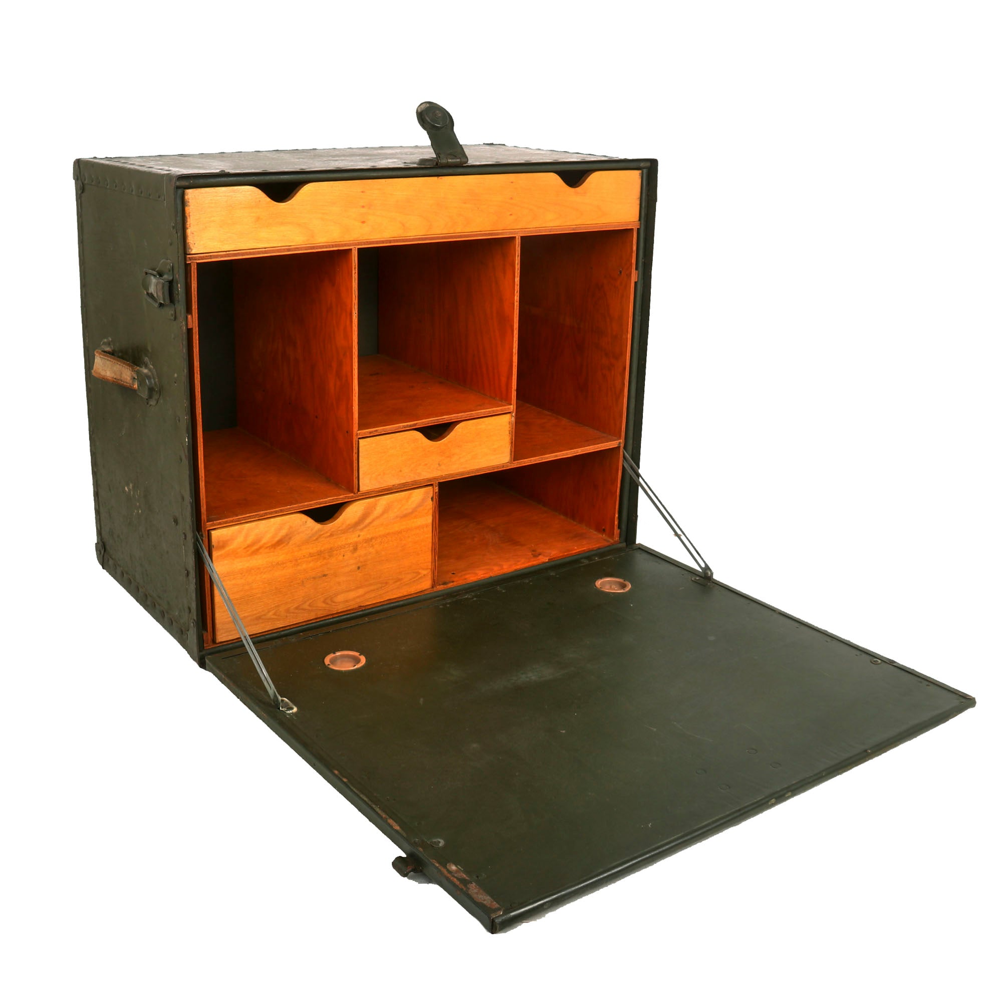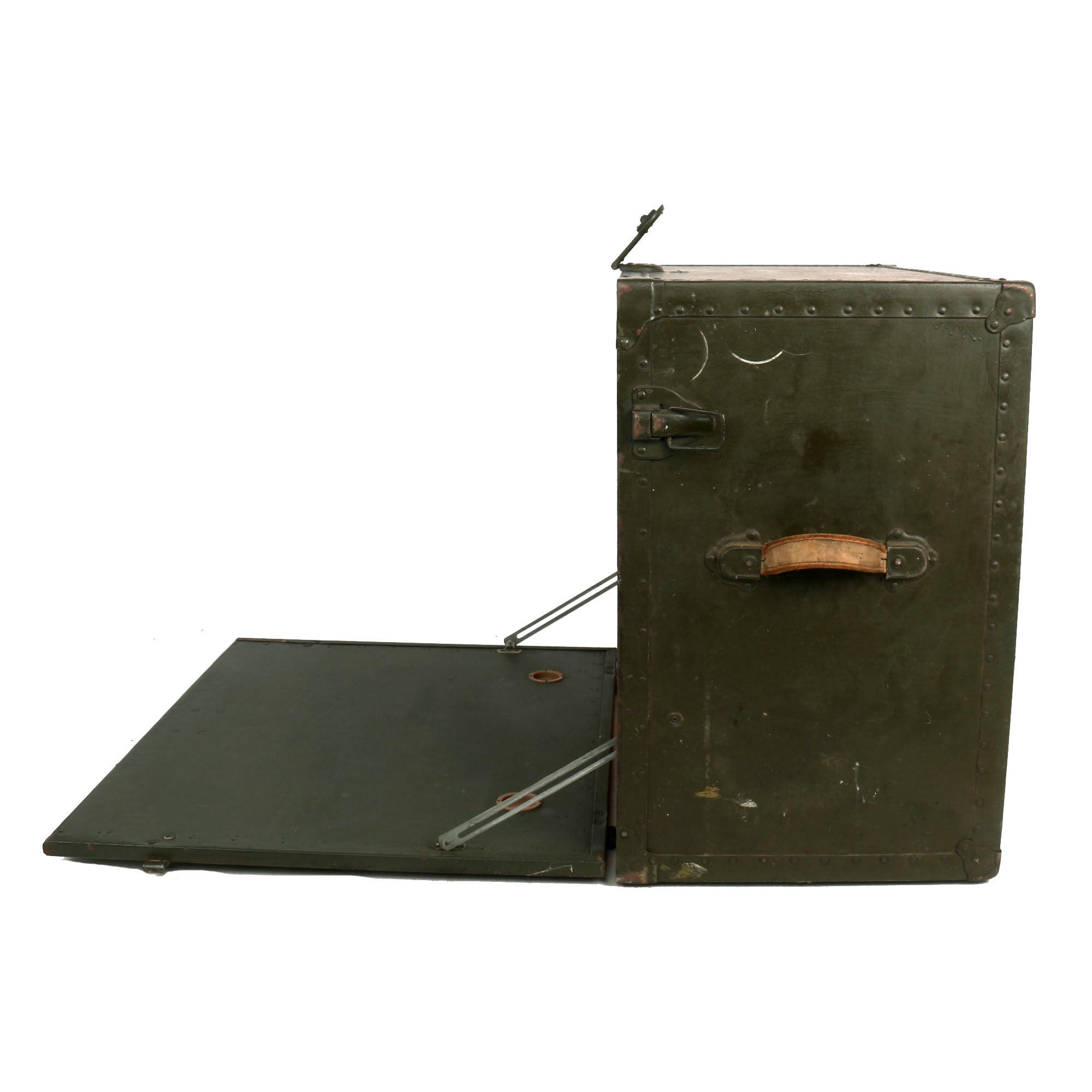 Original Item: Only One Available. This is a fantastic example of a Large WWII Company Officer’s Field Desk. This table top fold out desk still bears original paint and has both leather side handles still intact, as well as the lock on the top, though we do not have the key. The two closure latches on the outside are fully functional, and both hinges on the "top" work as well.