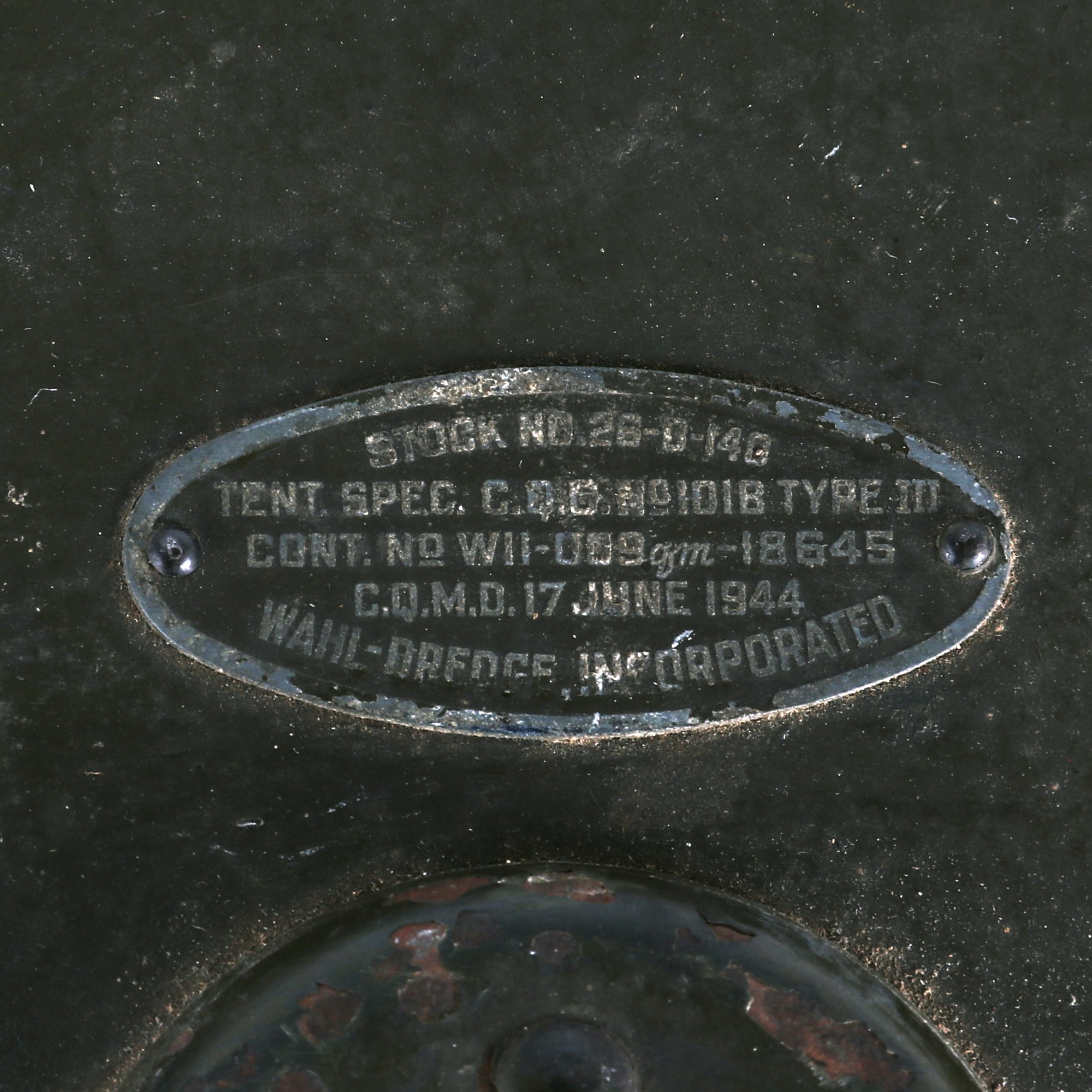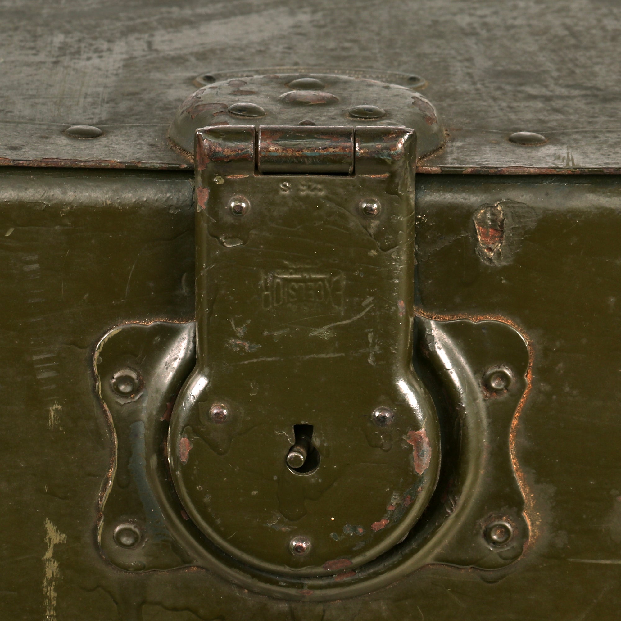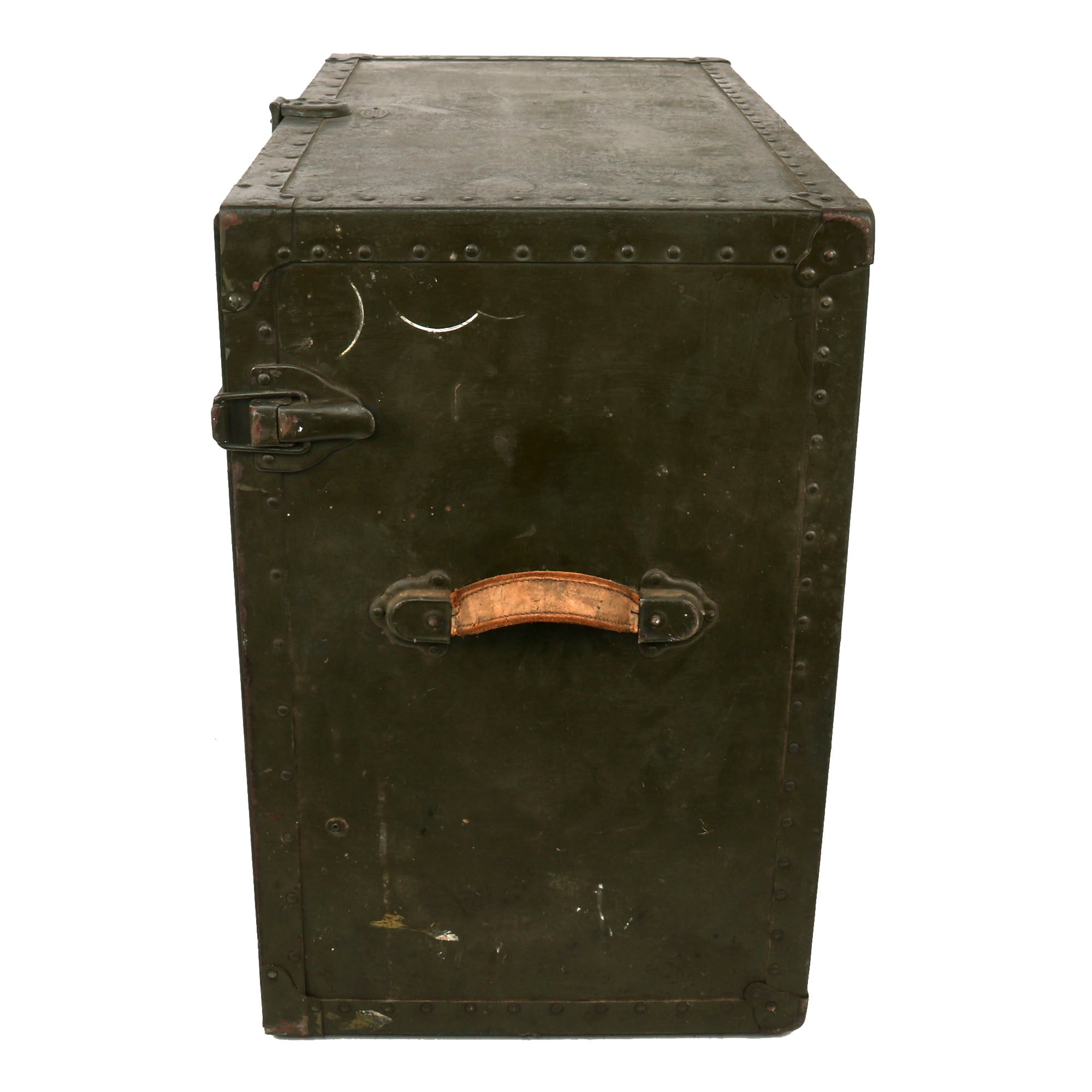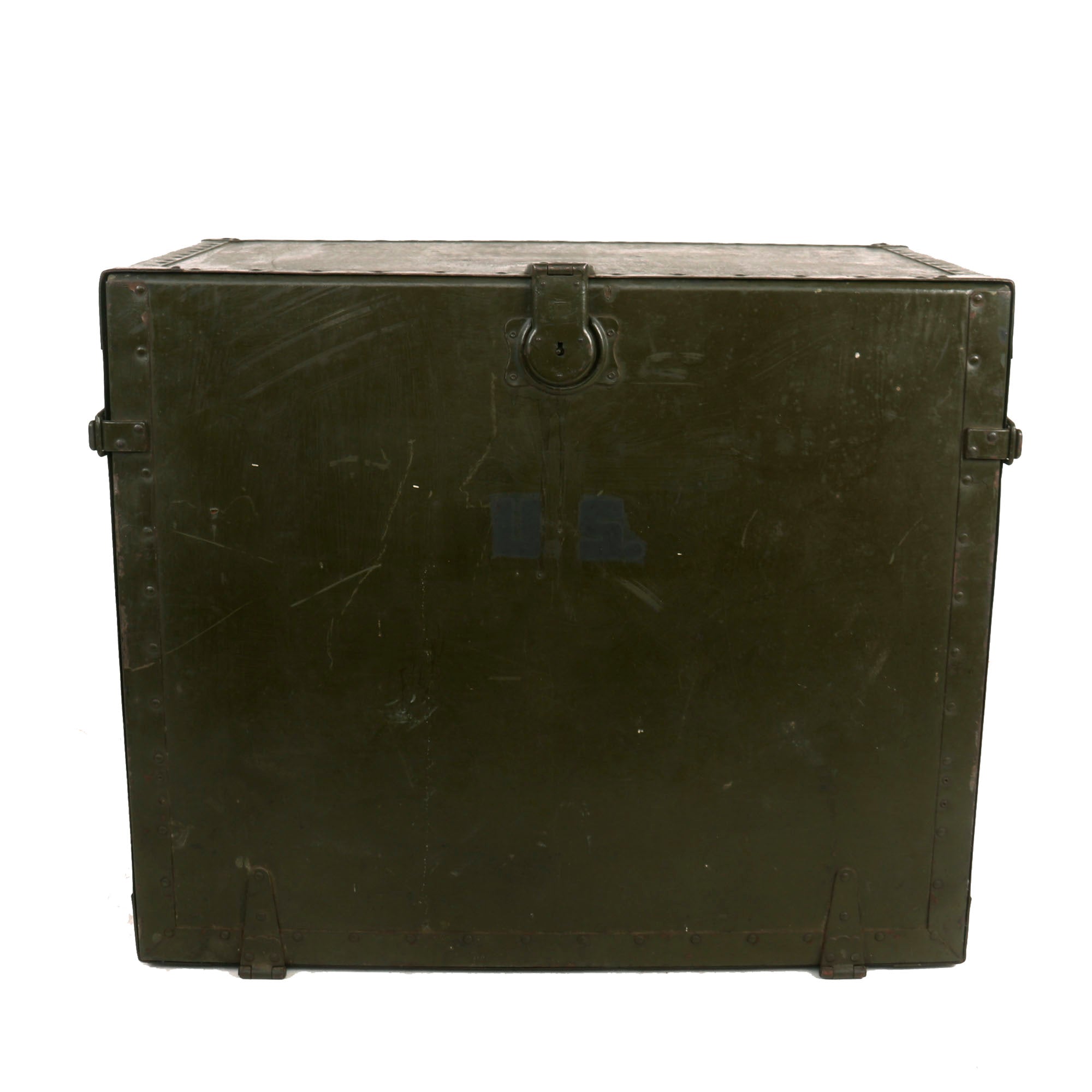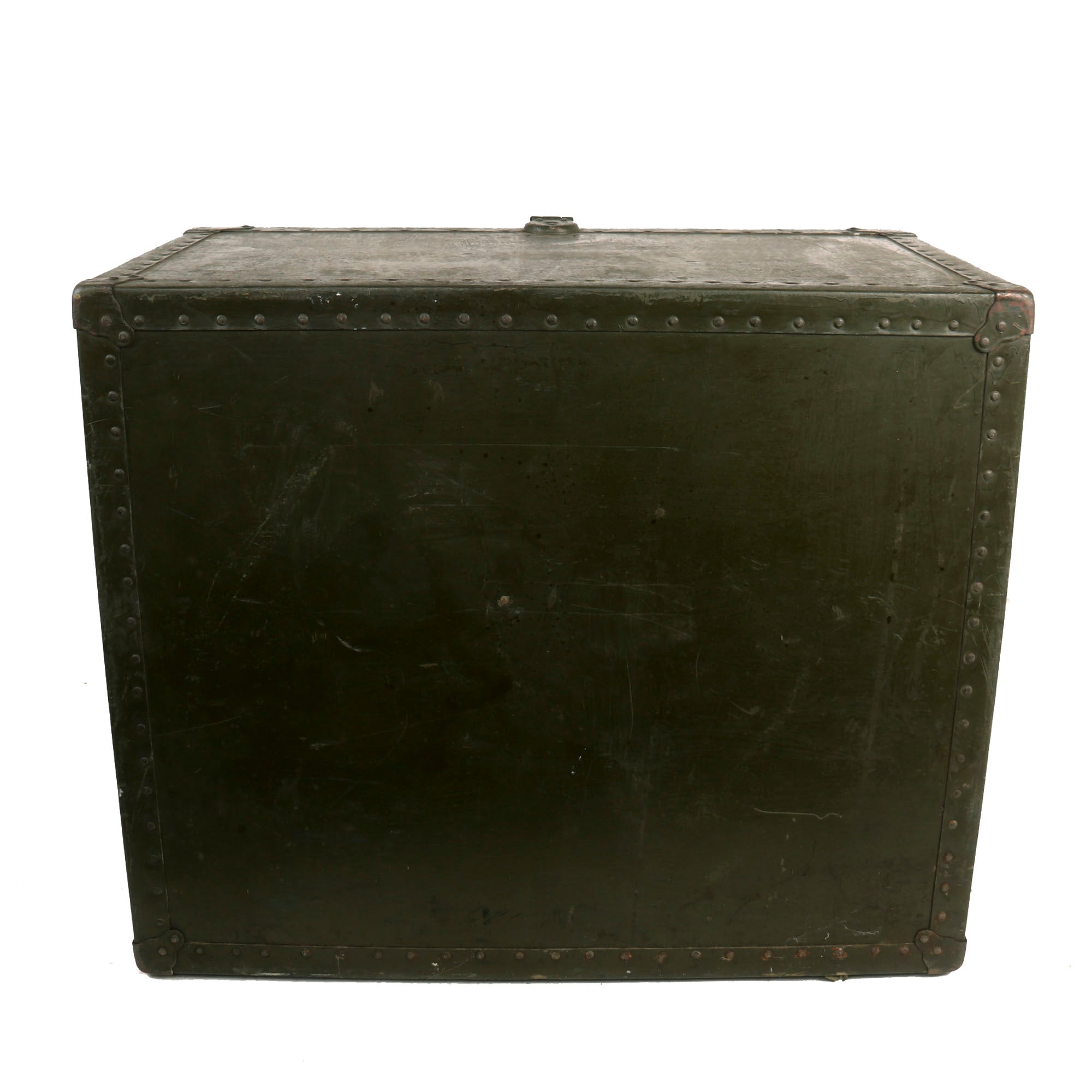 Original Item: Only One Available. This is a fantastic example of a Large WWII Company Officer’s Field Desk. This table top fold out desk still bears original paint and has both leather side handles still intact, as well as the lock on the top, though we do not have the key. The two closure latches on the outside are fully functional, and both hinges on the "top" work as well.