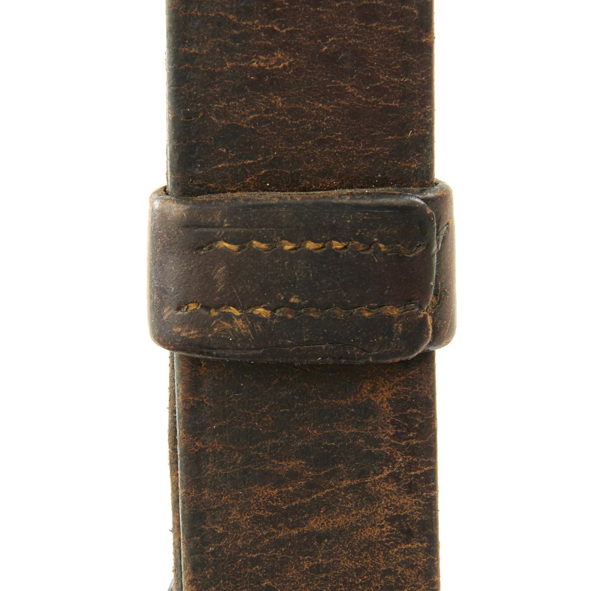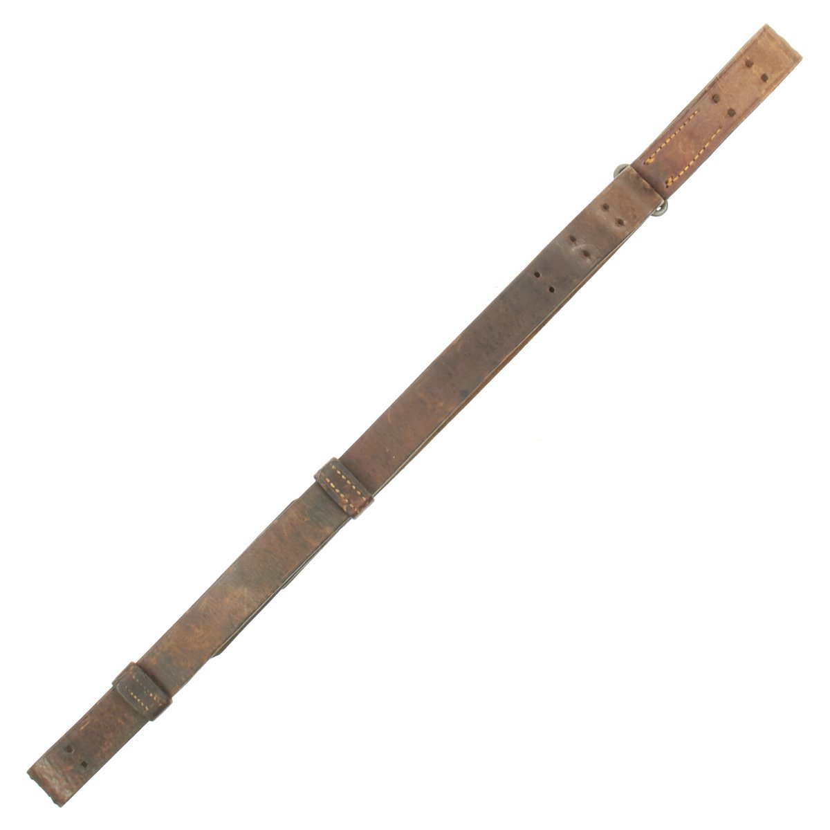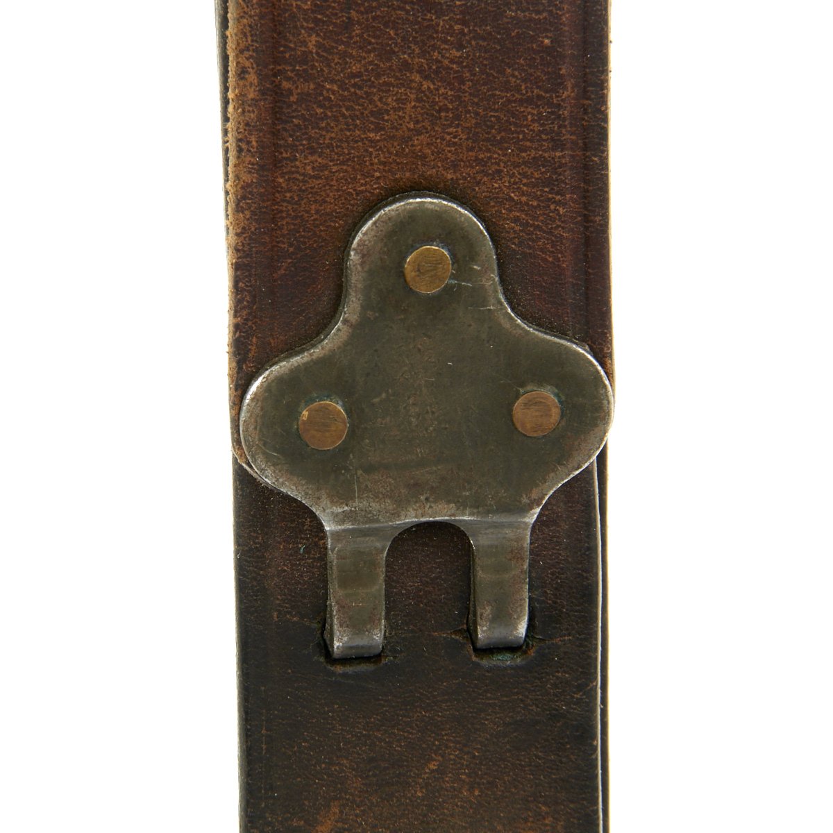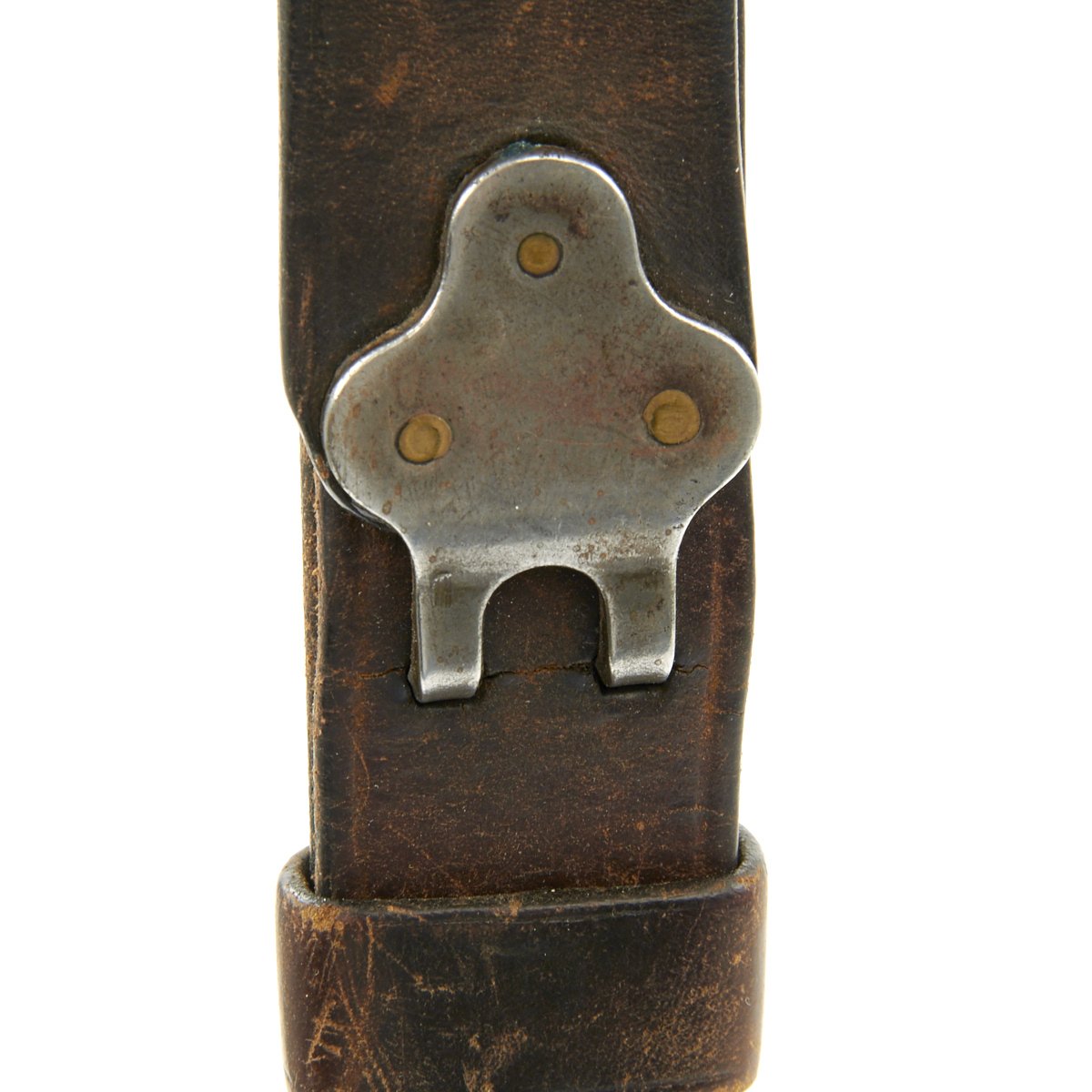 The leather is in good condition, though it has darkened over time, and could use conditioning/oiling. The heavy stitching around steel loop and on both leather keeper loops is still intact. It still has proper adjustment holes and both correct WW2 pattern steel hooks (fittings) with some of the original finish present. There is some cracking, but overall it is completely functional and serviceable. An excellent upgrade for any U.S. issue WW2 rifle.