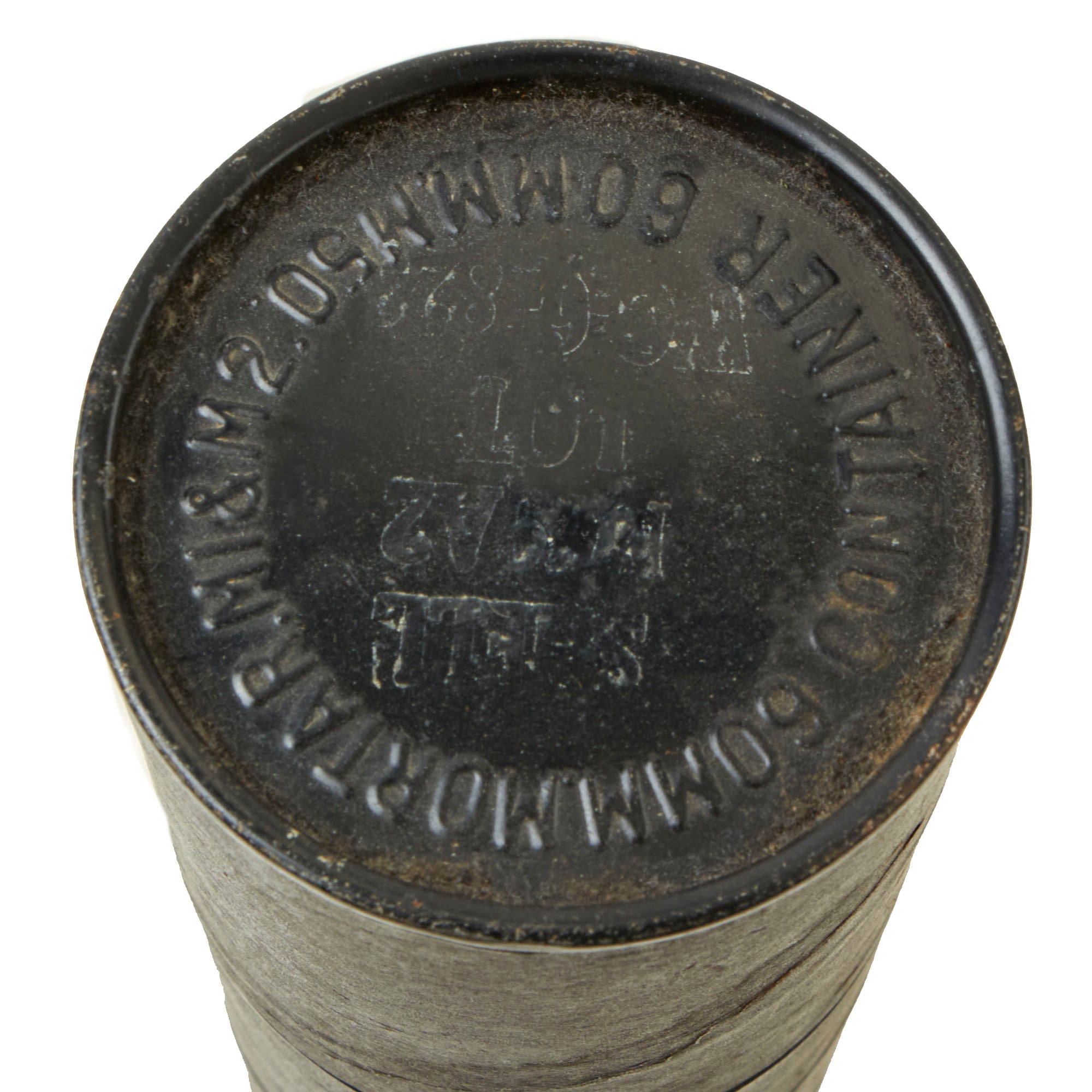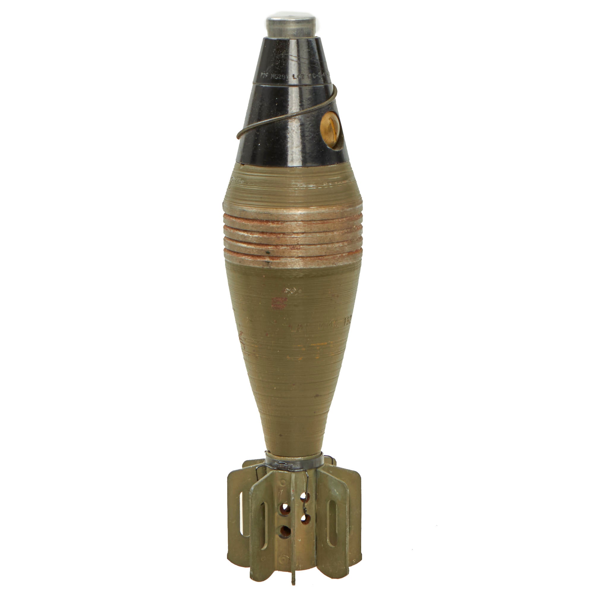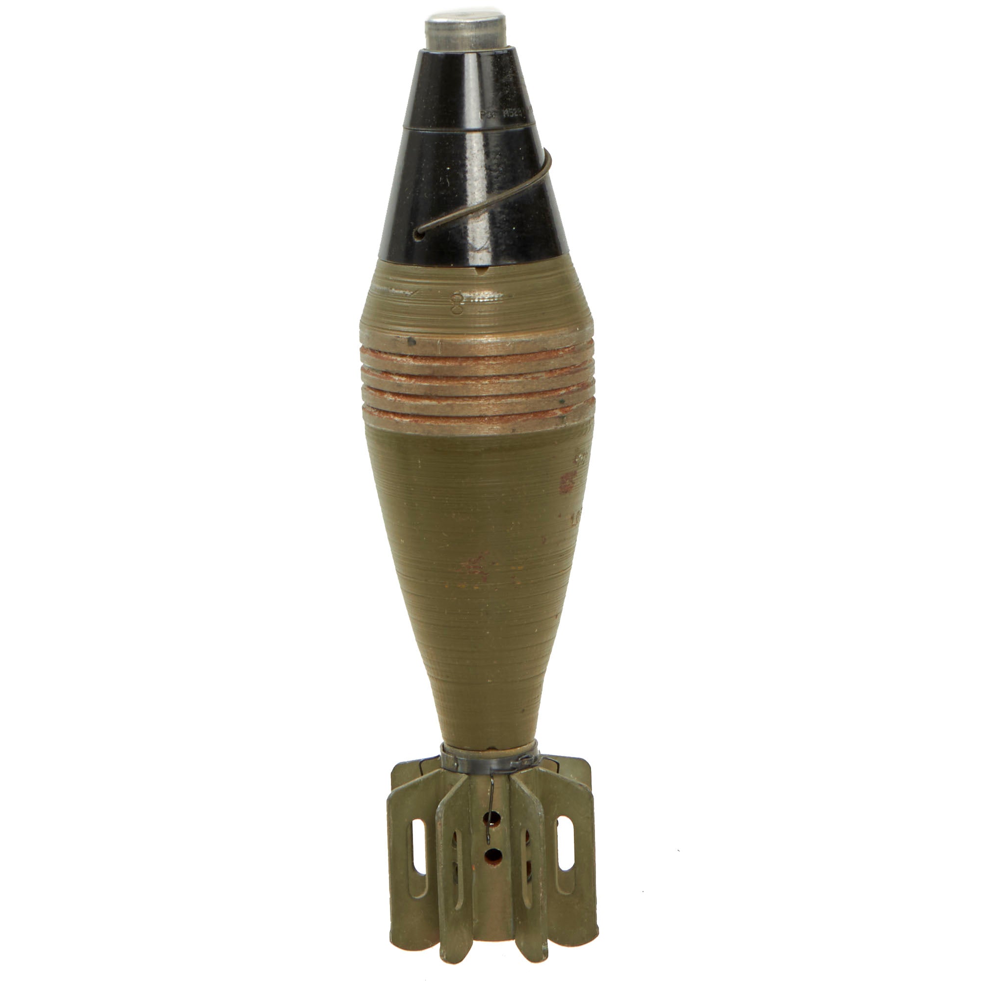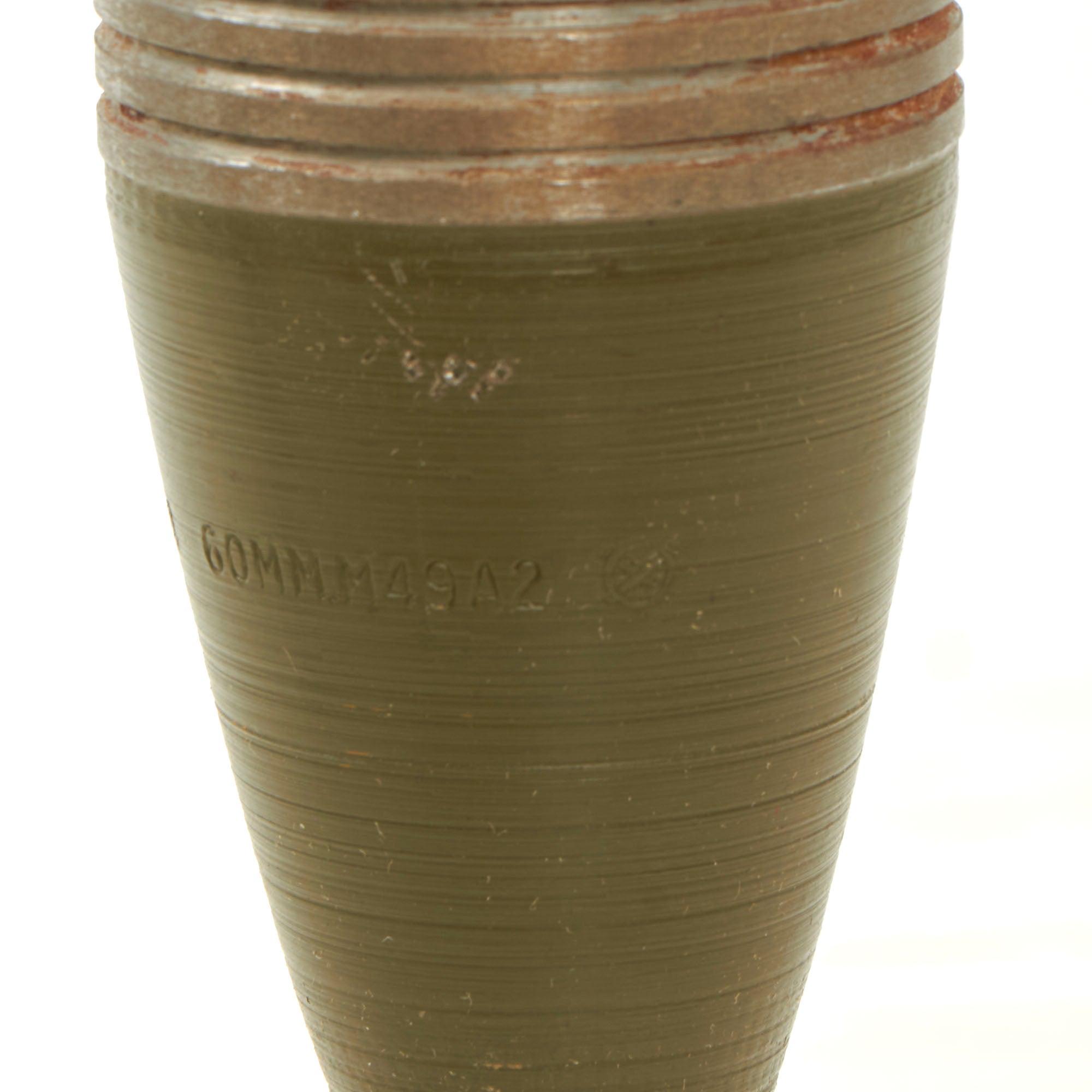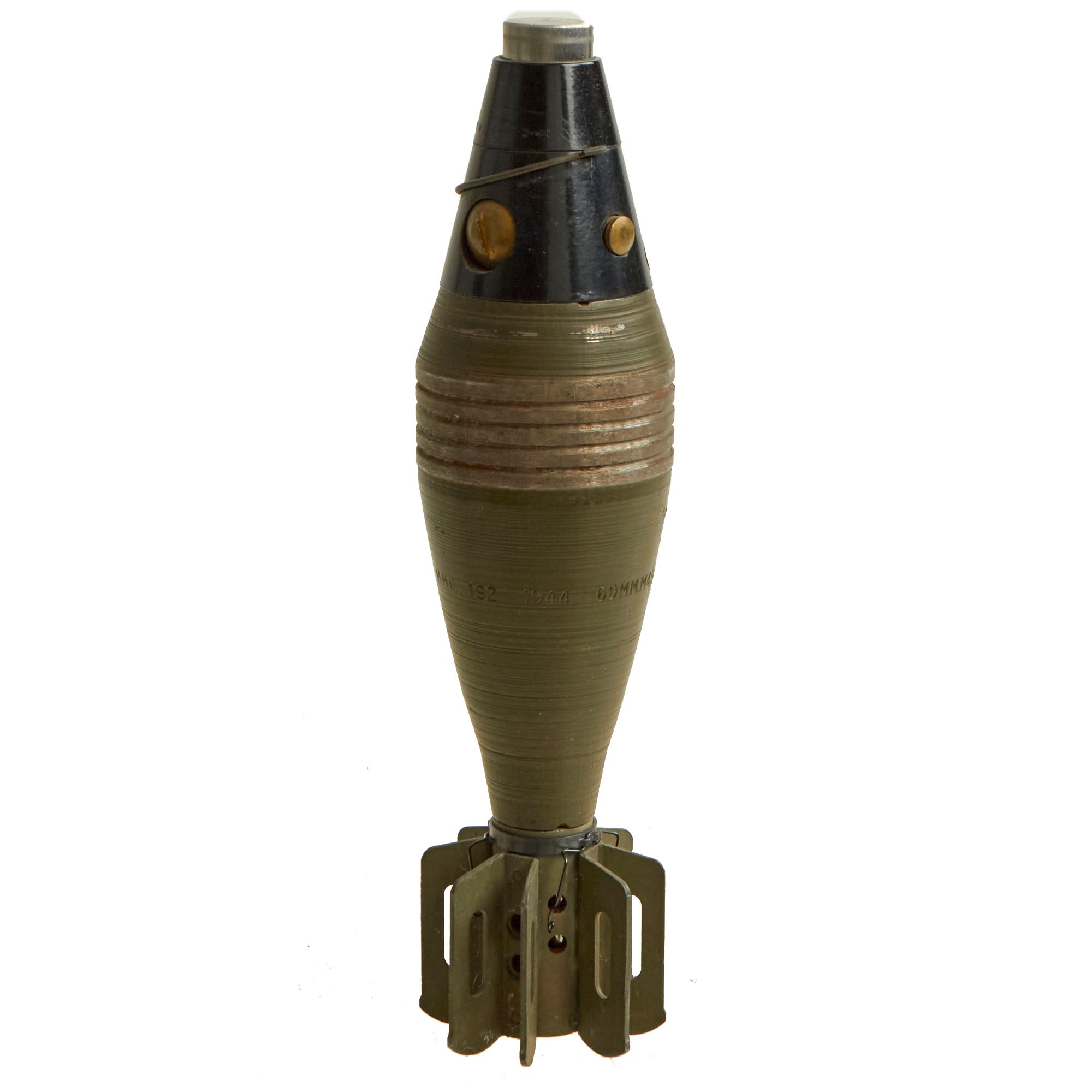 This is a hard to find WWII M49A2 Deactivated Mortar Round, for the U.S. 60mm M2 Mortar. The M49A2 was a High explosive (HE) round, equipped with a bakelite housed point detonating fuse PDF M52B1., which is dated 1944. It was an explosive shell used against infantry and other light area targets. It has a minimum range of 200 yards when fired without a boosting charge at a 70° angle and a maximum range of 2017 yards when fired with four boosting charges at a 45° angle.