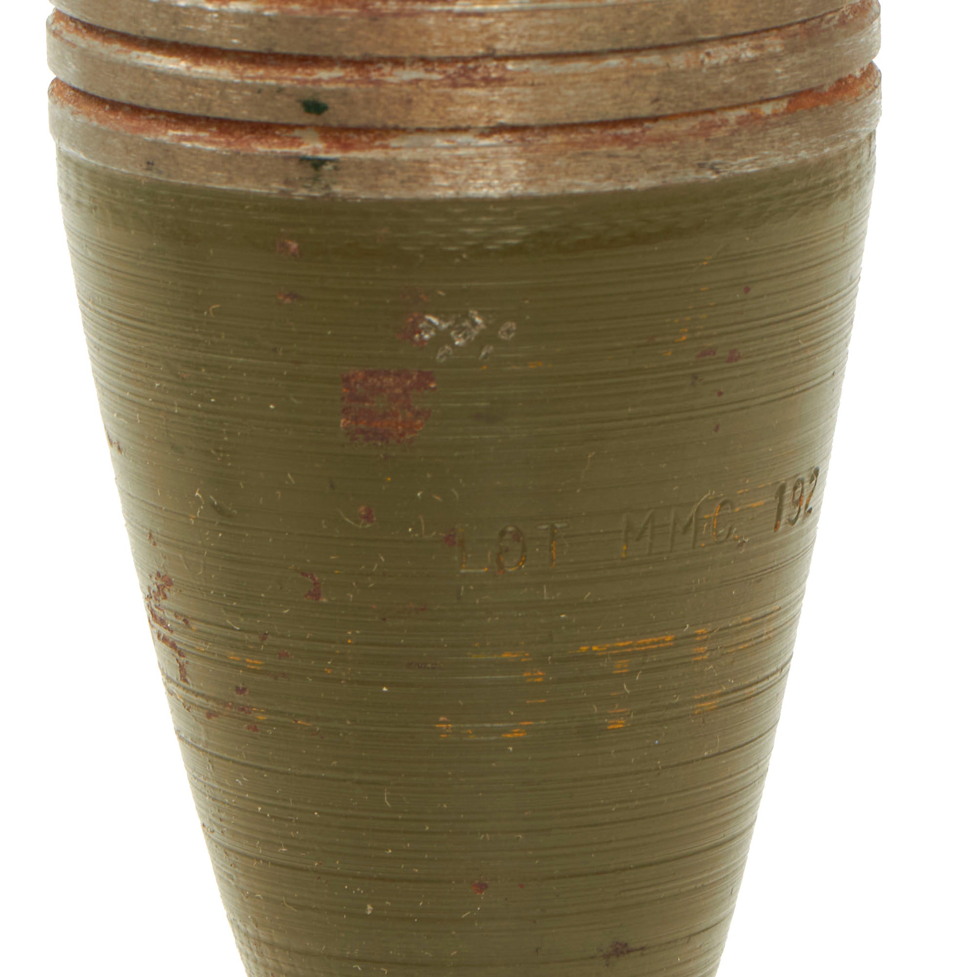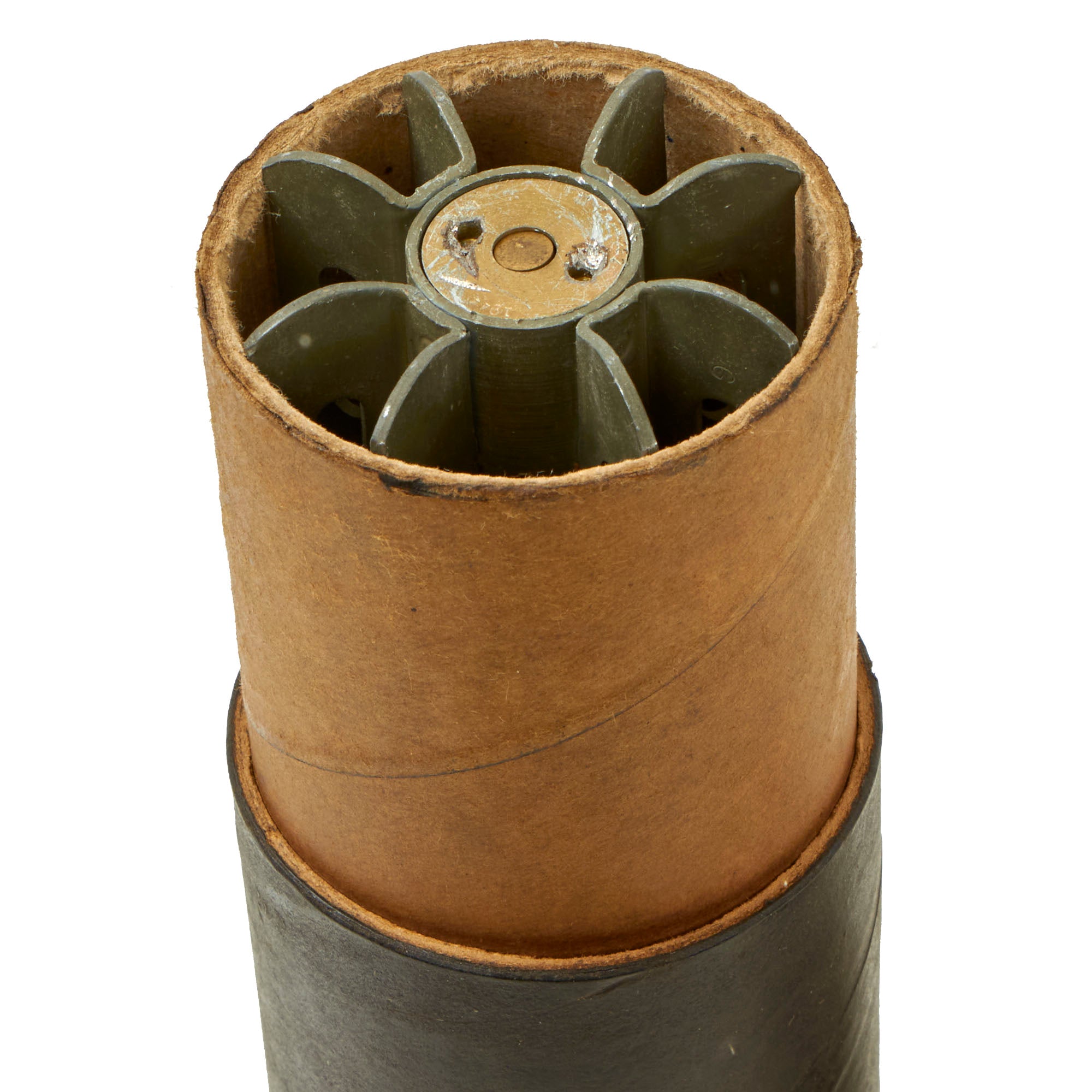 There is most of the original paint present, and does not appear to have ever been repainted. The fuse, which does have the aluminum detonation button, screws off for inspecting the internal structure.
