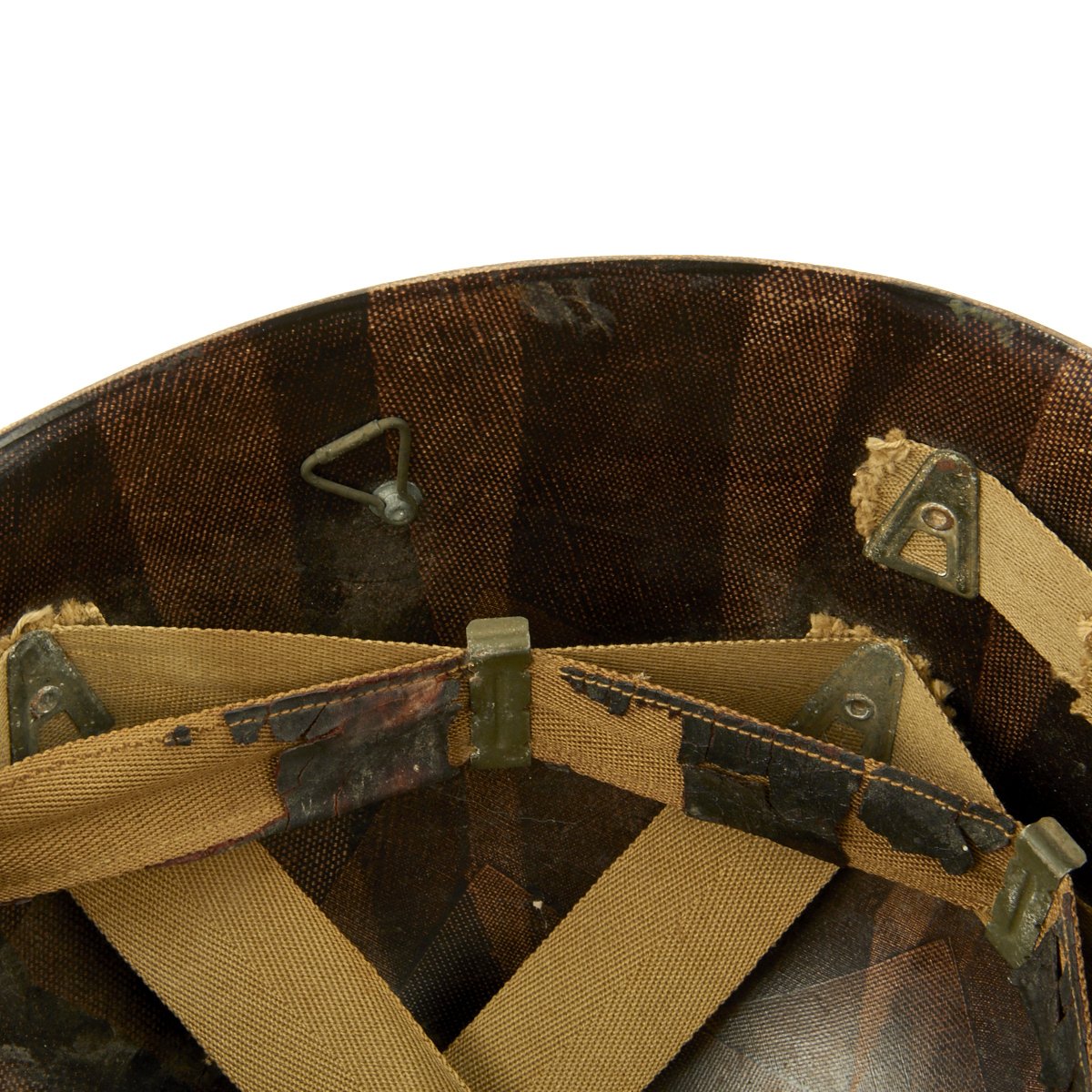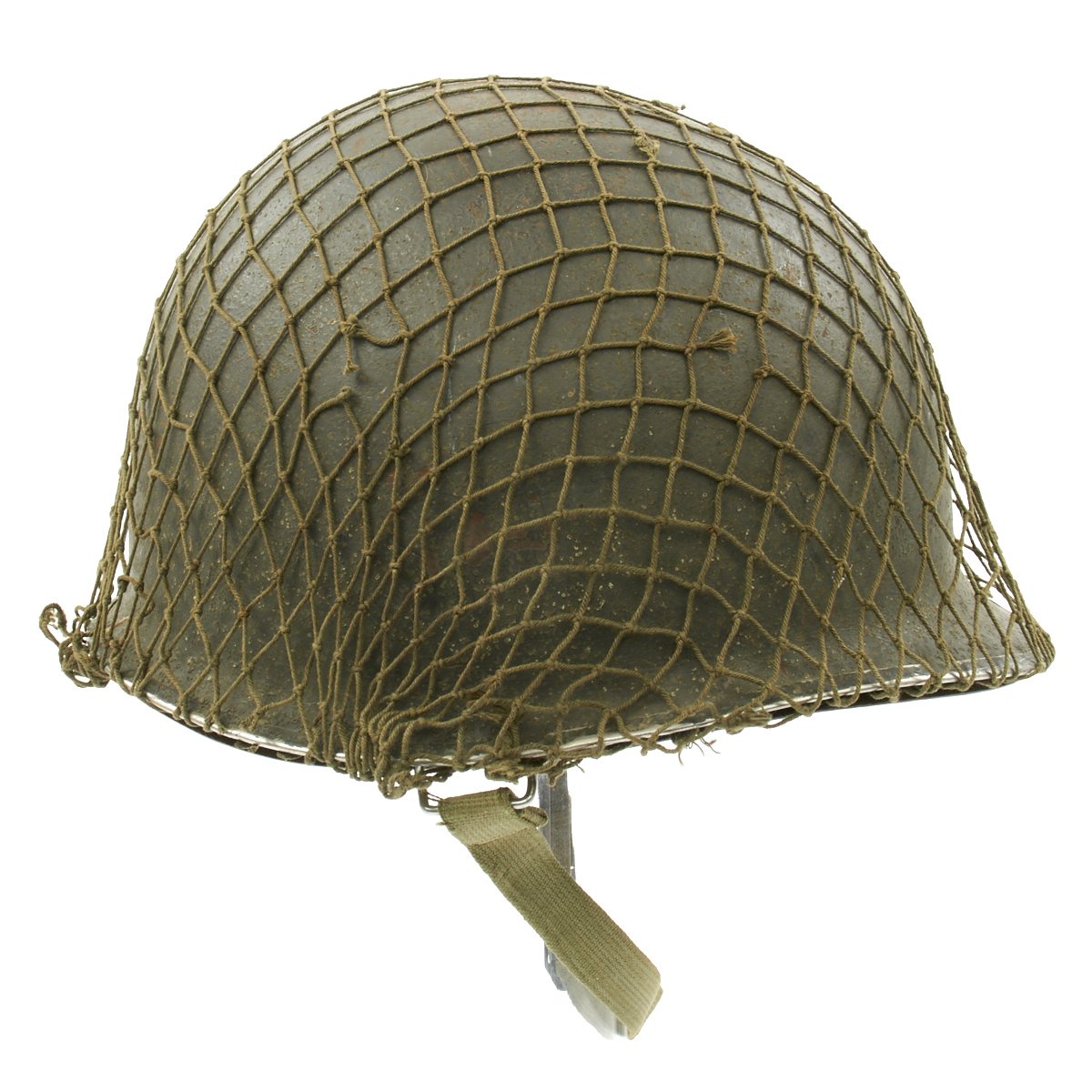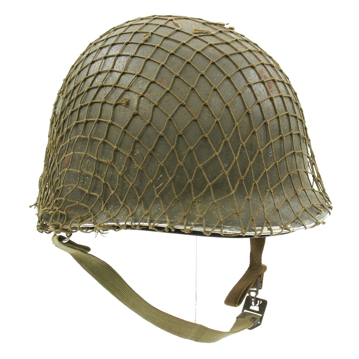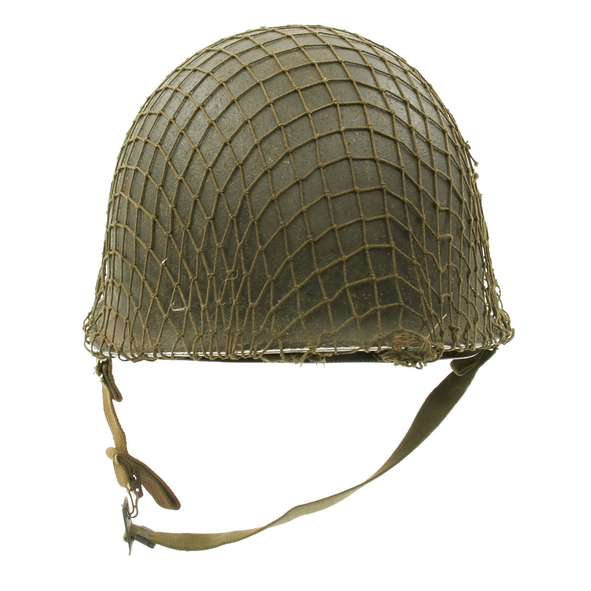 The U.S. WWII M-1 helmet was only produced from 1941 to 1945. The first production batch resulted with over 323,510 M-1 helmets before the start of the American involvement in the war. This helmet is heat lot stamped 954A which indicates the approximate manufacture date of July 1944.