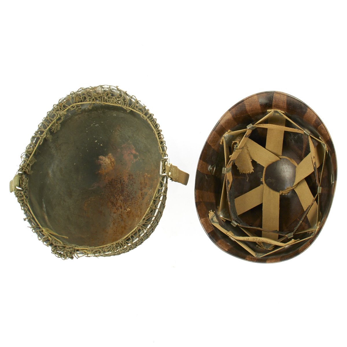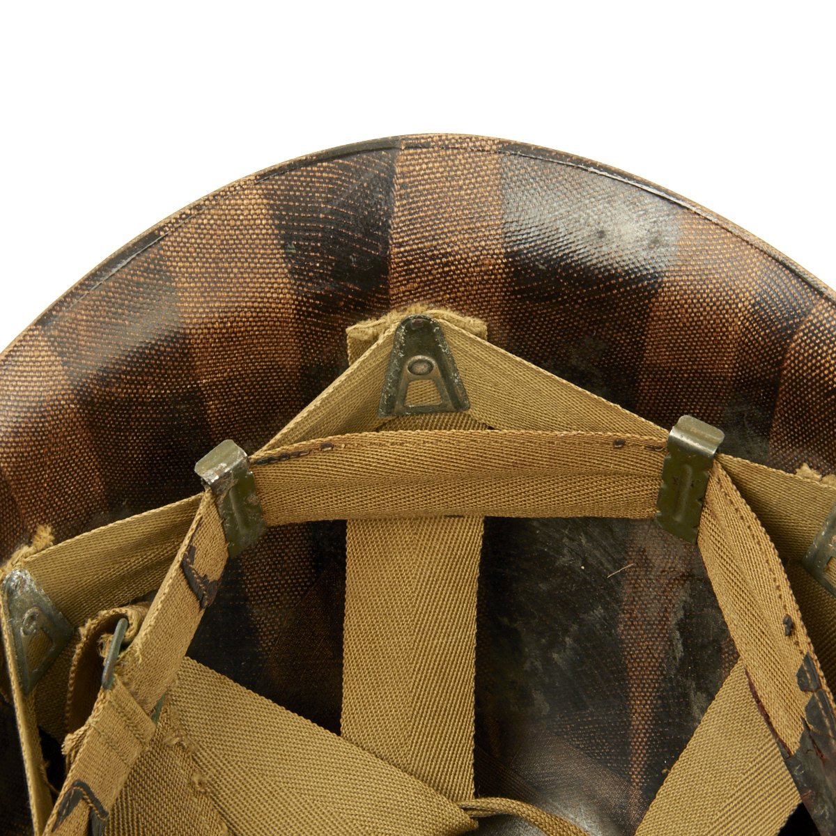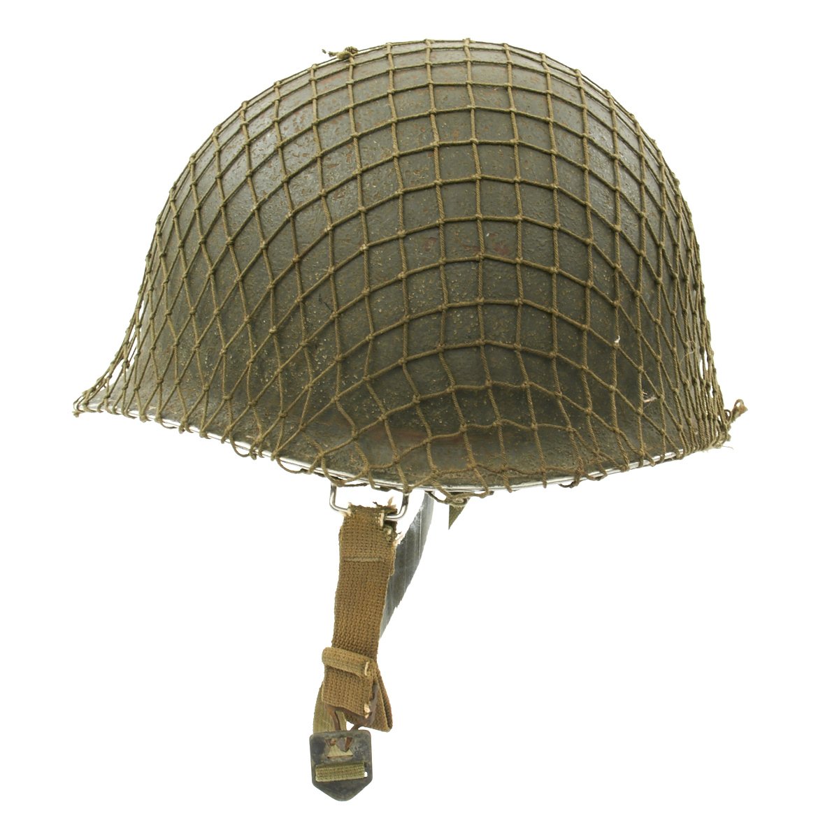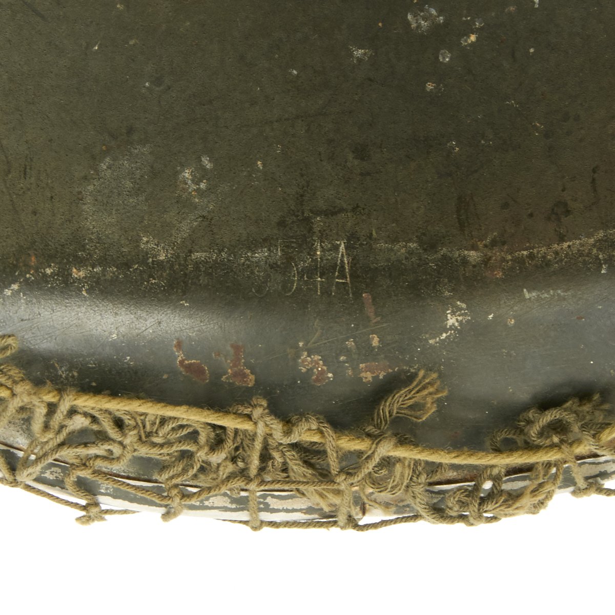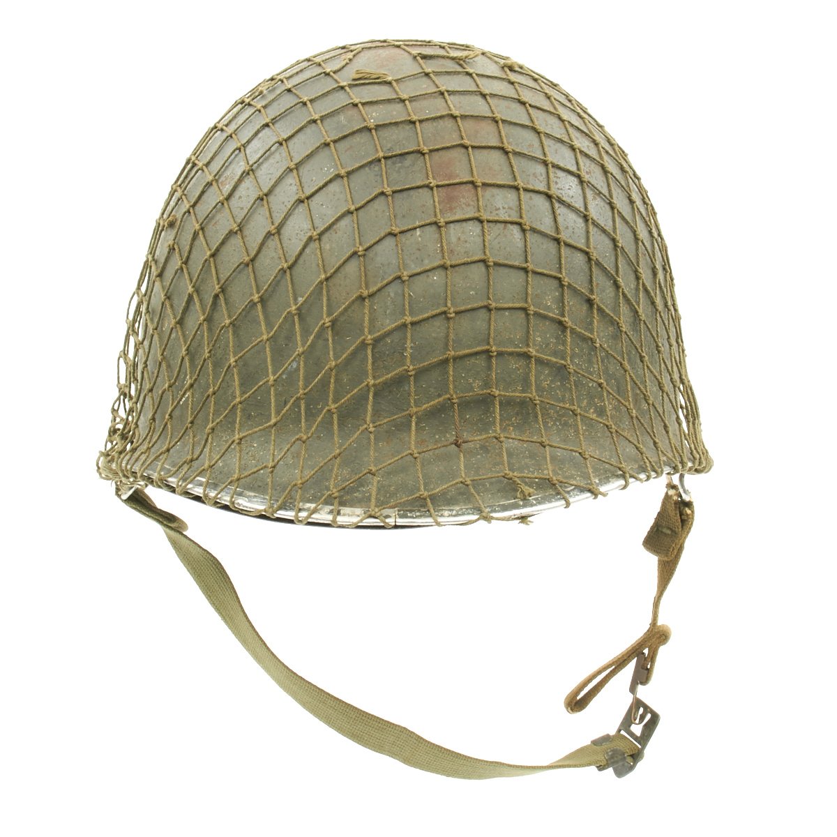 The U.S. WWII M-1 helmet was only produced from 1941 to 1945. The first production batch resulted with over 323,510 M-1 helmets before the start of the American involvement in the war. This helmet is heat lot stamped 954A which indicates the approximate manufacture date of July 1944.