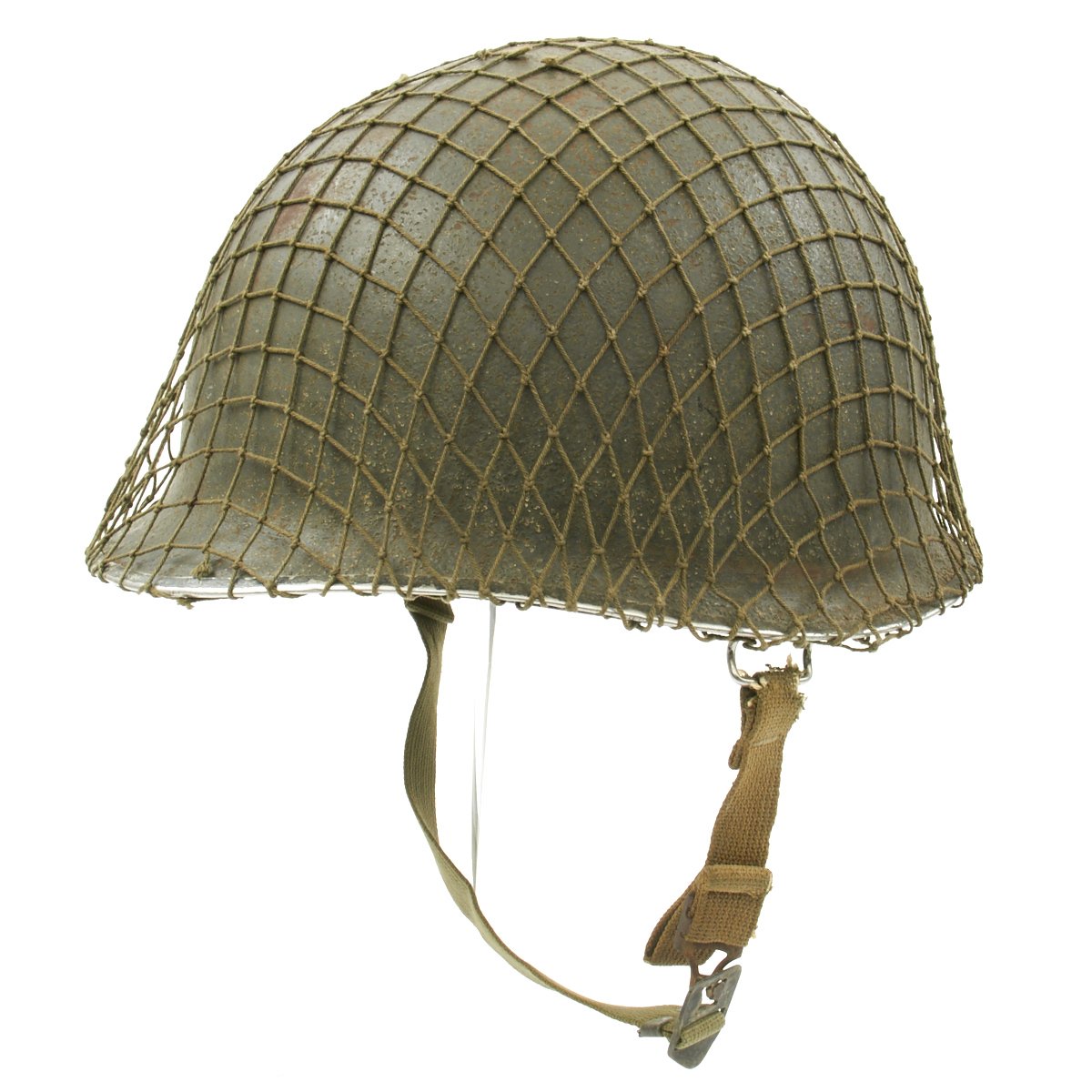 This helmet is a fine example and still retains most of its original WW2 parts and the shell has all original "corked" grain paint, though it definitely has seen use, and the cork is worn and chipped off in places. Also included is an original issue OD Green helmet net, held in place by the liner.