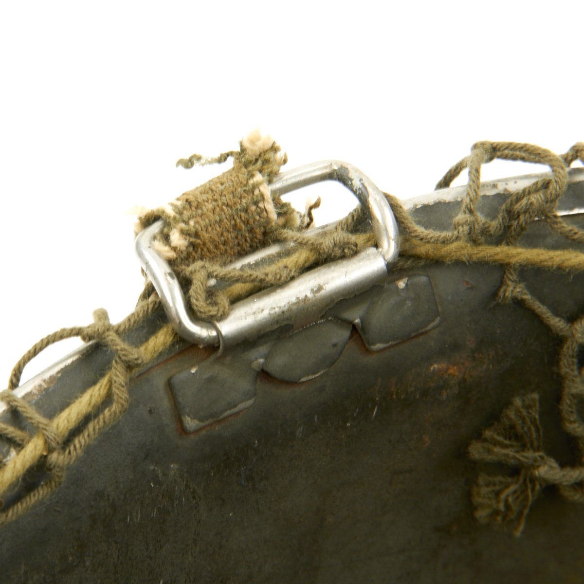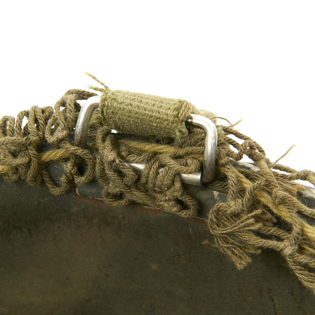 This true US WWII M-1 helmet liner be identified through the frontal eyelet hole. Other correct WW2 features include cotton herringbone twill (HBT) cloth suspension liner, with the webbing in very good shape. This HBT suspension is held tightly within the M-1 helmet liner by rivets and a series of triangular "A" washers. The three upper suspension bands are joined together with the correct OD green string. This way the wearer could adjust the fit. The sweatband is present, but most of the leather is missing, as it cracked and fell off long ago. The liner chin strap is also missing, though the attaching loops are still present. The shell chinstrap hook side is original, but the longer half is definitely a later arsenal replacement. Both have the correct blackened steel hardware.