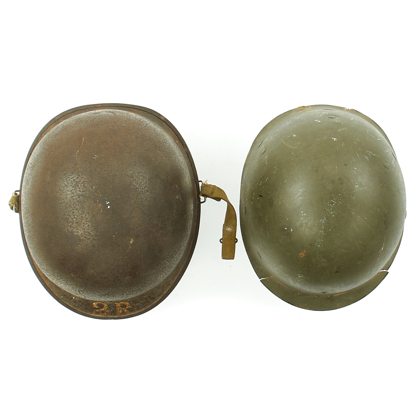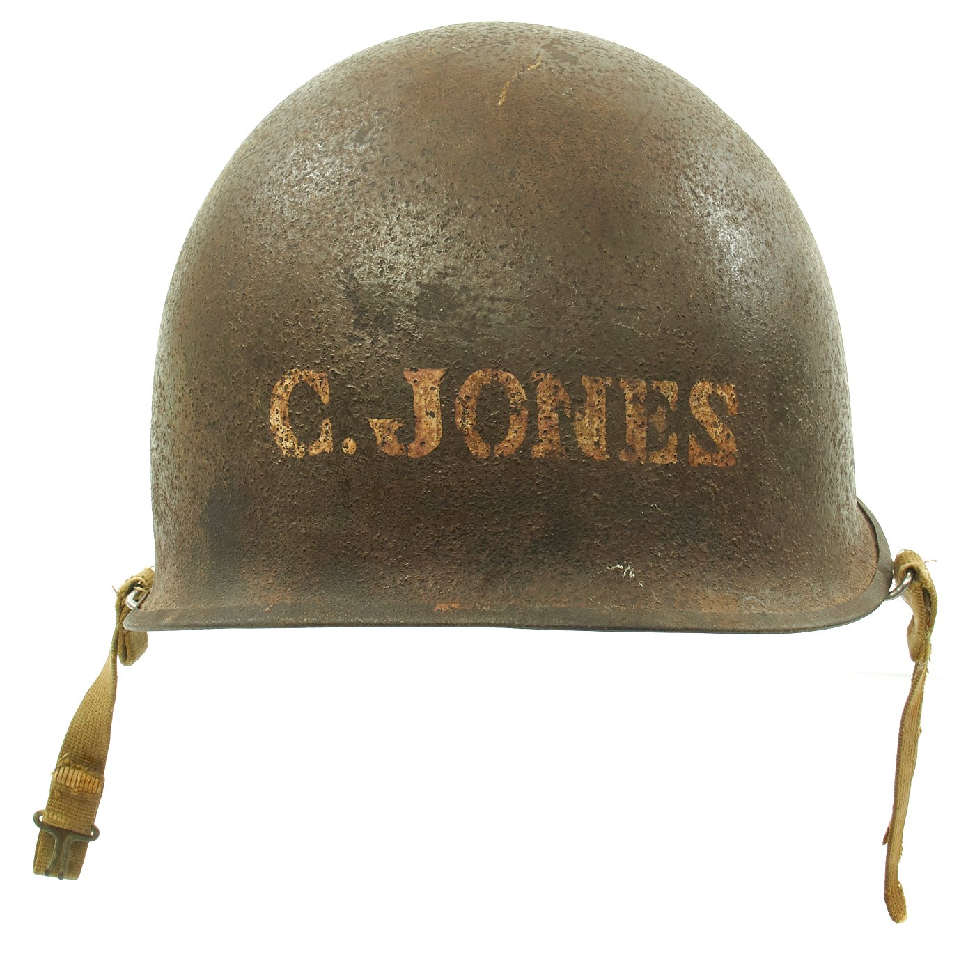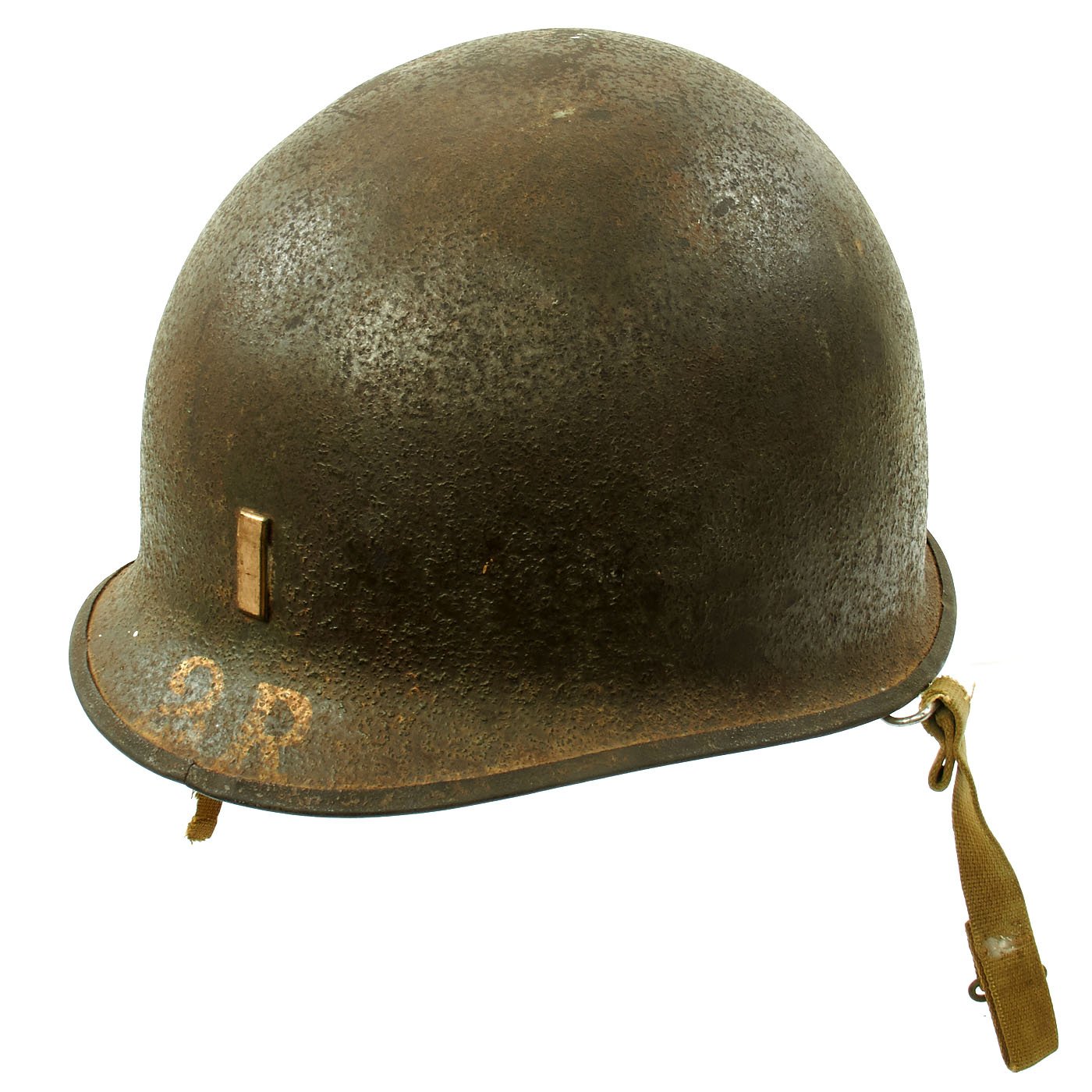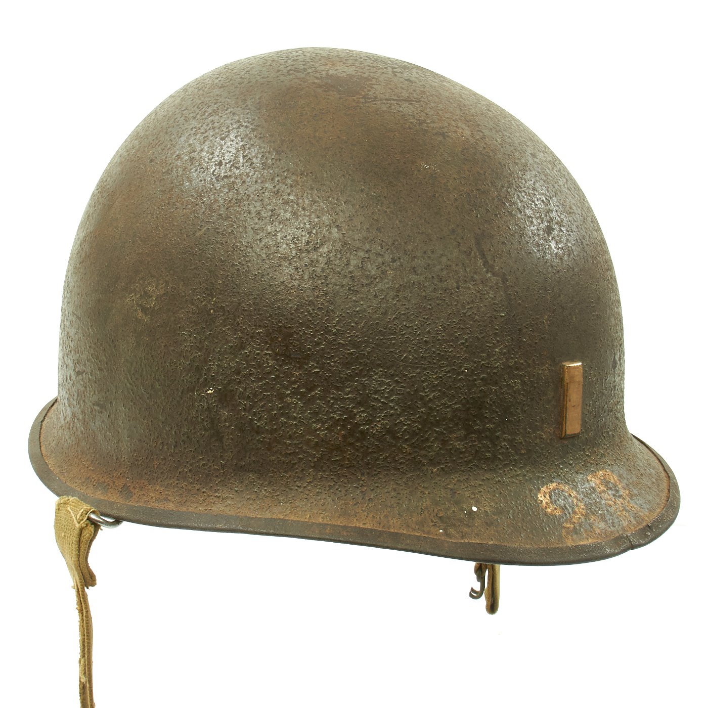 Original Item: One-of-a-kind. This is a fantastic 1944 front seam swivel bale helmet with Westinghouse liner. The shell bears a metal Lieutenant rank insignia to the front. Underneath the rank bar is a painted 2R and the reverse of the helmet is painted C. JONES. The inside of the helmet is also marked in paint B82. The interior bears a lot number of 1009C which places the estimated date of manufacture at July, 1944. Overall condition is very good.