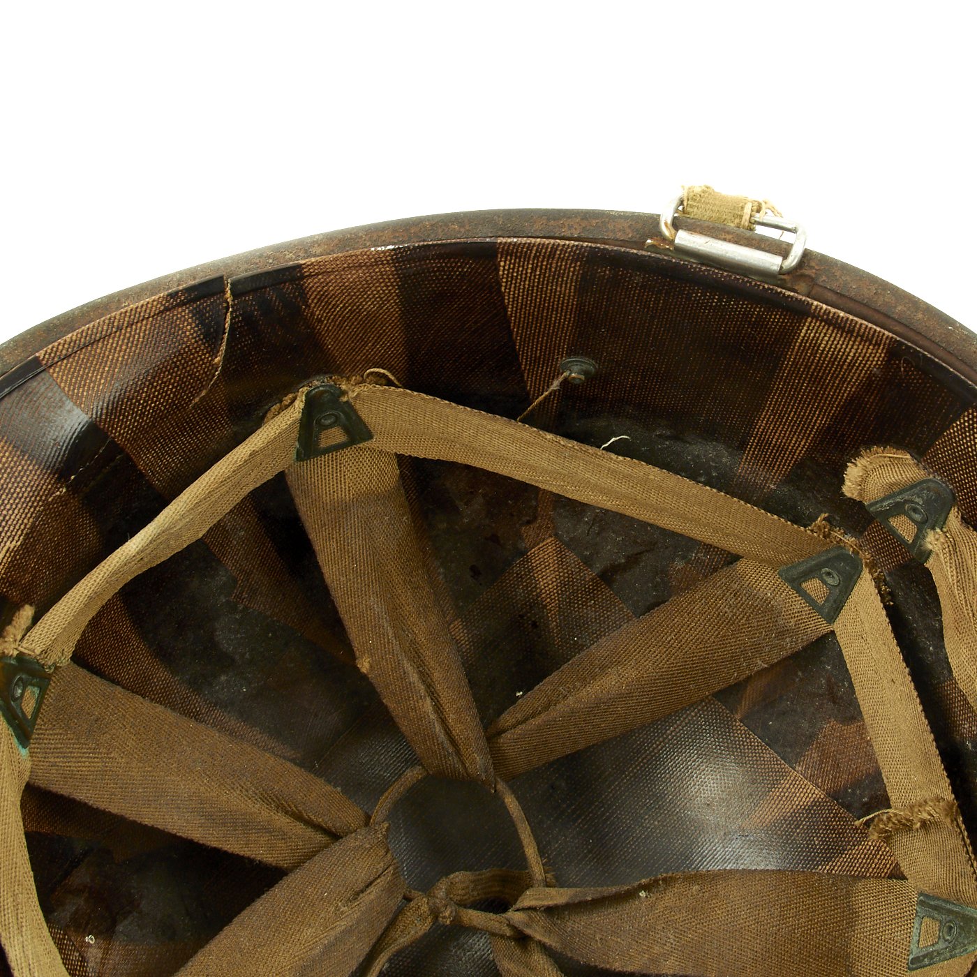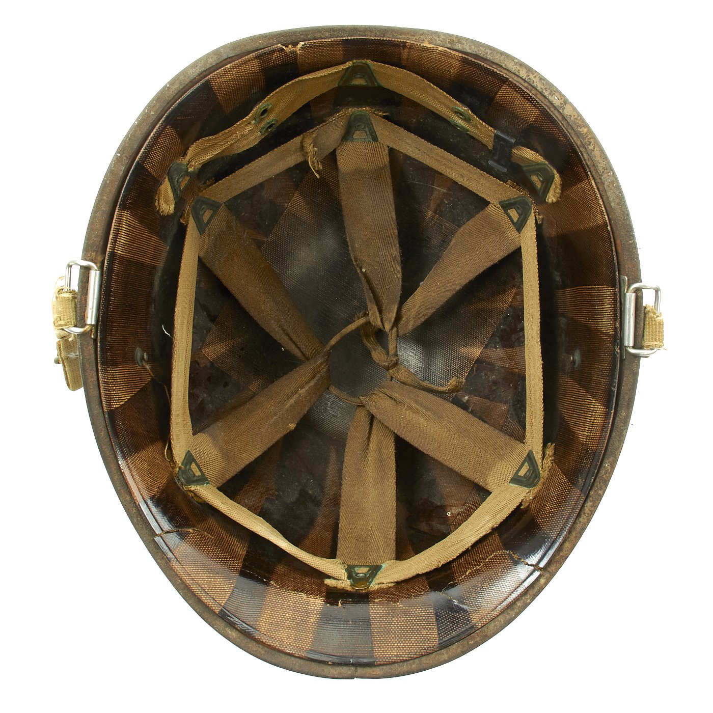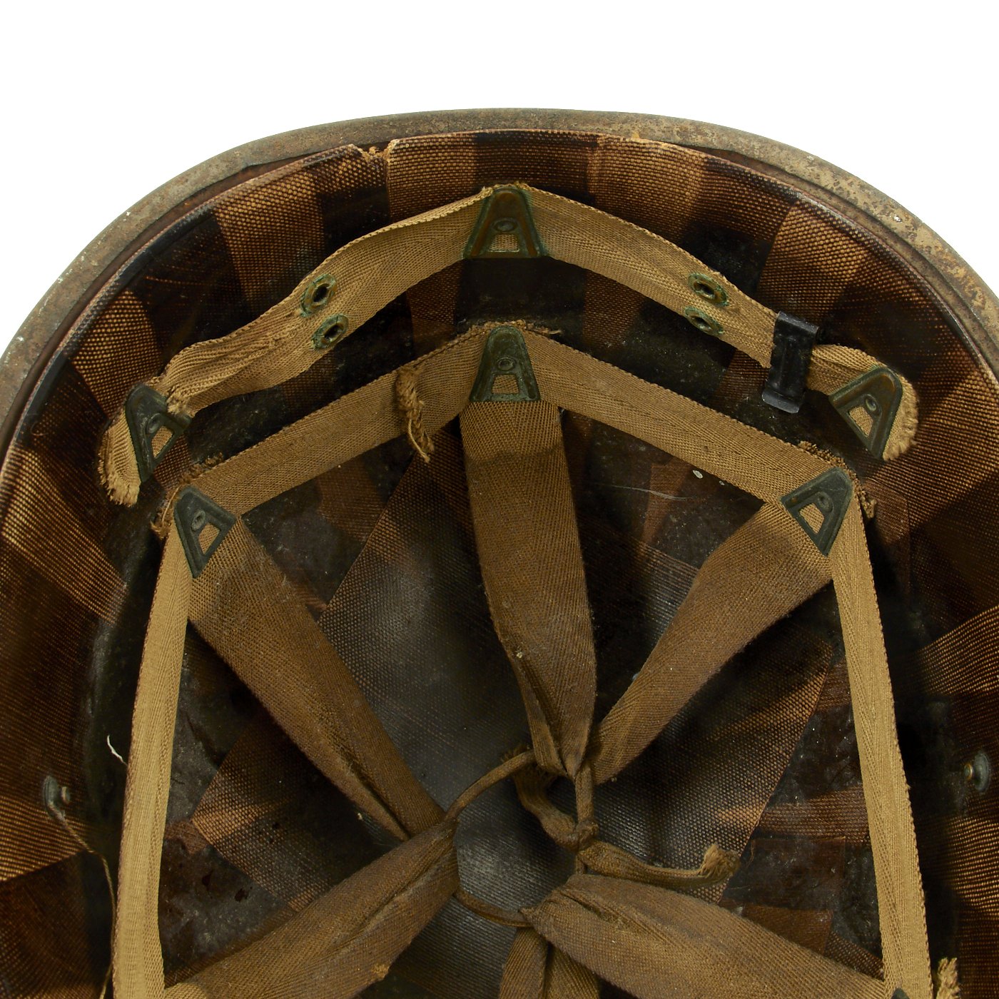 This true WWII M-1 helmet liner be identified through the frontal eyelet hole. Other correct WW2 features include cotton herringbone twill (HBT) cloth suspension dated 1943. This HBT suspension is held tightly within the M-1 helmet liner by rivets and a series of triangular "A" washers. The three upper suspension bands are joined together with a shoestring. This way the wearer could adjust the fit.