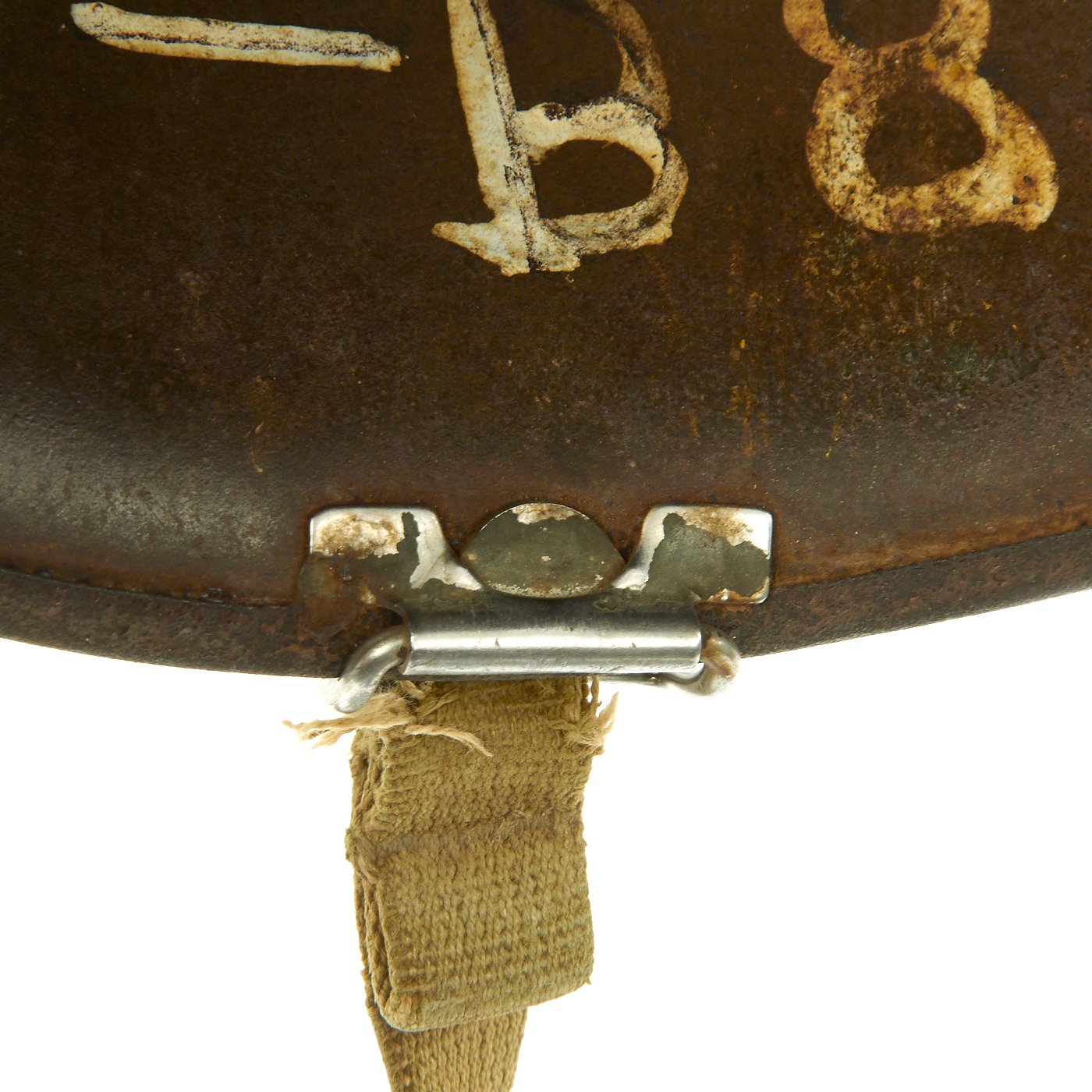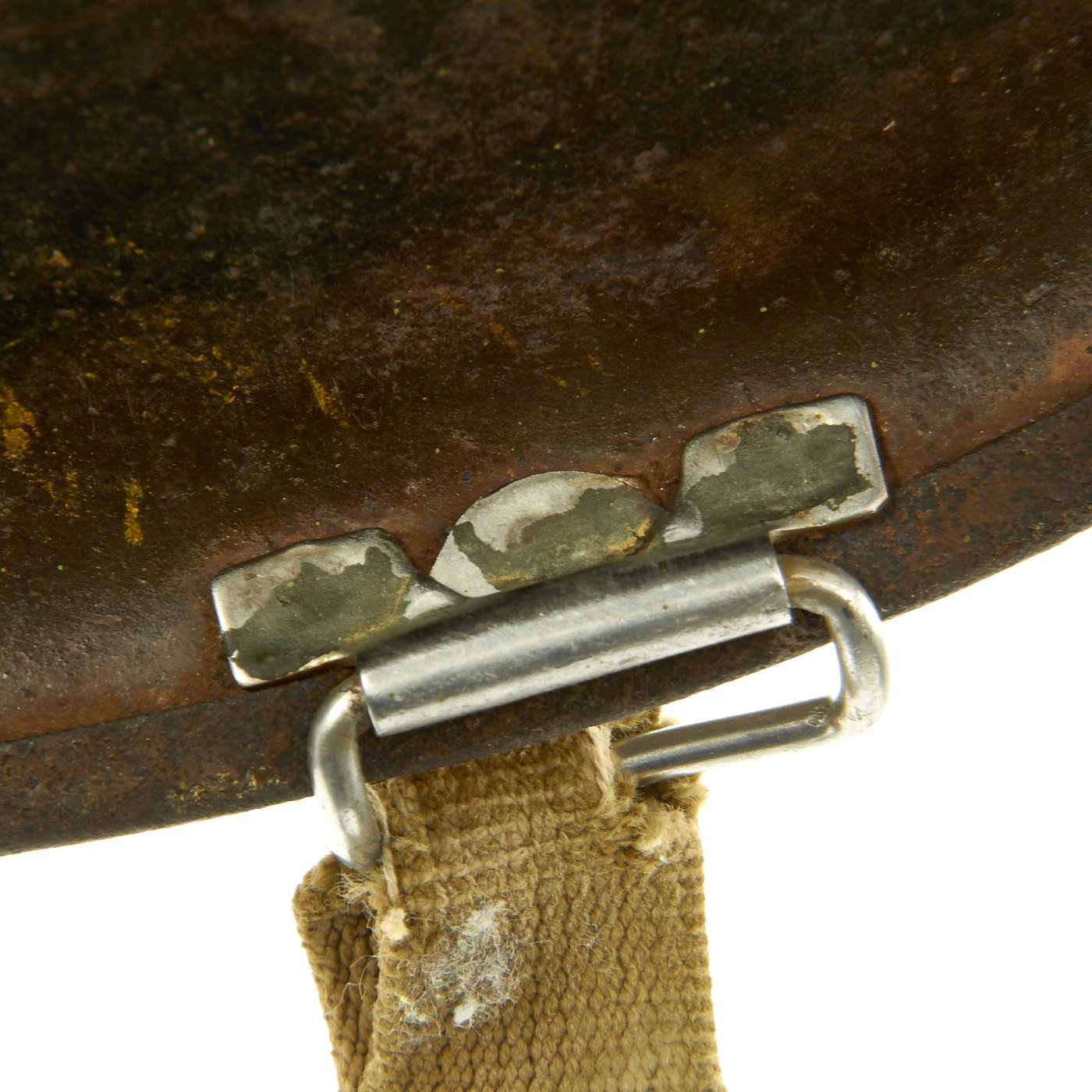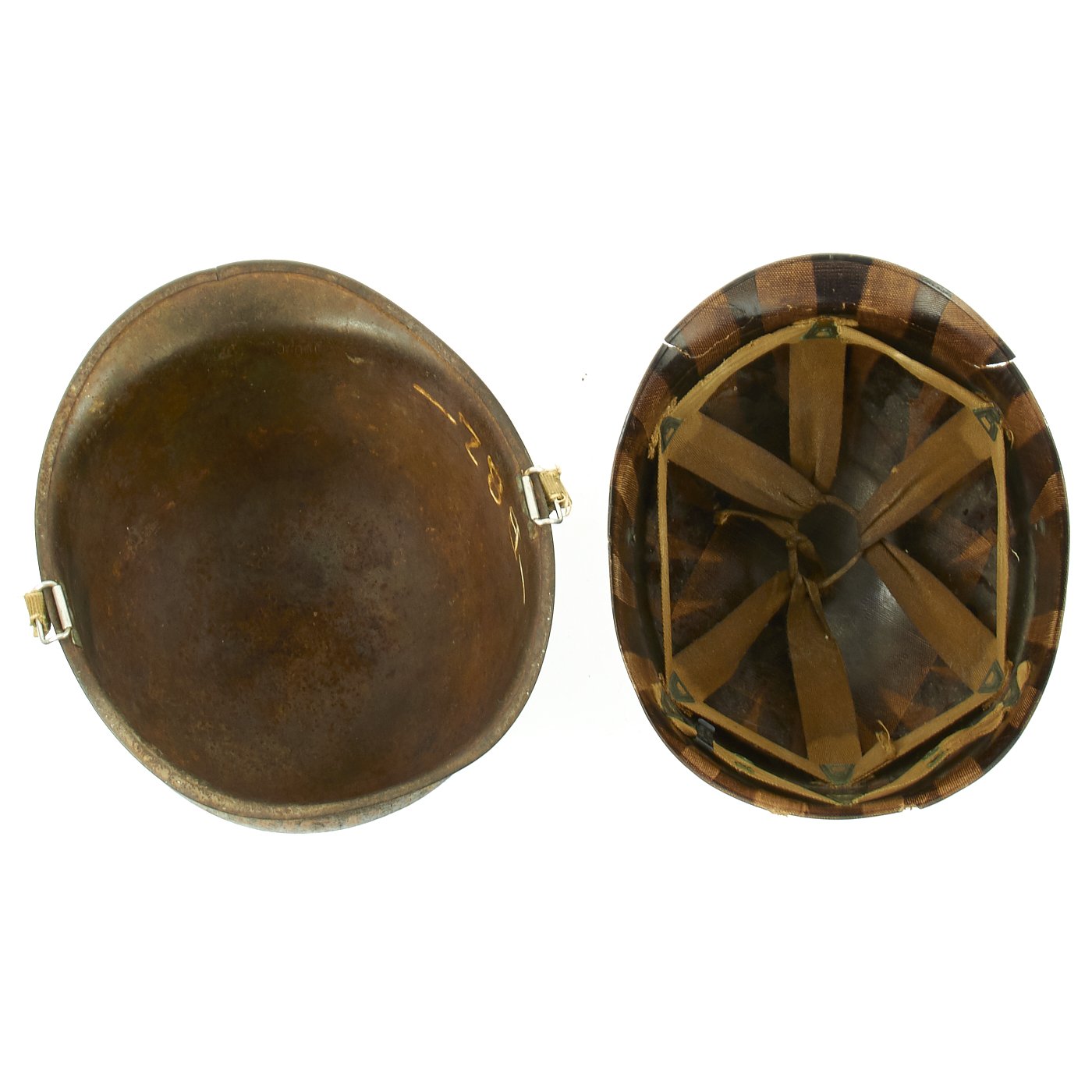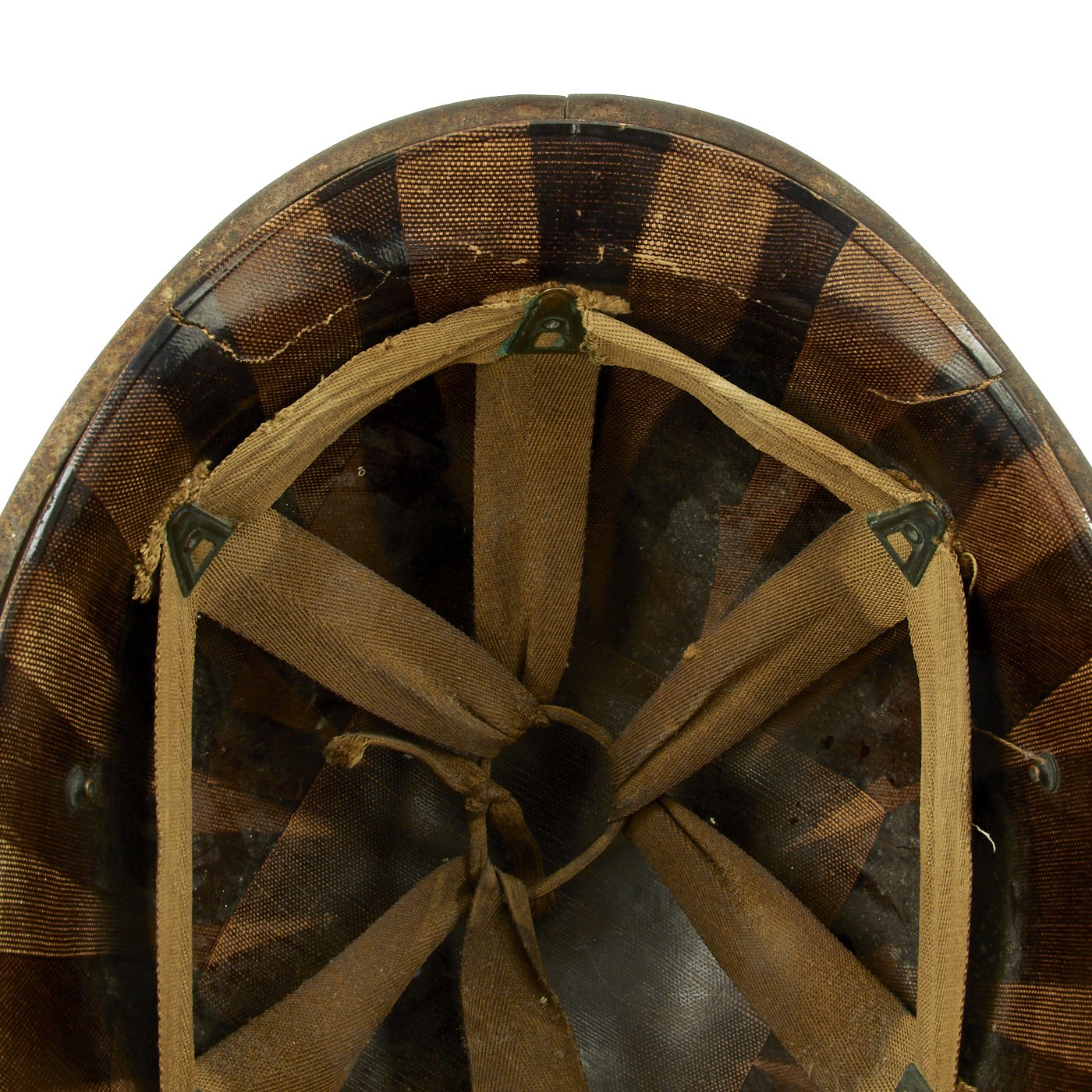This true WWII M-1 helmet liner be identified through the frontal eyelet hole. Other correct WW2 features include cotton herringbone twill (HBT) cloth suspension dated 1943. This HBT suspension is held tightly within the M-1 helmet liner by rivets and a series of triangular "A" washers. The three upper suspension bands are joined together with a shoestring. This way the wearer could adjust the fit.