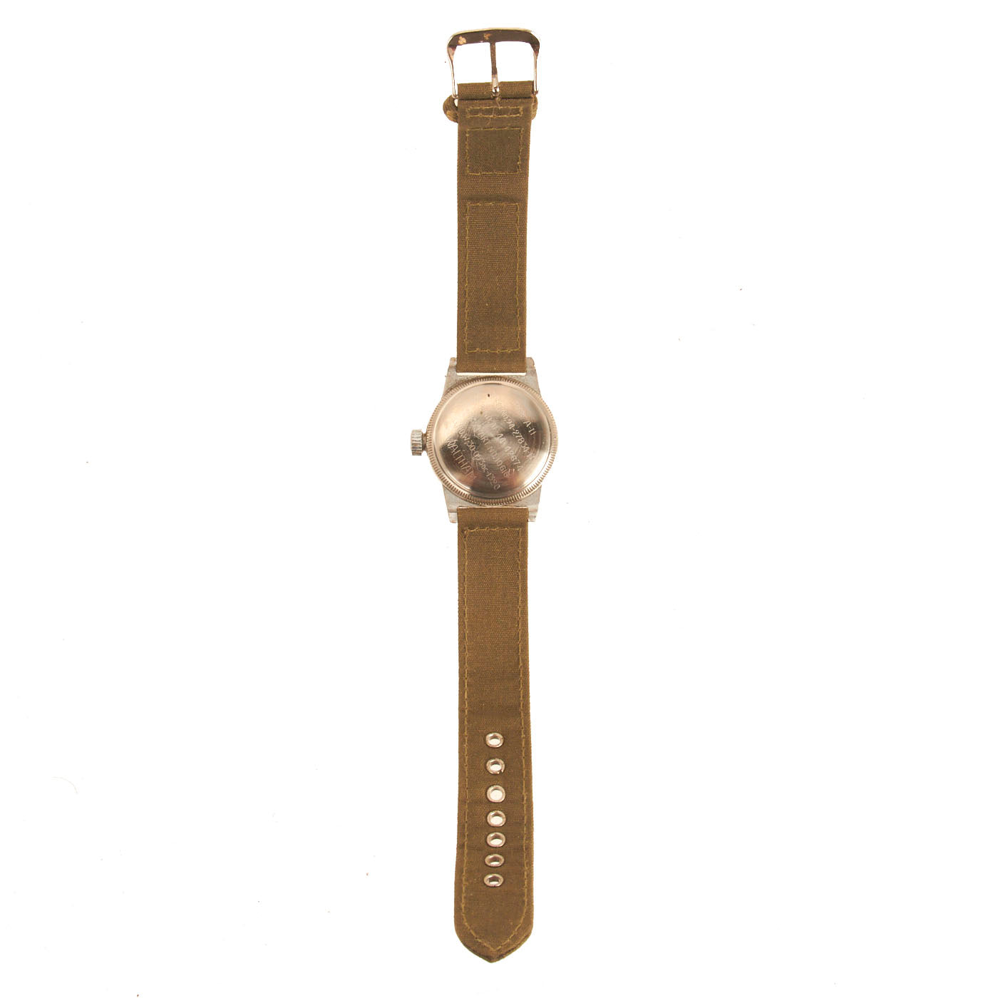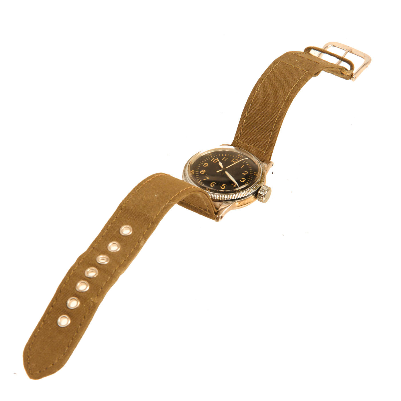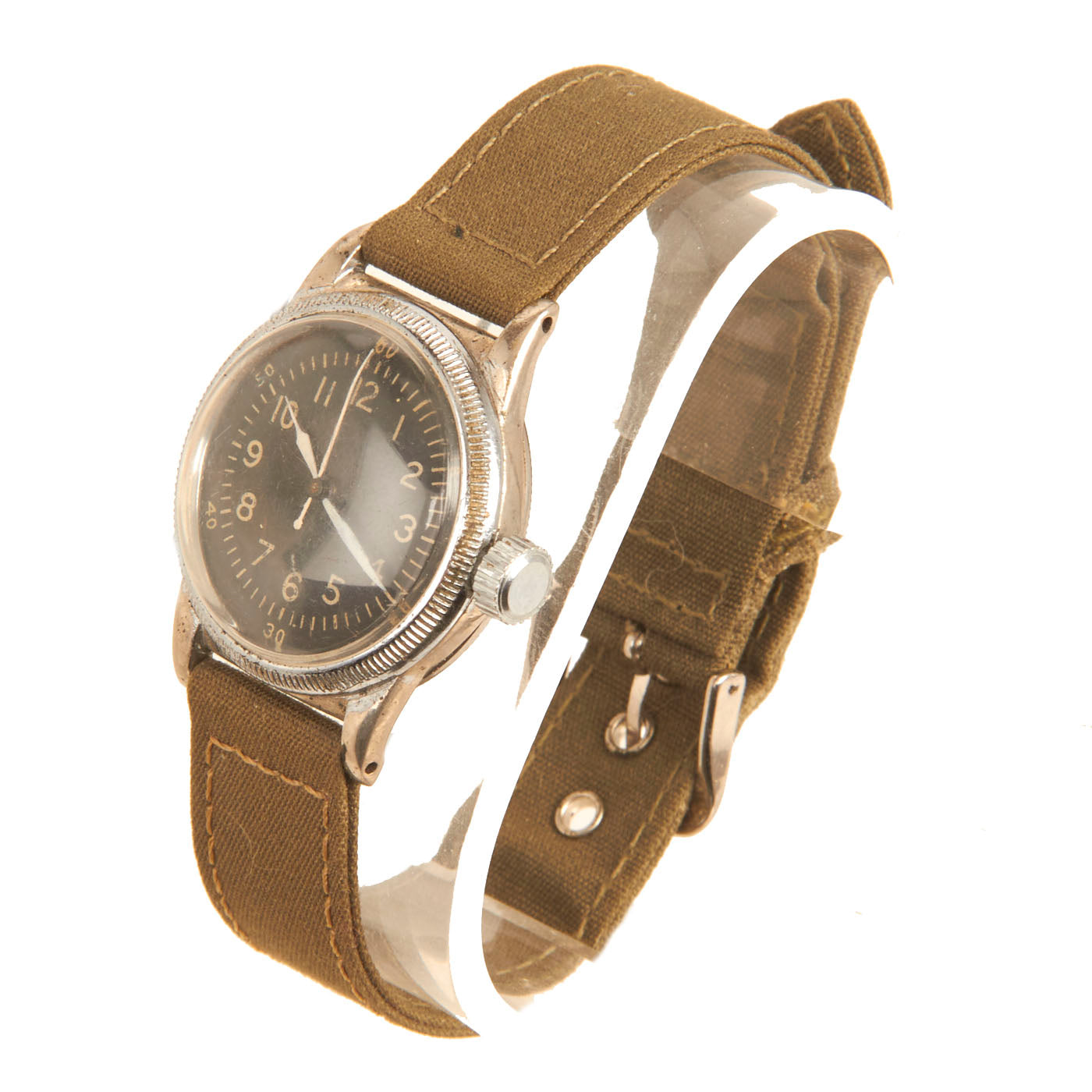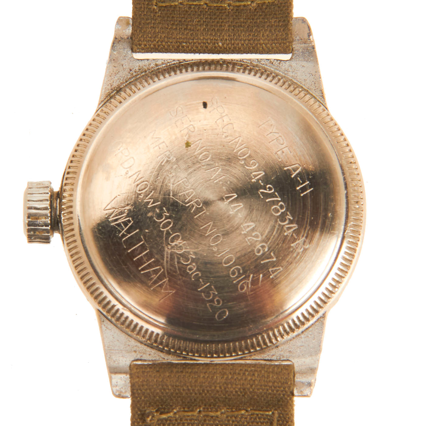 This is a very good condition genuine WW2 issue 1944 dated Waltham A-11 military watch. This example has been fully cleaned, tested and runs perfectly. The watch was manufactured in 1944 for Pilots and Navigators in the US Army Air Force (USAAF). Watch case is 30mm. It features a Waltham hand-winding and hacking movement, which allowed the movement to be stopped for "watch synchronization". The band is a correct high quality OD Green web reproduction.