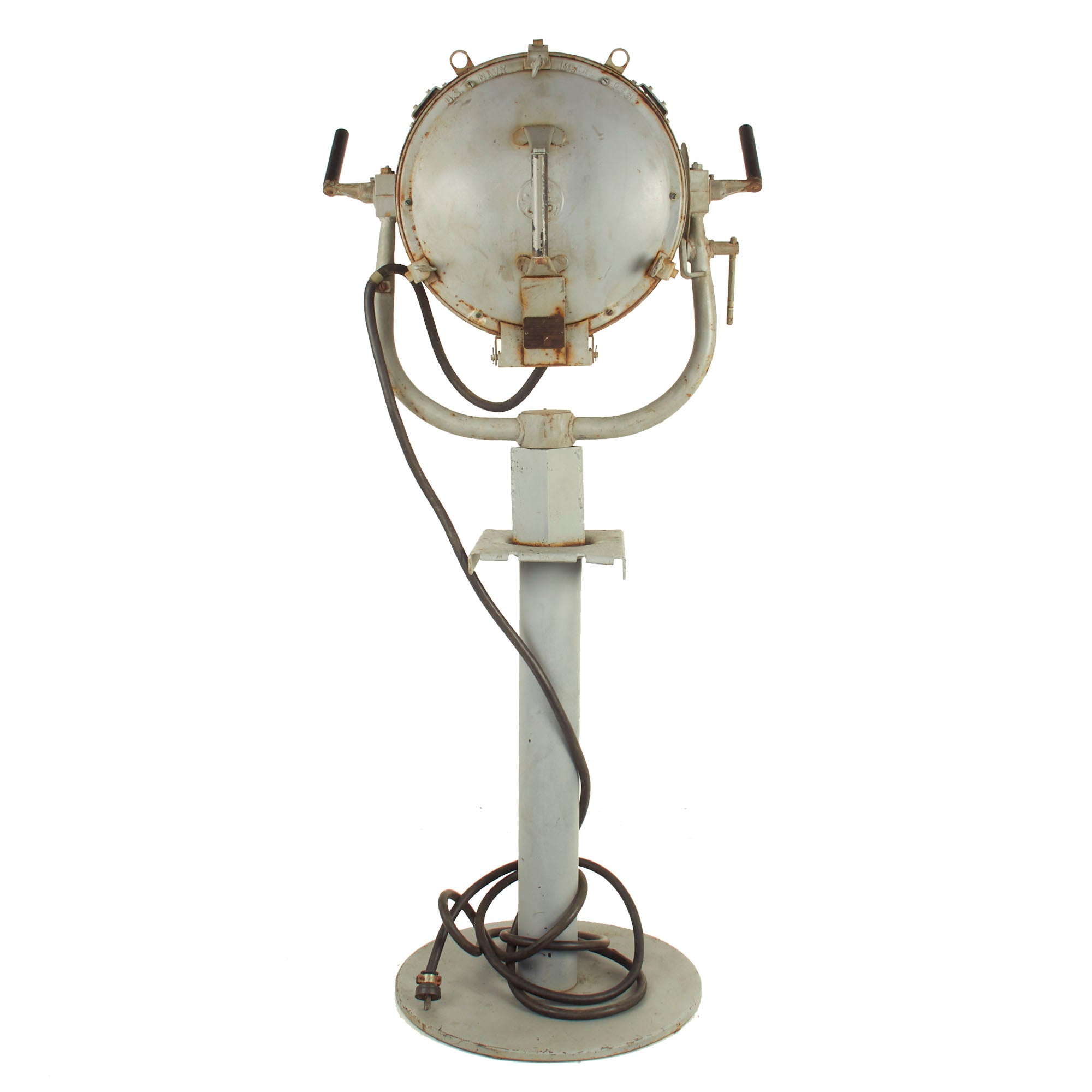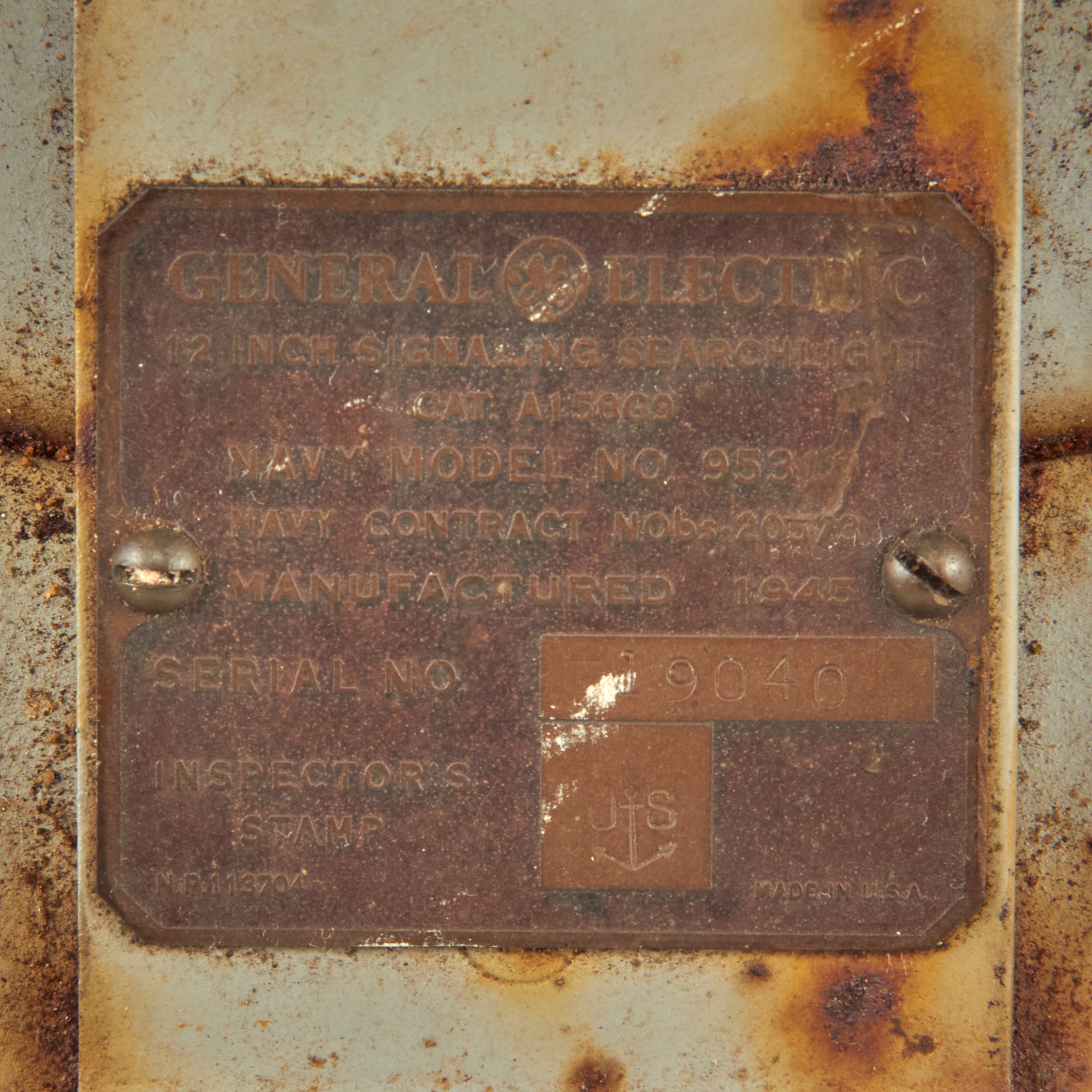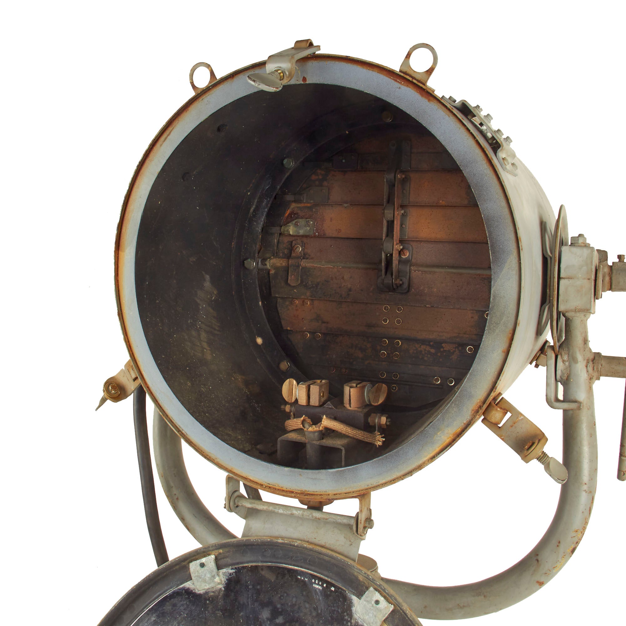 Original Item: Only One Available. This is a fantastic condition of a 1945 dated 12” US Navy Ship’s Signal Search Light with a very nice functional Morse code shutter assembly. Examples are extremely rare to come by, especially one with an original ship pedestal mount.