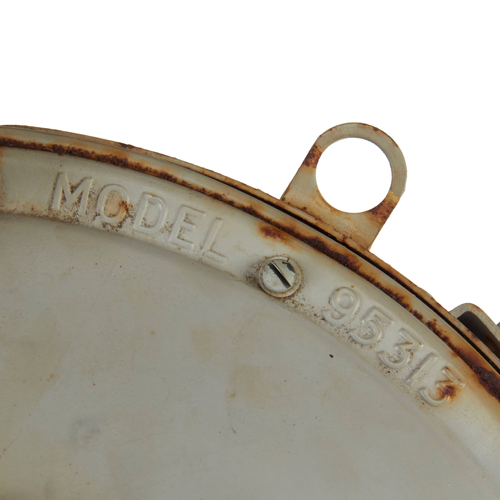 This signal lamp is in wonderful condition but remains untested. We are not sure if the light itself has working wiring, so as of right now this is a display item. It is recommended that if your intent is to have this as a working light that you have it examined and tested by a licensed electrician. There is no bulb included. The lamp on mount stands at approximately 55” overall with the light portion measuring 12” x 15 ½”. The haze gray paint is retained quite nicely with only a few areas of paint loss now replaced by oxidation. The shutter assembly still opens and retracts as intended. Approximate overall weight of pedestal and light is 75 LBS.