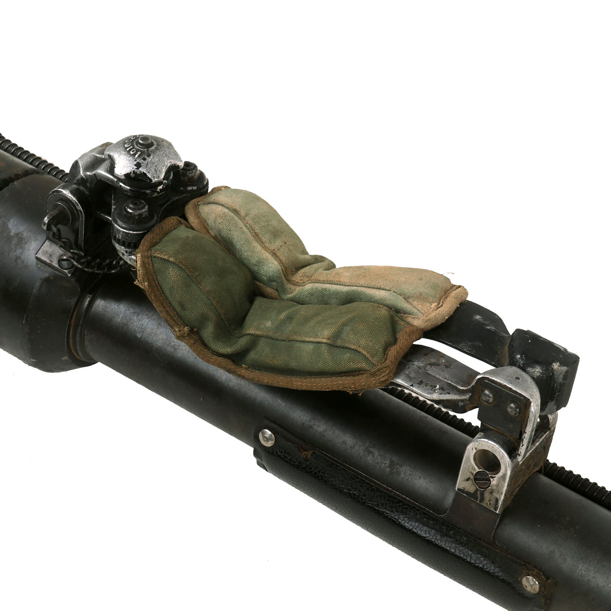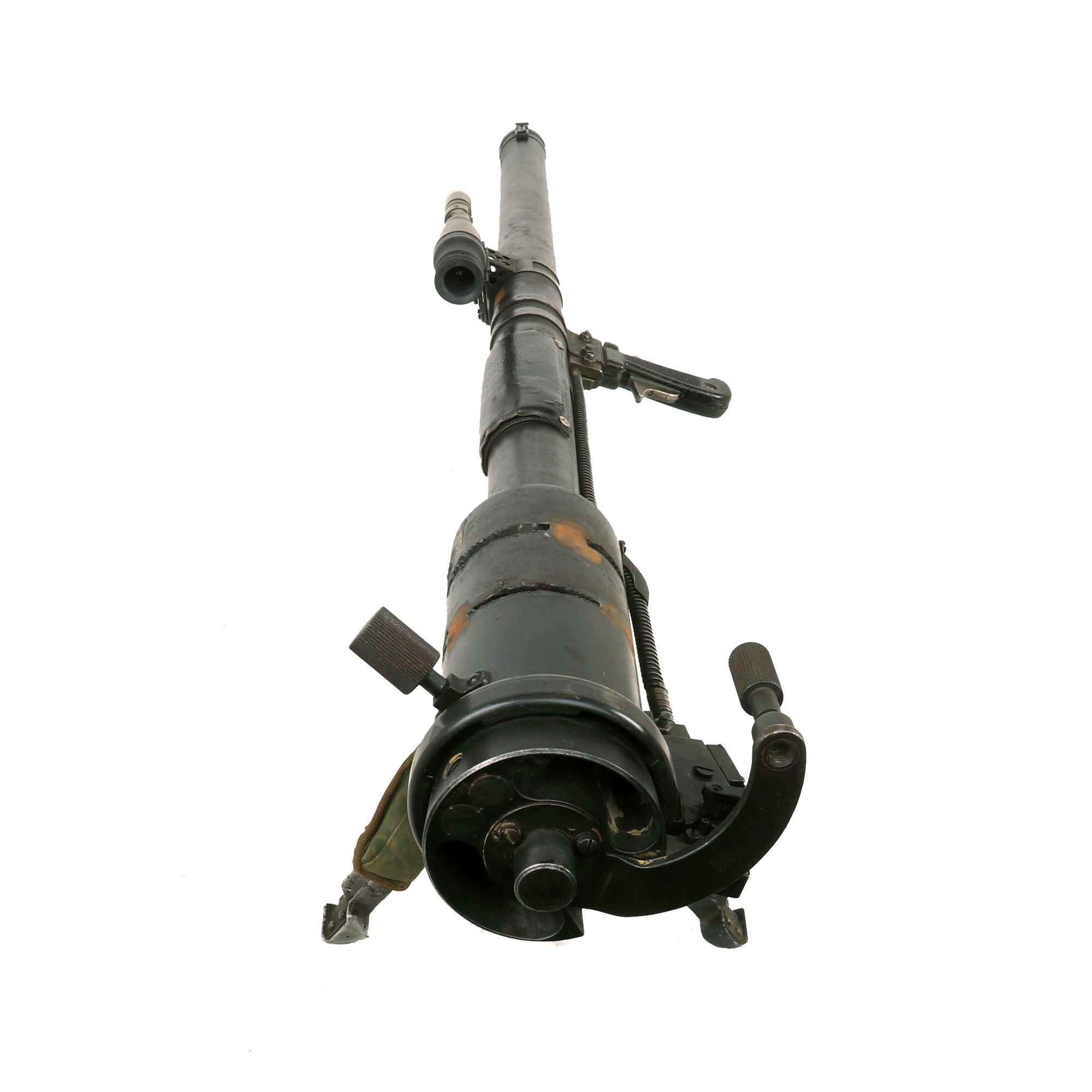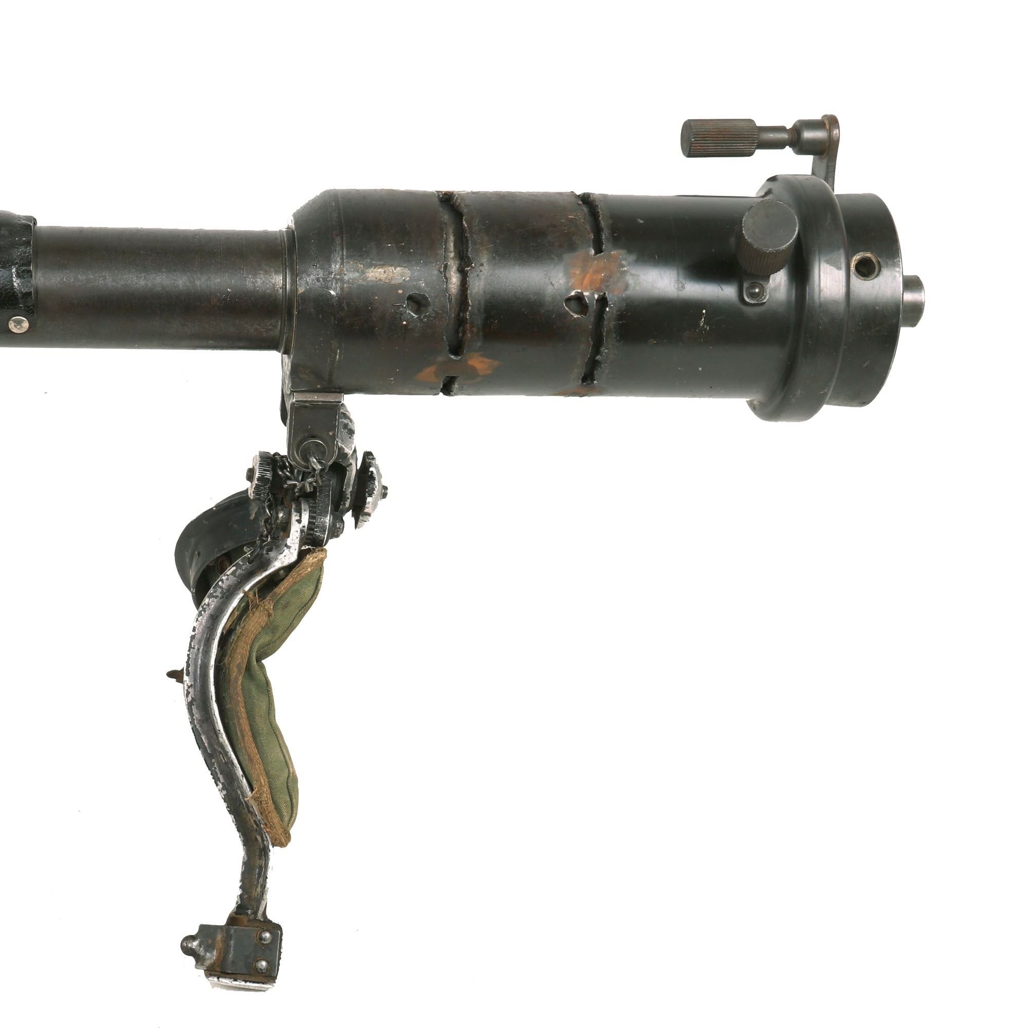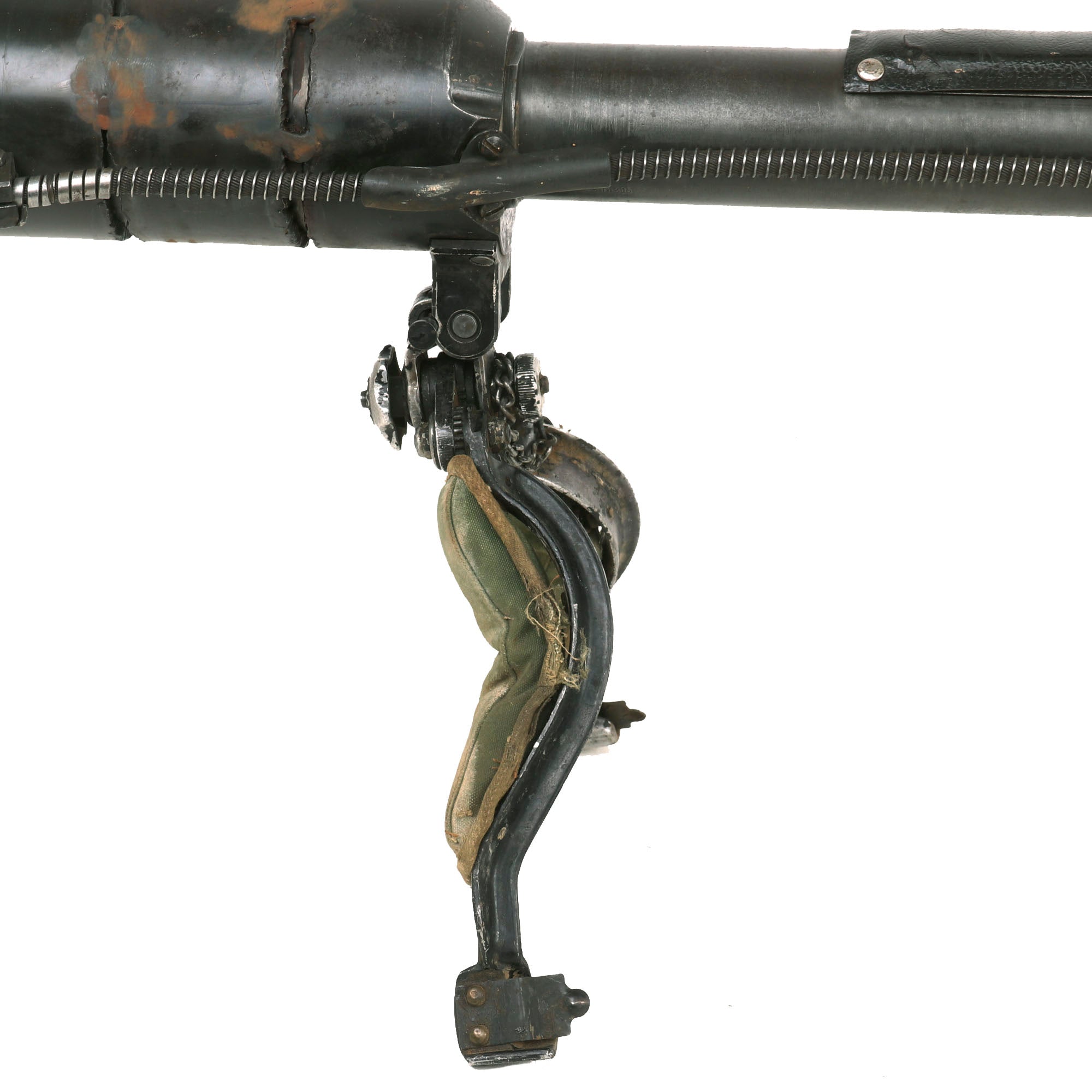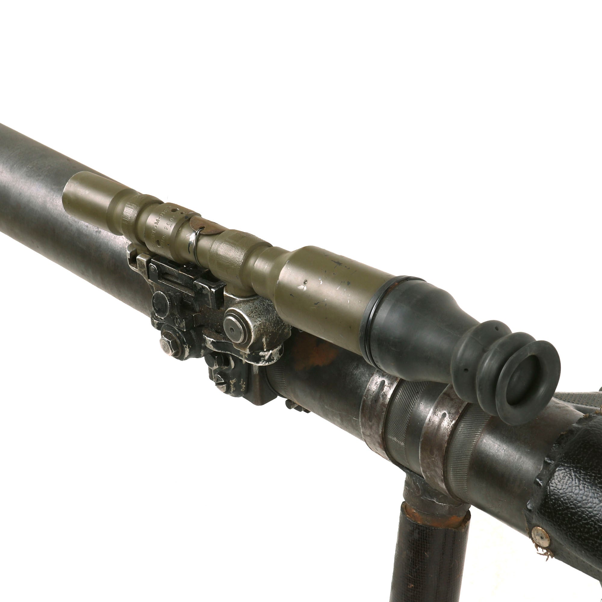 This example is offered in very good condition with the original finish, functional optical scope on the original mount, monopod and shoulder rest / bipod. It also retains the pistol grip and trigger assembly attached to the monopod fitting, and even still has the wiring going back to the breech area. There are some dents and other damage from being handled from over the years, but it still looks fantastic. It weighs approximately 48.5 lbs and is 61 in long.