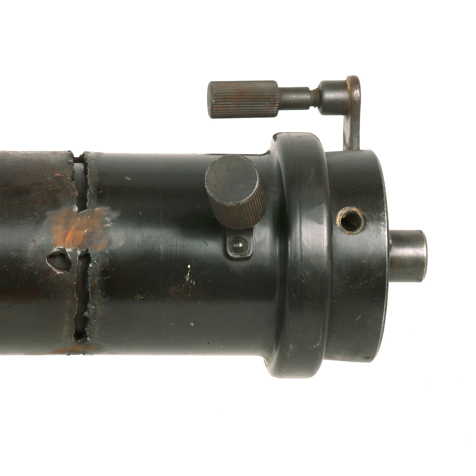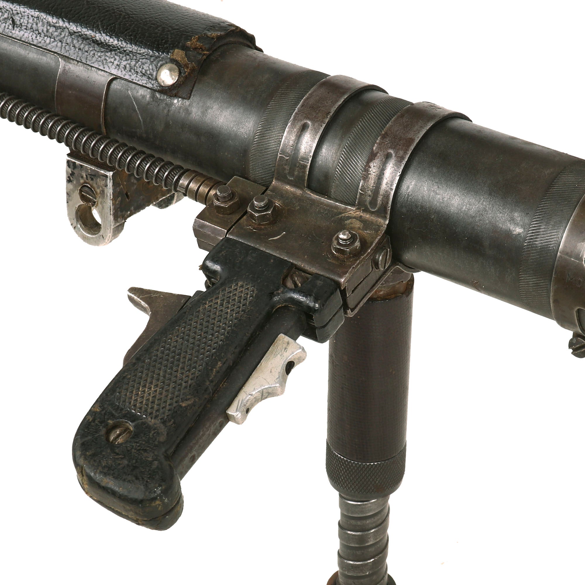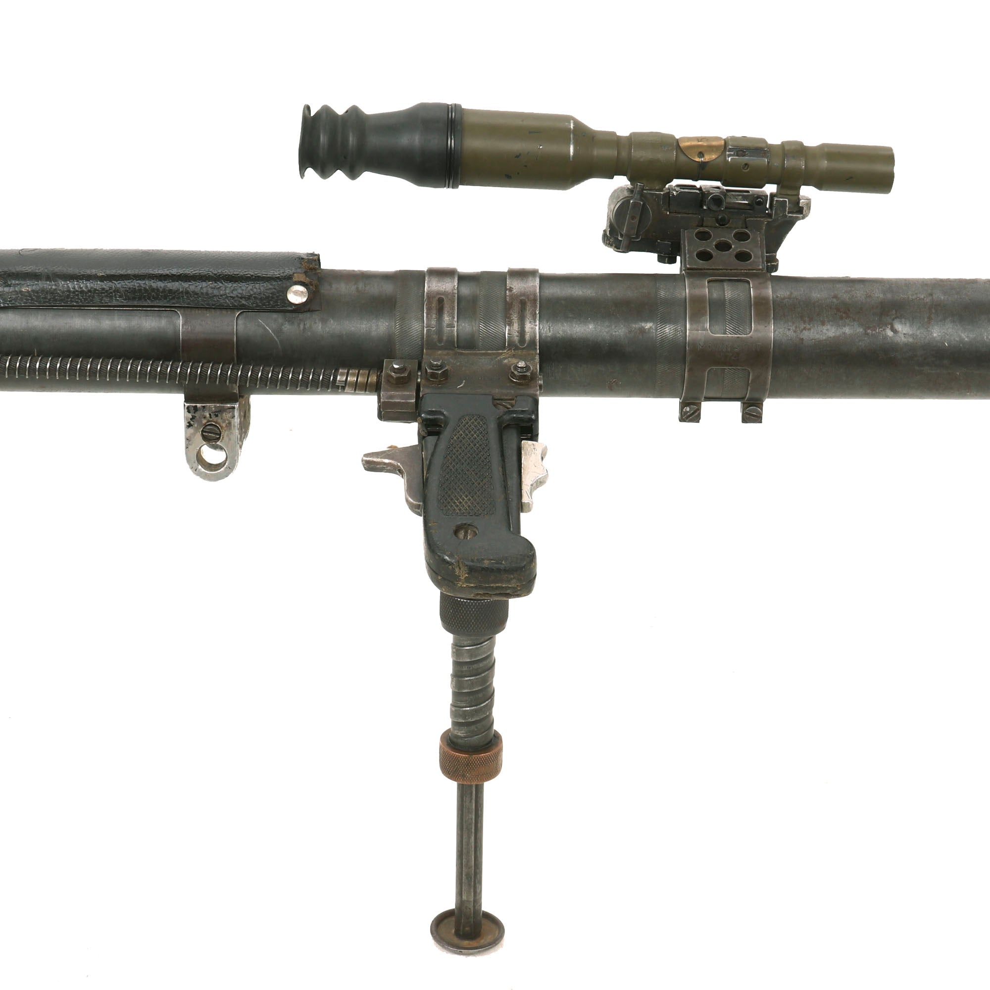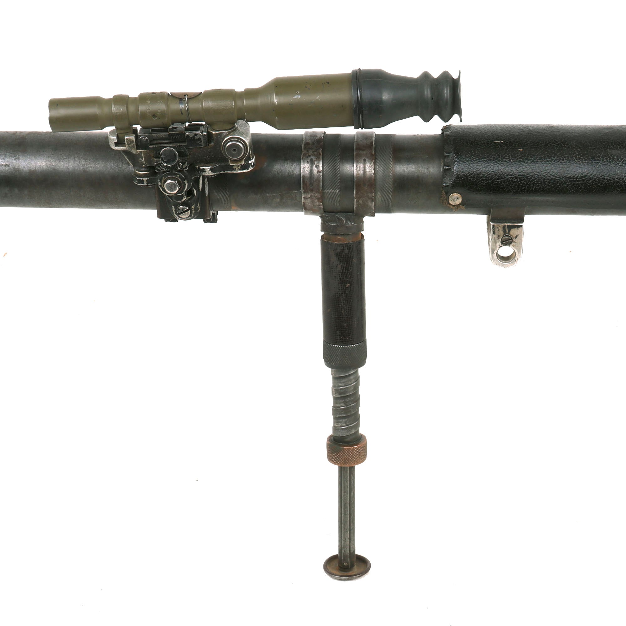 This example is offered in very good condition with the original finish, functional optical scope on the original mount, monopod and shoulder rest / bipod. It also retains the pistol grip and trigger assembly attached to the monopod fitting, and even still has the wiring going back to the breech area. There are some dents and other damage from being handled from over the years, but it still looks fantastic. It weighs approximately 48.5 lbs and is 61 in long.