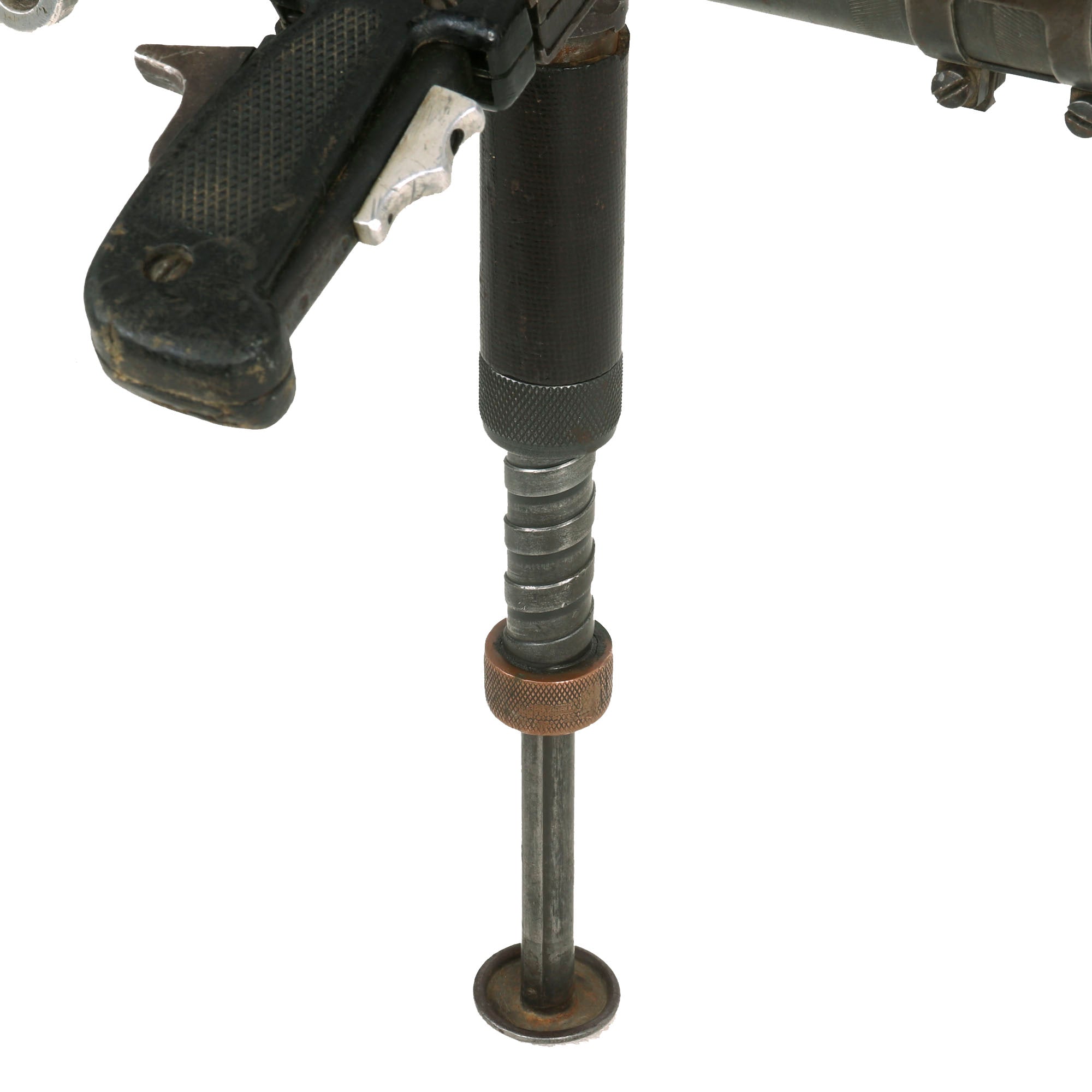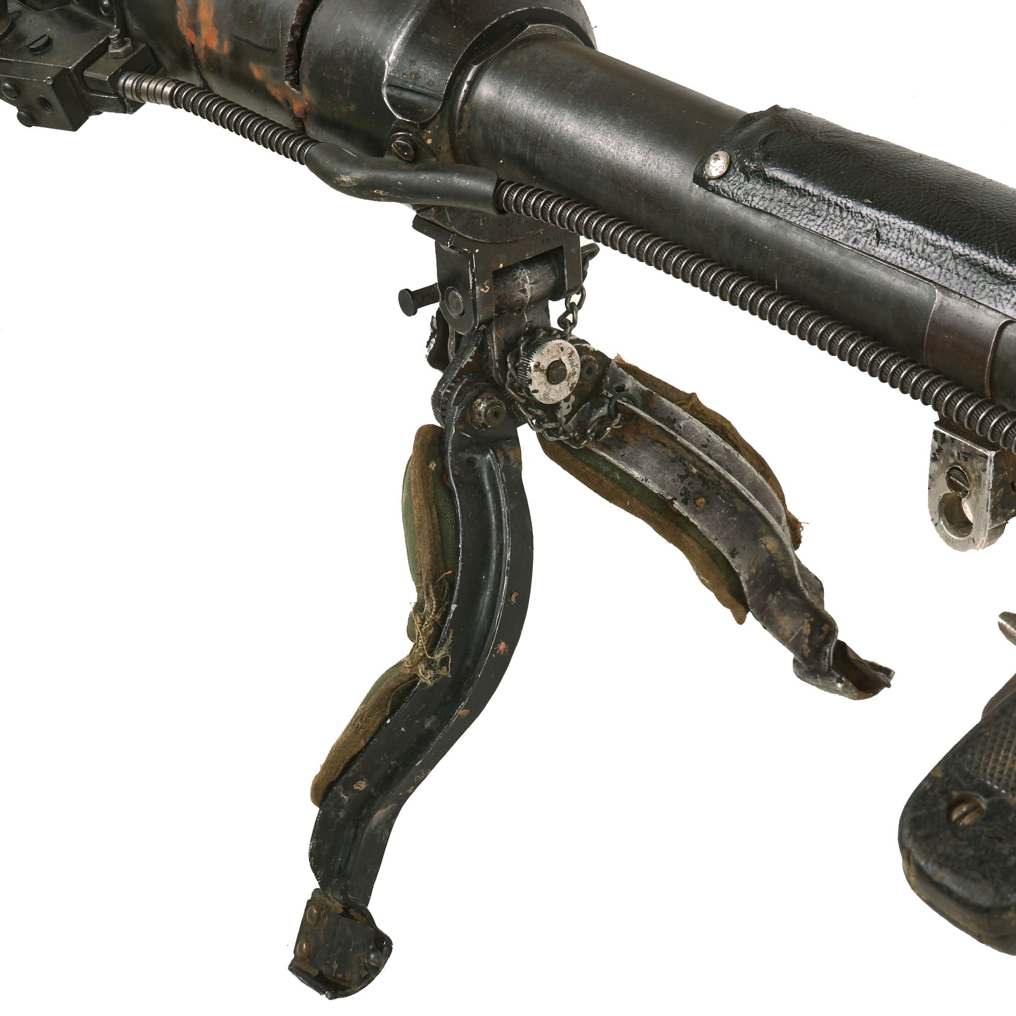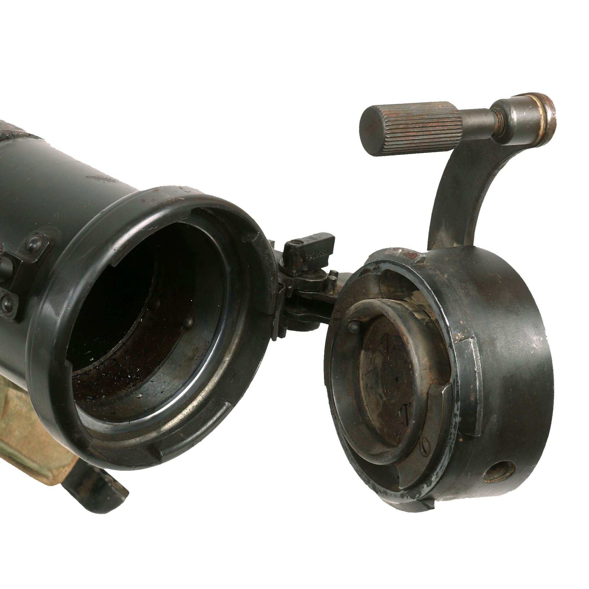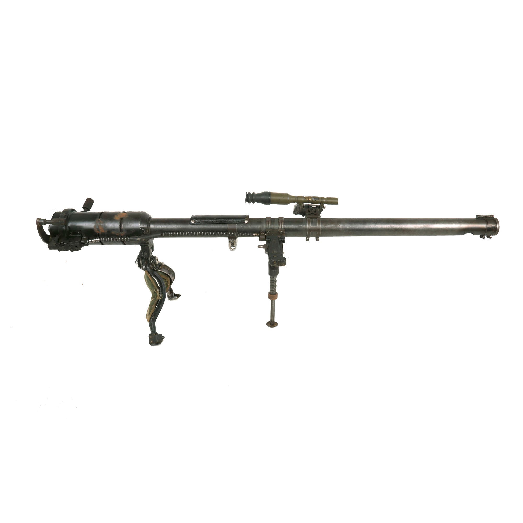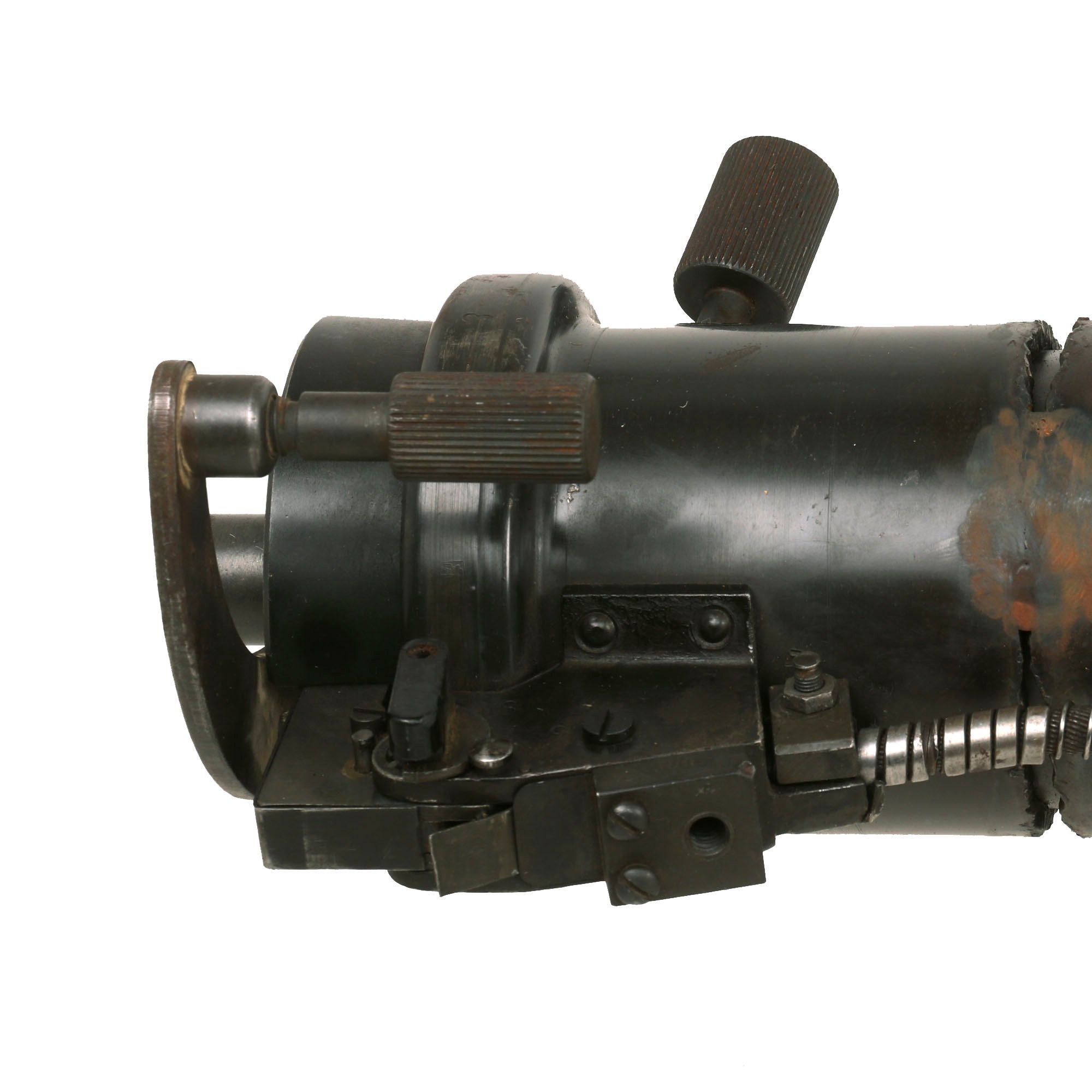 This example is offered in very good condition with the original finish, functional optical scope on the original mount, monopod and shoulder rest / bipod. It also retains the pistol grip and trigger assembly attached to the monopod fitting, and even still has the wiring going back to the breech area. There are some dents and other damage from being handled from over the years, but it still looks fantastic. It weighs approximately 48.5 lbs and is 61 in long.