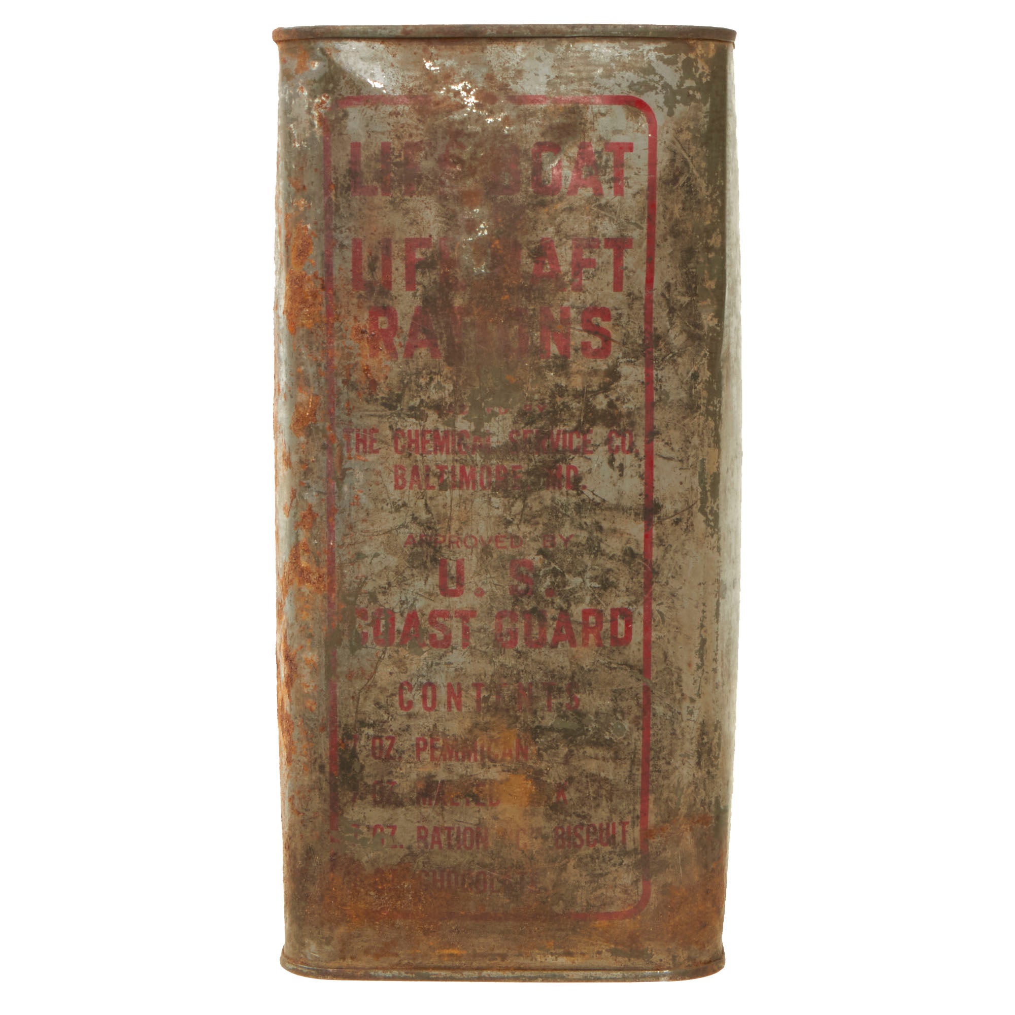 A “lifeboat and liferaft ration” was procured as early as 1942 for use by the Coast Guard and the merchant marines. Components included C biscuits, pemmican, chocolate tablets, and milk tablets. Packaging was in airtight containers. Components were purchased by the Chicago quartermaster Depot for shipment to depots or ports where the complete ration was assembled under the supervision of the Bureau of Marine Inspection and Navigation.