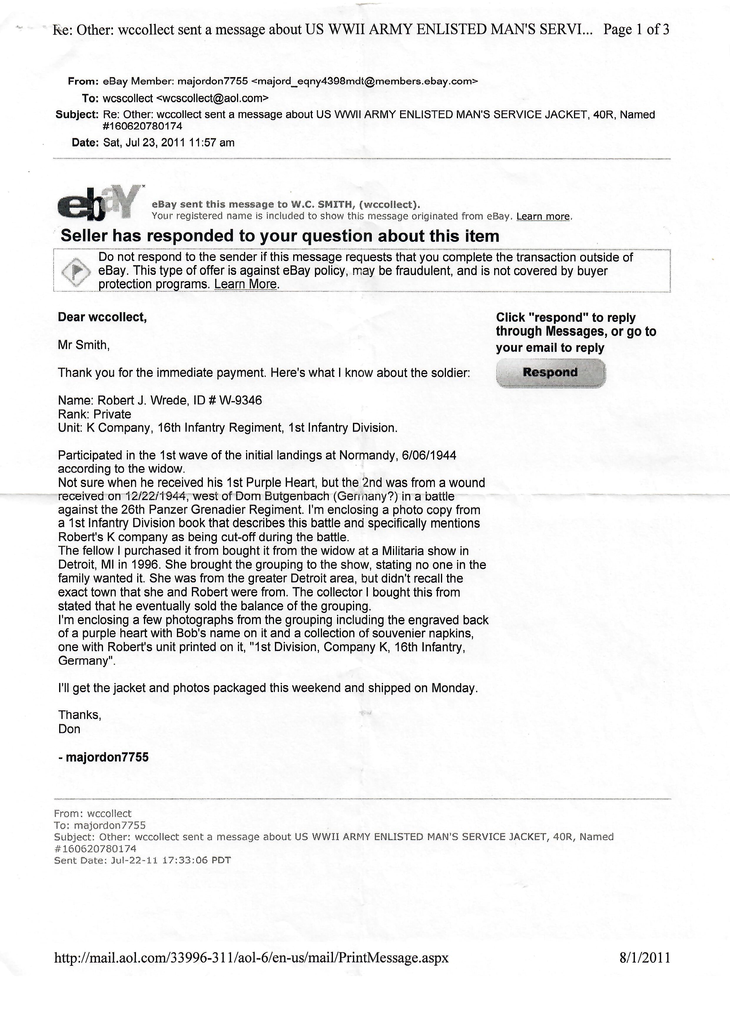Original Item. One-of-a-Kind. This is a lovely 1st Infantry Division uniform grouping with a partial identification to Private Robert J. Wrede, Company K, 16th Infantry Regiment, provided by the original seller in 2011 who notes he received it from the widow. However, we found that Robert J. Wrede actually served in the 80th Infantry Division, and was killed in action on December 22nd, 1944. So we aren’t sure who this uniform belonged to, making for an interesting research project.