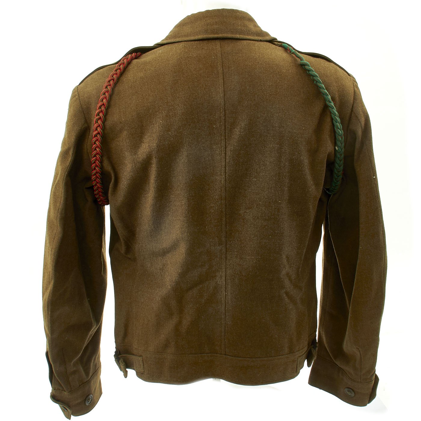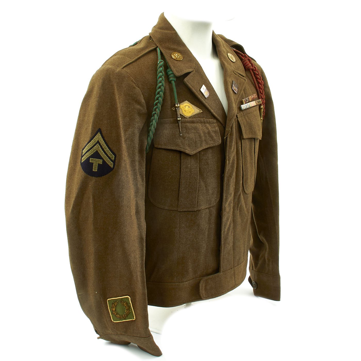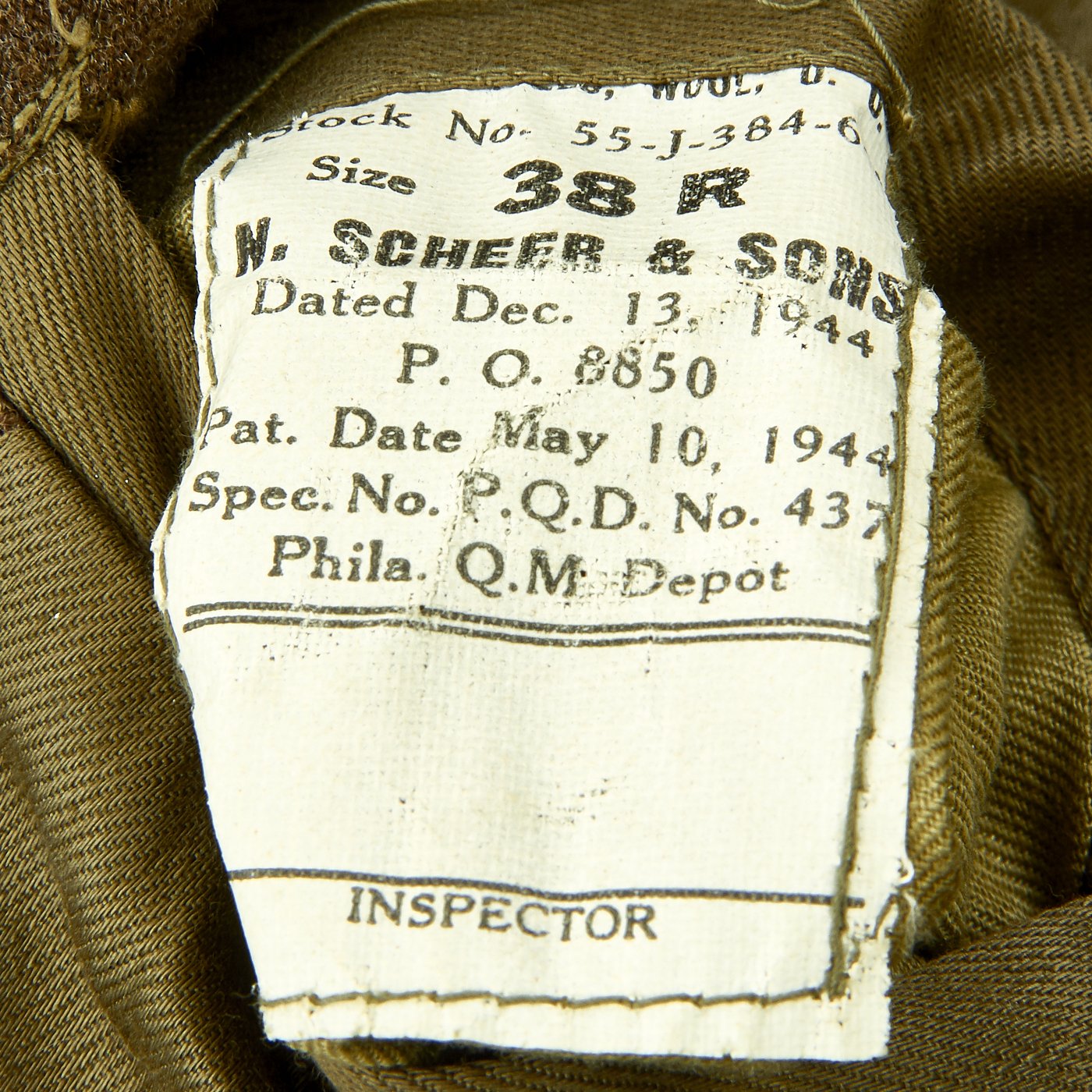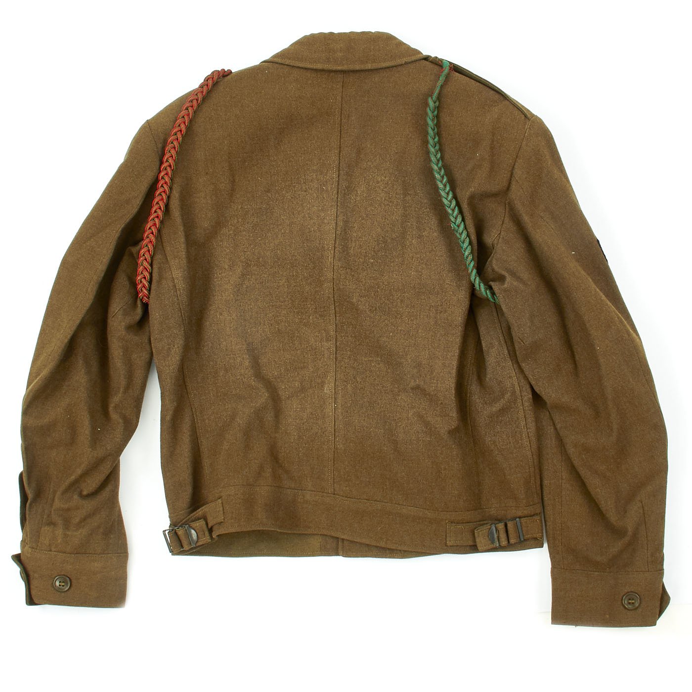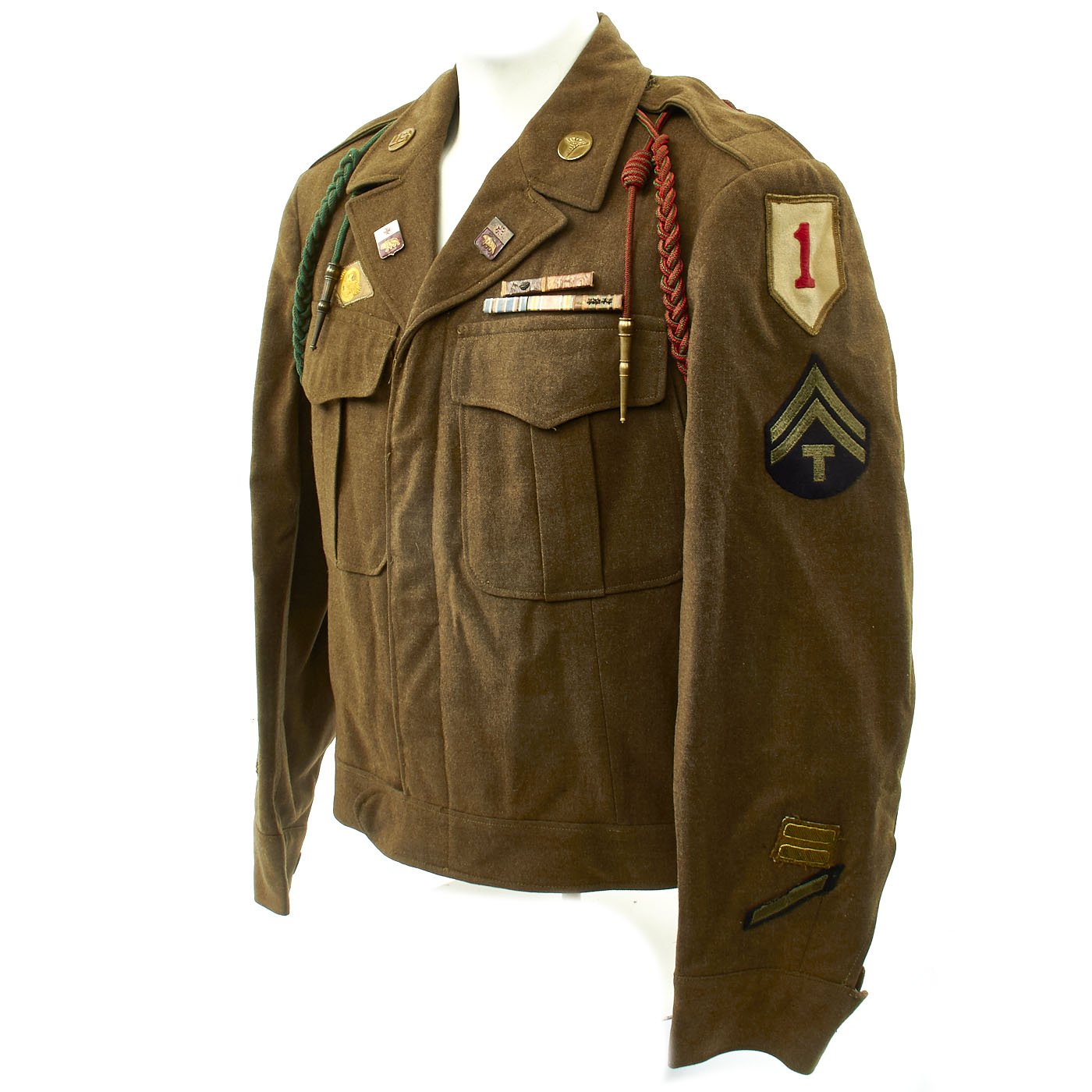 - Original WWII issue Ike Jacket in size 38R in excellent condition with 1st Infantry Division "Big Red One" patch on the left shoulder, enamel 1st Medical Battalion Distinctive Unit Insignia pins, Medical Corps lapel pins and Medal ribbons that include: Purple Heart with Oak Leaf, Good Conduct, American Campaign Medal, WWII Victory, European–African–Middle Eastern Campaign Medal with 5 Campaign Stars, and Ruptured Duck. French Croix De Guerre Fourragère shoulder cord, fBelgian Fourragère shoulder cord. The inside of the jacket is not named and does not have a laundry number. Original maker label for N. Scheer & Sons.