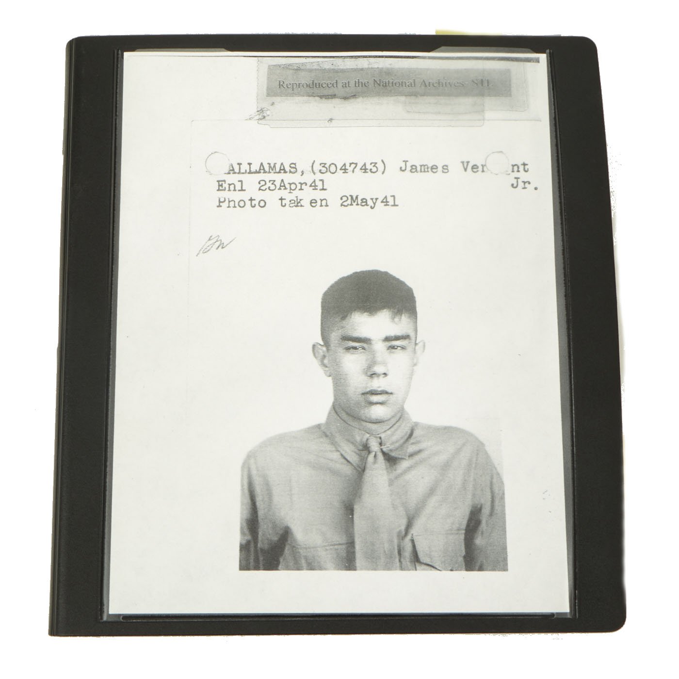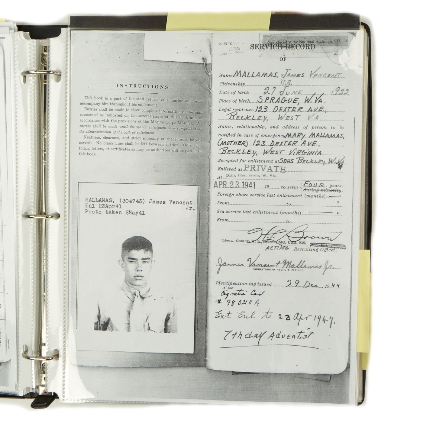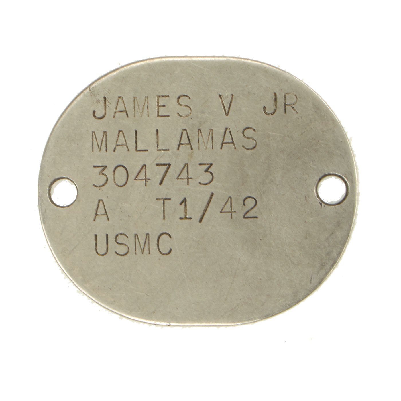 Original Item: One of a Kind: Incredible grouping of items attributed to one of Edson’s Raiders, Sergeant James V. Mallamas, who served with Company “B” 1st Marine Raider Battalion. Mallamas was a well known Raider, having served as former President of the Edson’s Raider Veteran’s Association. What makes this grouping outstanding is the overwhelming amount of research that is included. This grouping is accompanied with an impressive amount of research, consisting of a binder filled with copies and original documents from Mallamas’ service during WWII, veteran’s reunions, and so on.