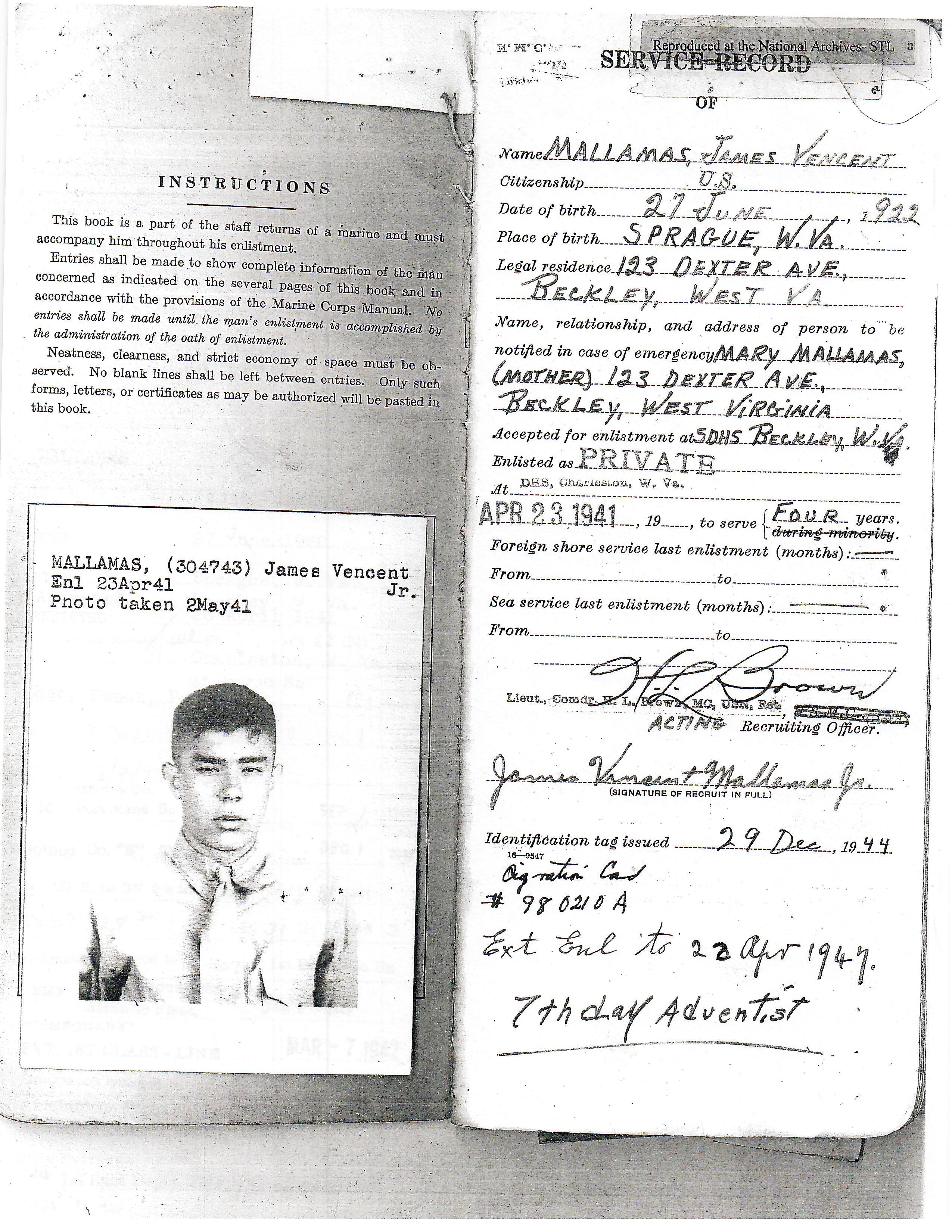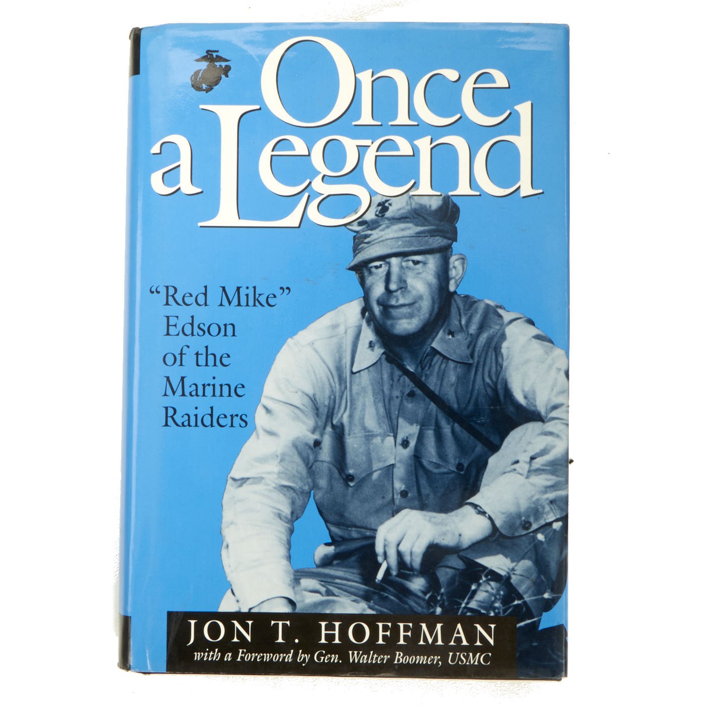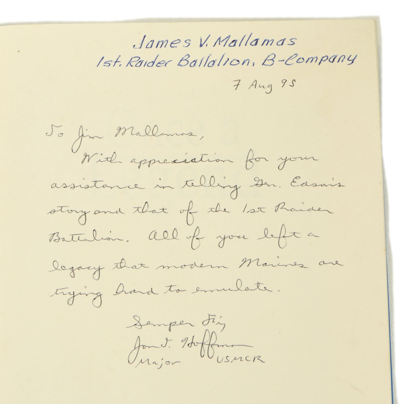 A Marine’s Letters: A Love Story (When Life Was Real) by Gloria Mallamas, and Once a Legend: “Red Mike” Edson of the Marine Raiders by Jon. T. Hoffman. The first work was a collection of Mallamas’ letters to his wife, Gloria. It also includes numerous photographs and short anecdotal stories as told by James Mallamas from his time of service during WWII. The work is extensive to say the least, and offers a glimpse into Mallamas’ life from birth to death. Once a Legend which has an inscription from the author to Mallamas thanking him for his assistance in writing the book.