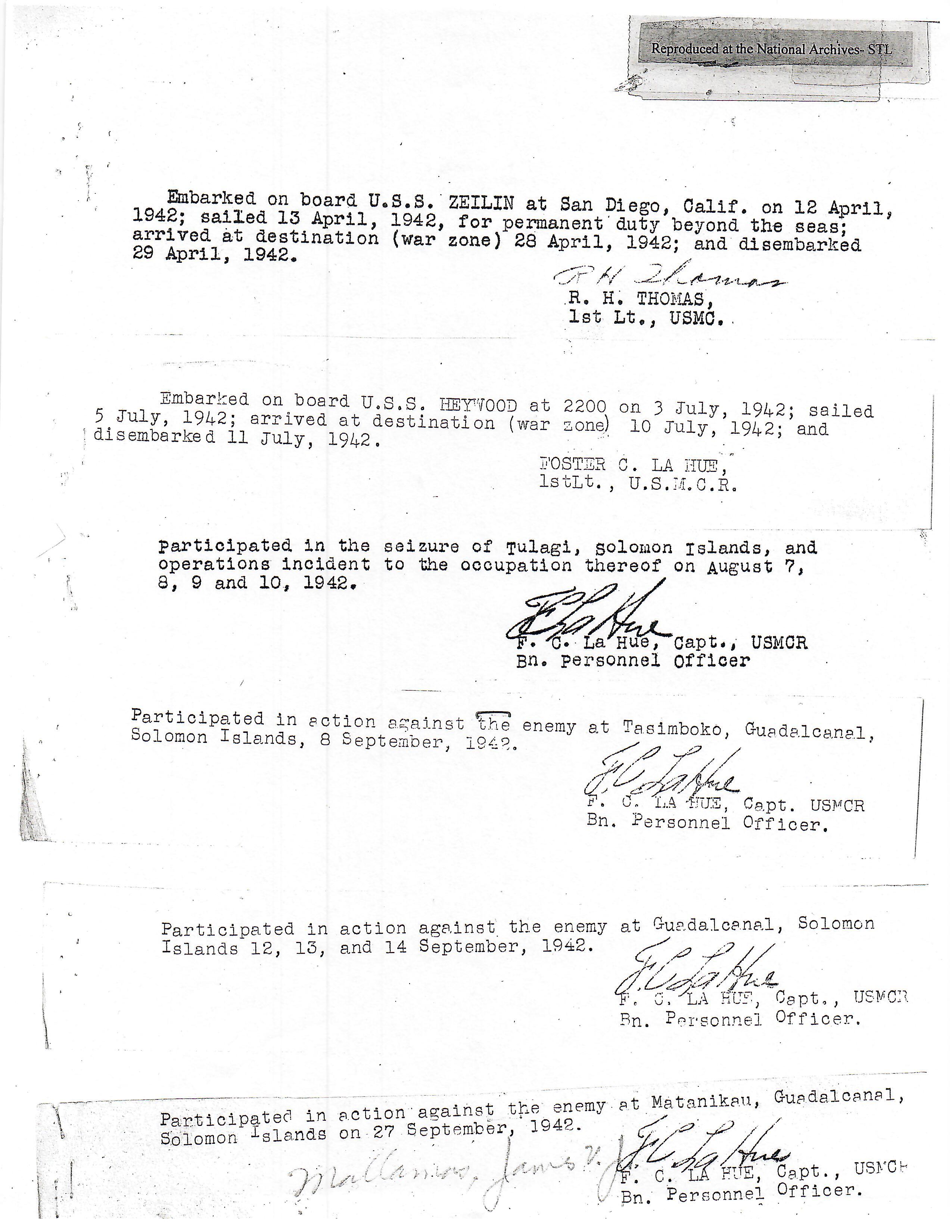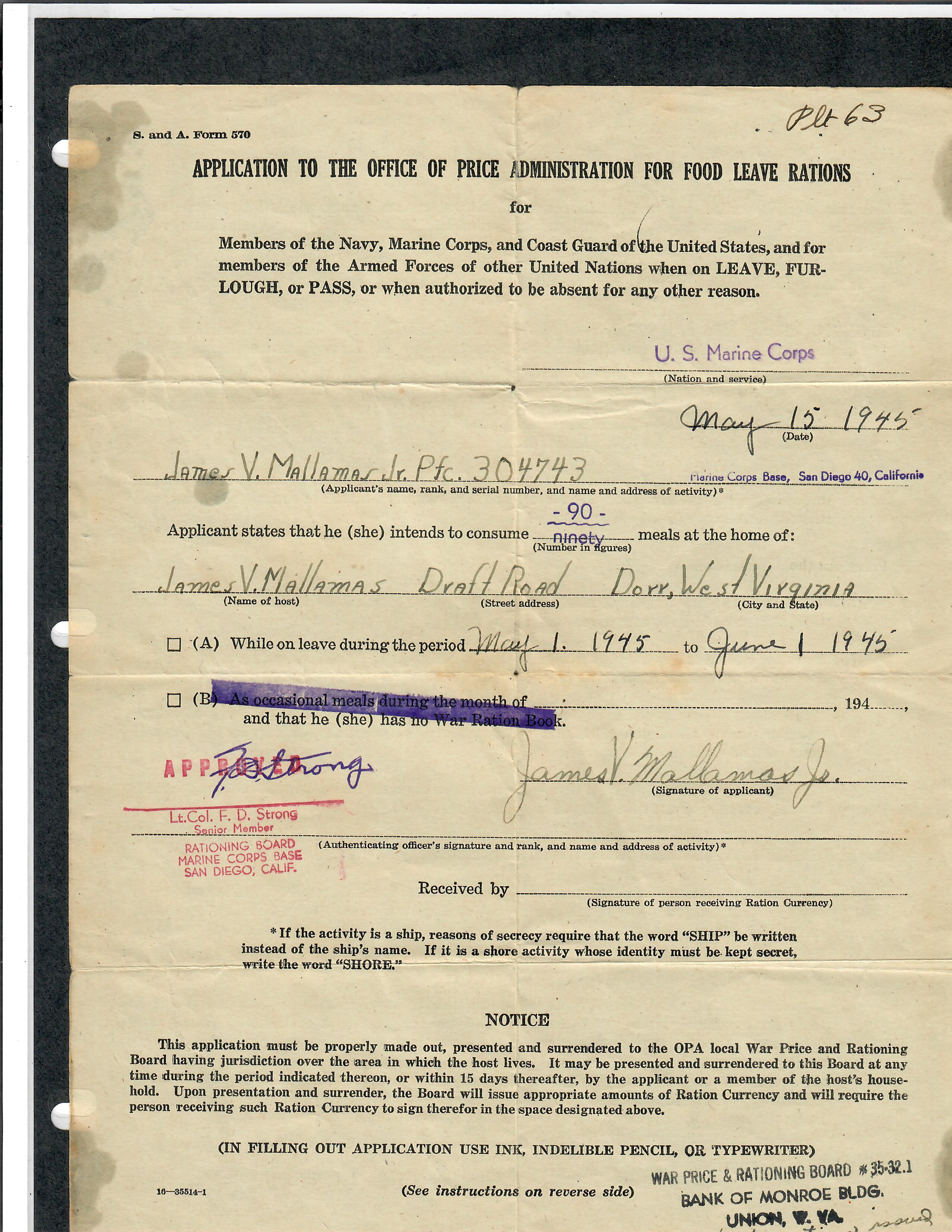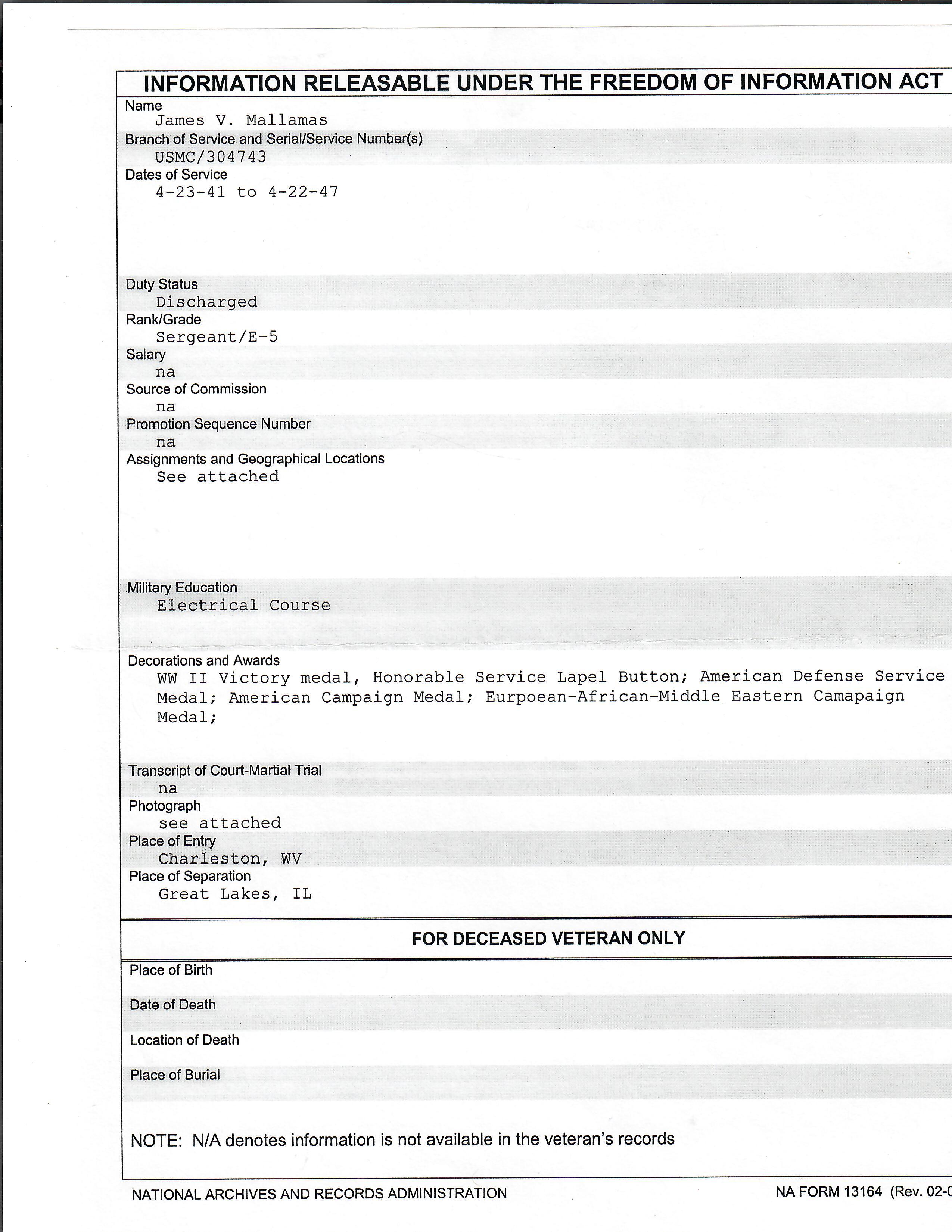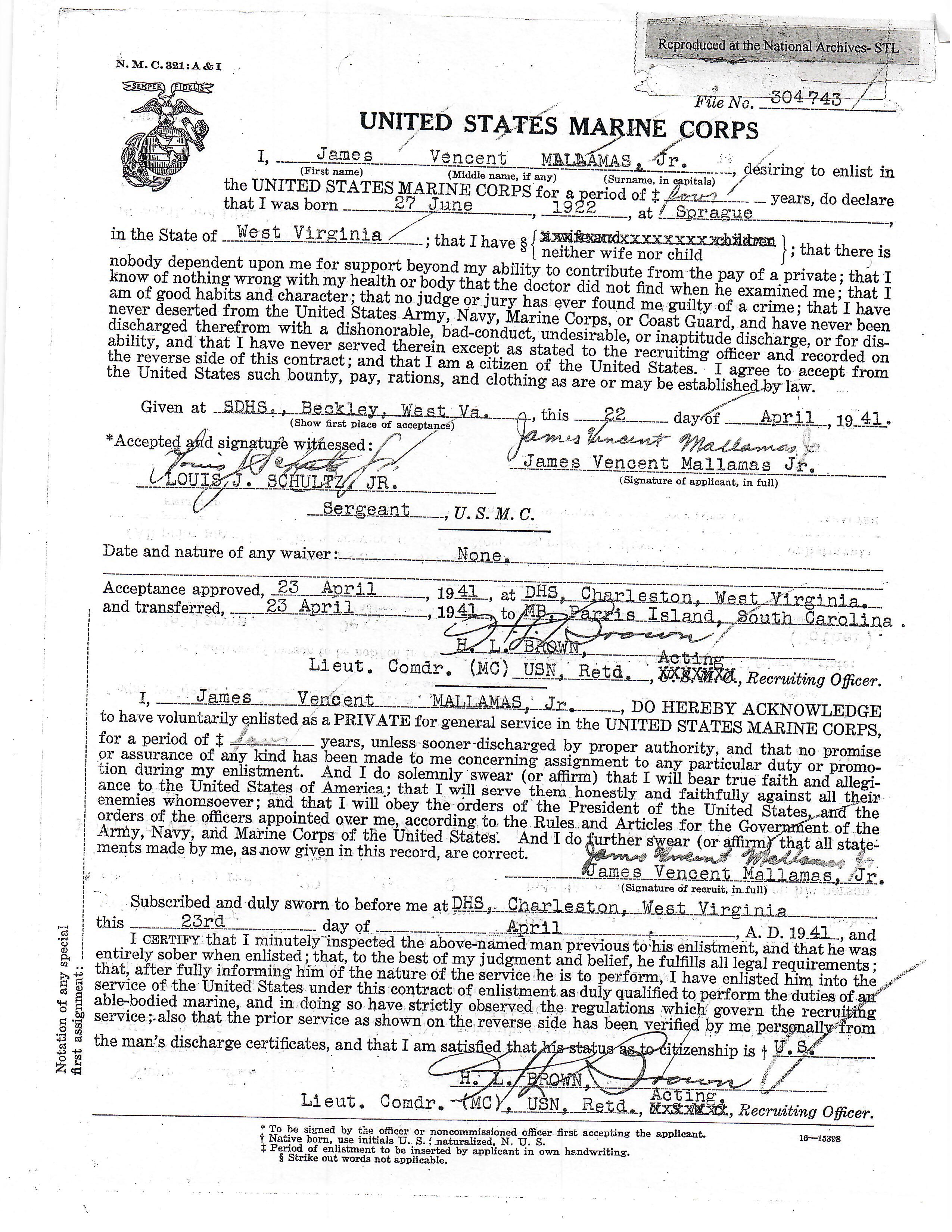 A Marine’s Letters: A Love Story (When Life Was Real) by Gloria Mallamas, and Once a Legend: “Red Mike” Edson of the Marine Raiders by Jon. T. Hoffman. The first work was a collection of Mallamas’ letters to his wife, Gloria. It also includes numerous photographs and short anecdotal stories as told by James Mallamas from his time of service during WWII. The work is extensive to say the least, and offers a glimpse into Mallamas’ life from birth to death. Once a Legend which has an inscription from the author to Mallamas thanking him for his assistance in writing the book.