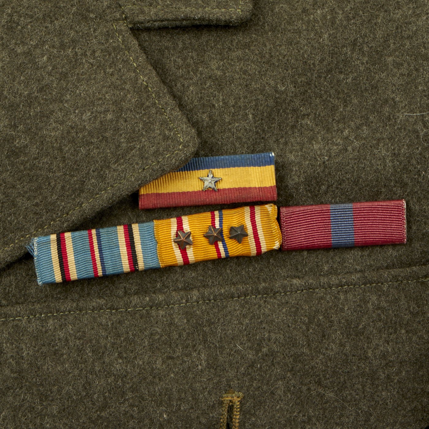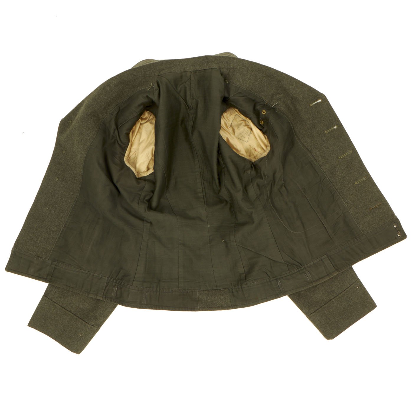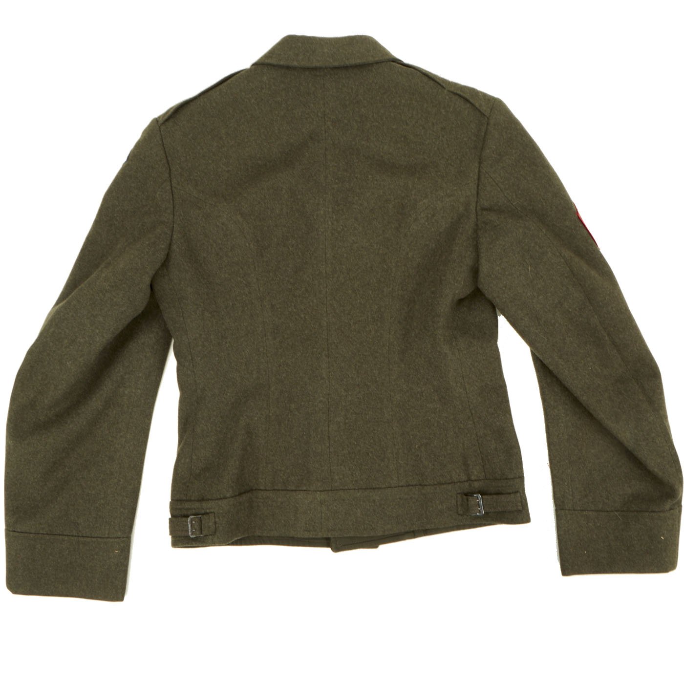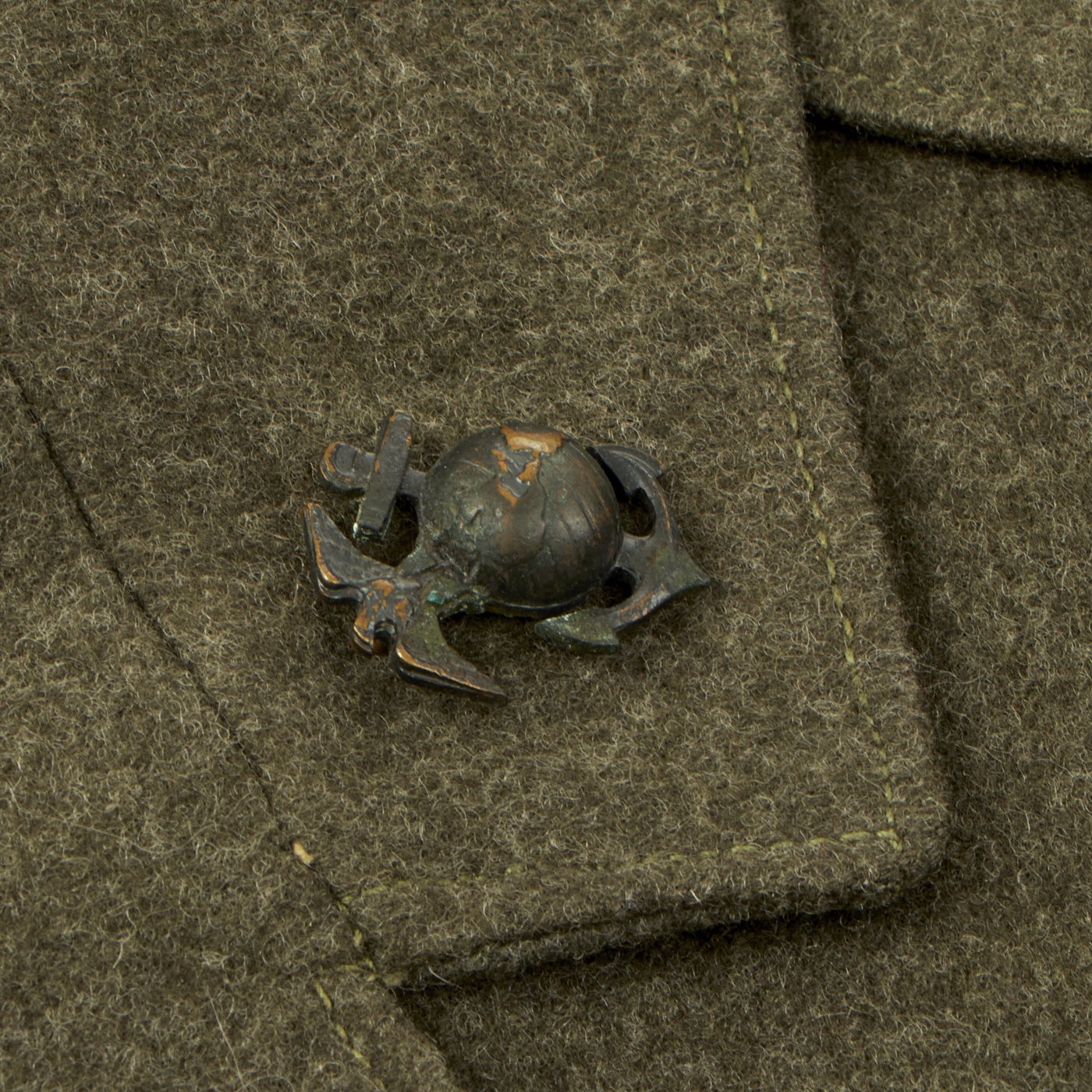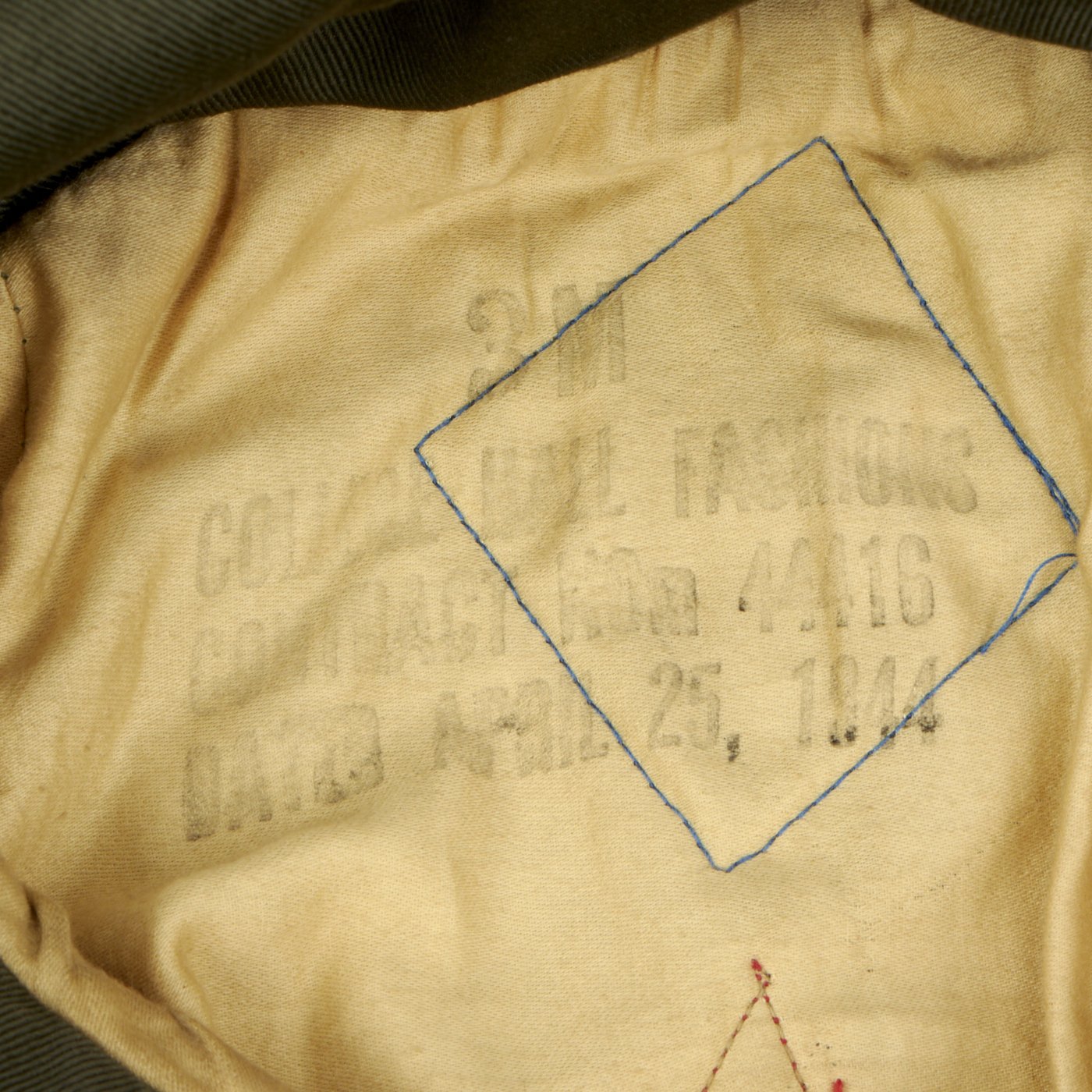 Mallamas’ Forest Green Dress Uniform Coat is contract dated April 25, 1944. It is an interesting unique tailor modified piece which appears to have been converted from a four-pocket coat into a short Vandegrift style jacket. It is named to Mallamas inside the armpit. All insignia is original to the garment.