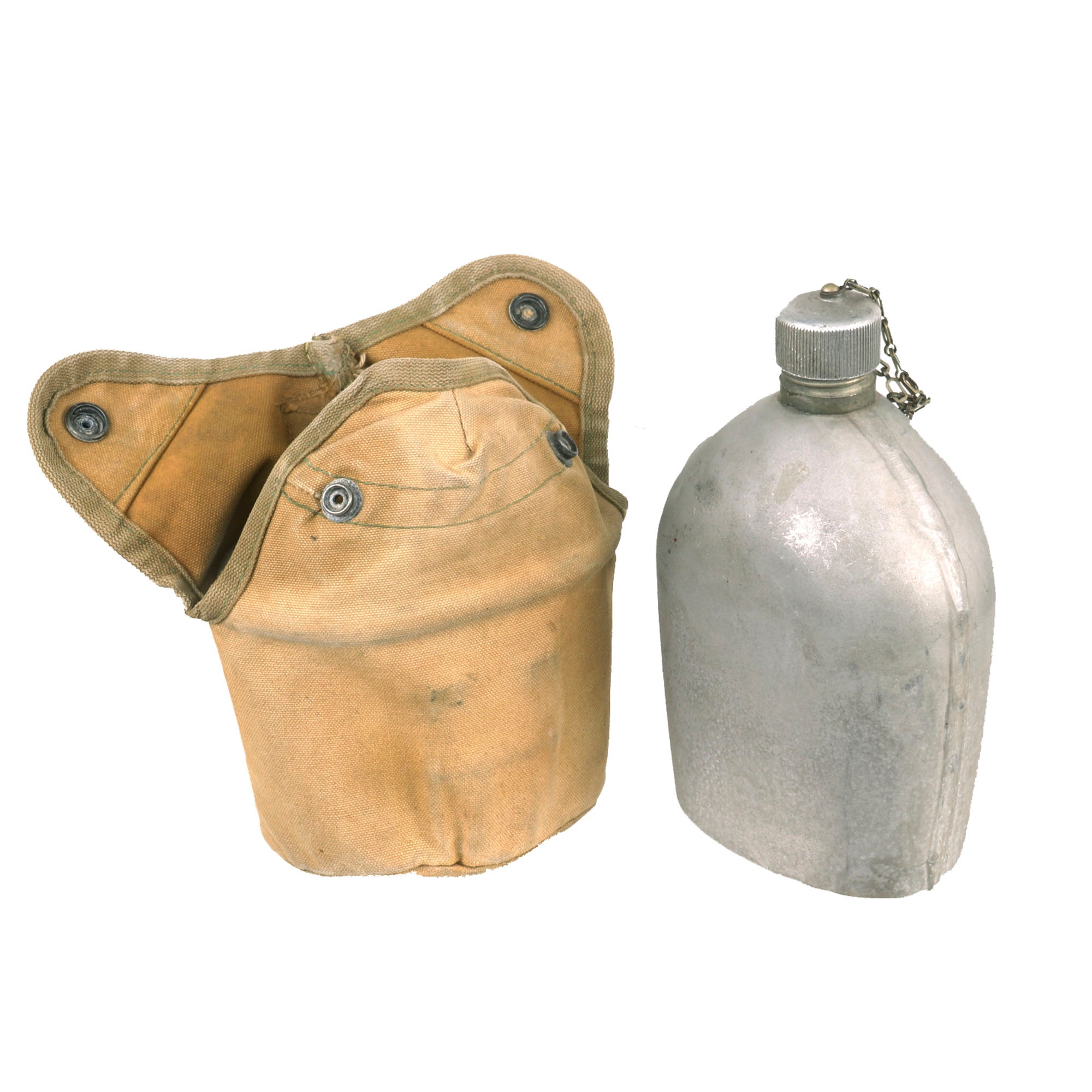 Original Item. Only One Available. This is a scarce WWII U.S.M.C. Canteen set with both the early 1st Pattern cover with Durasnaps, and a reused WWI Canteen & cup.