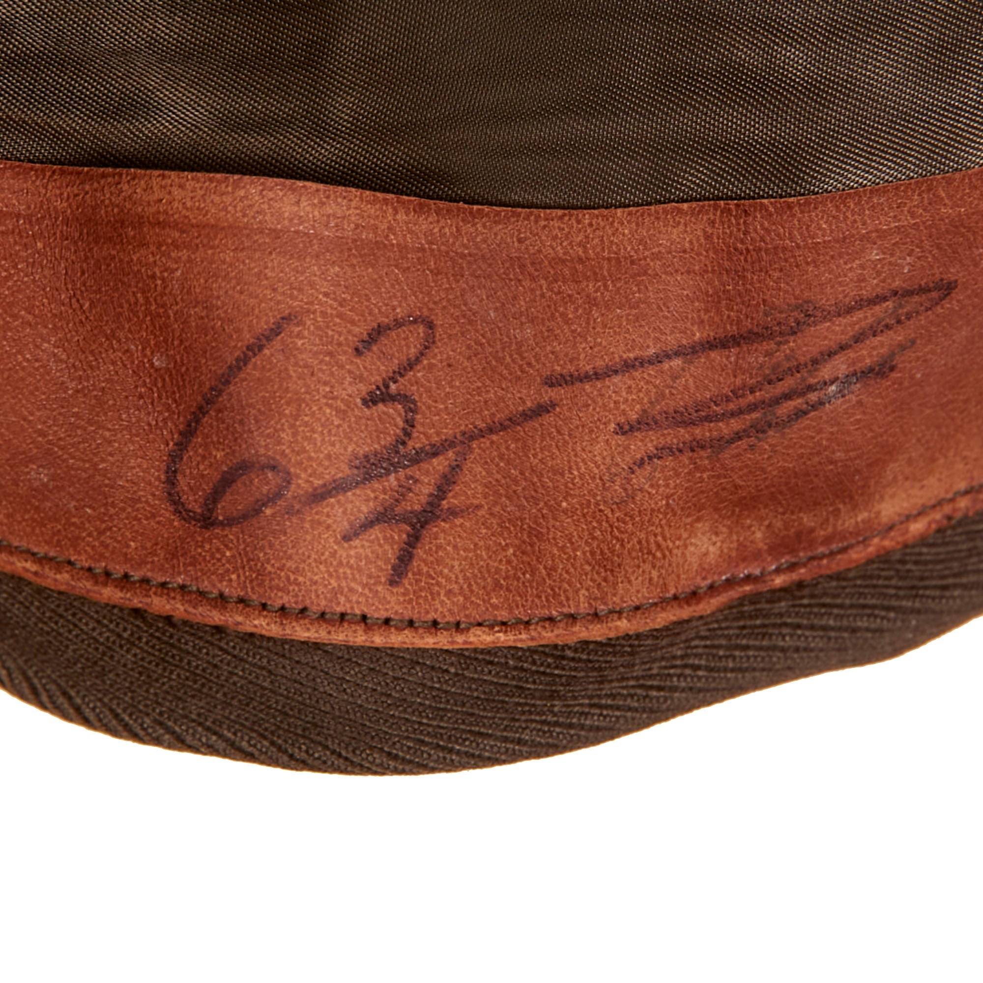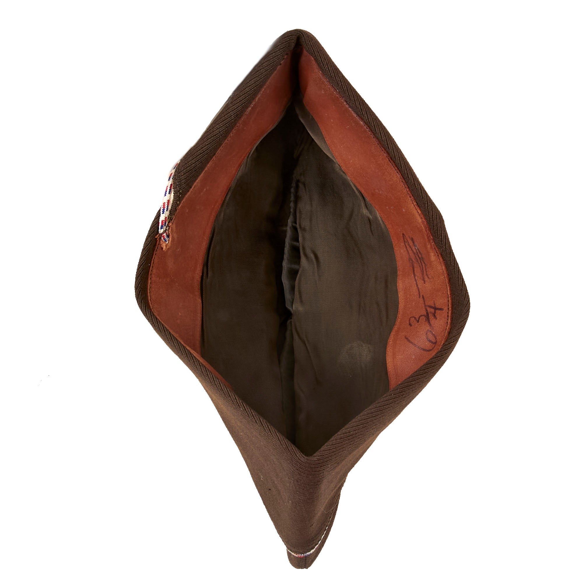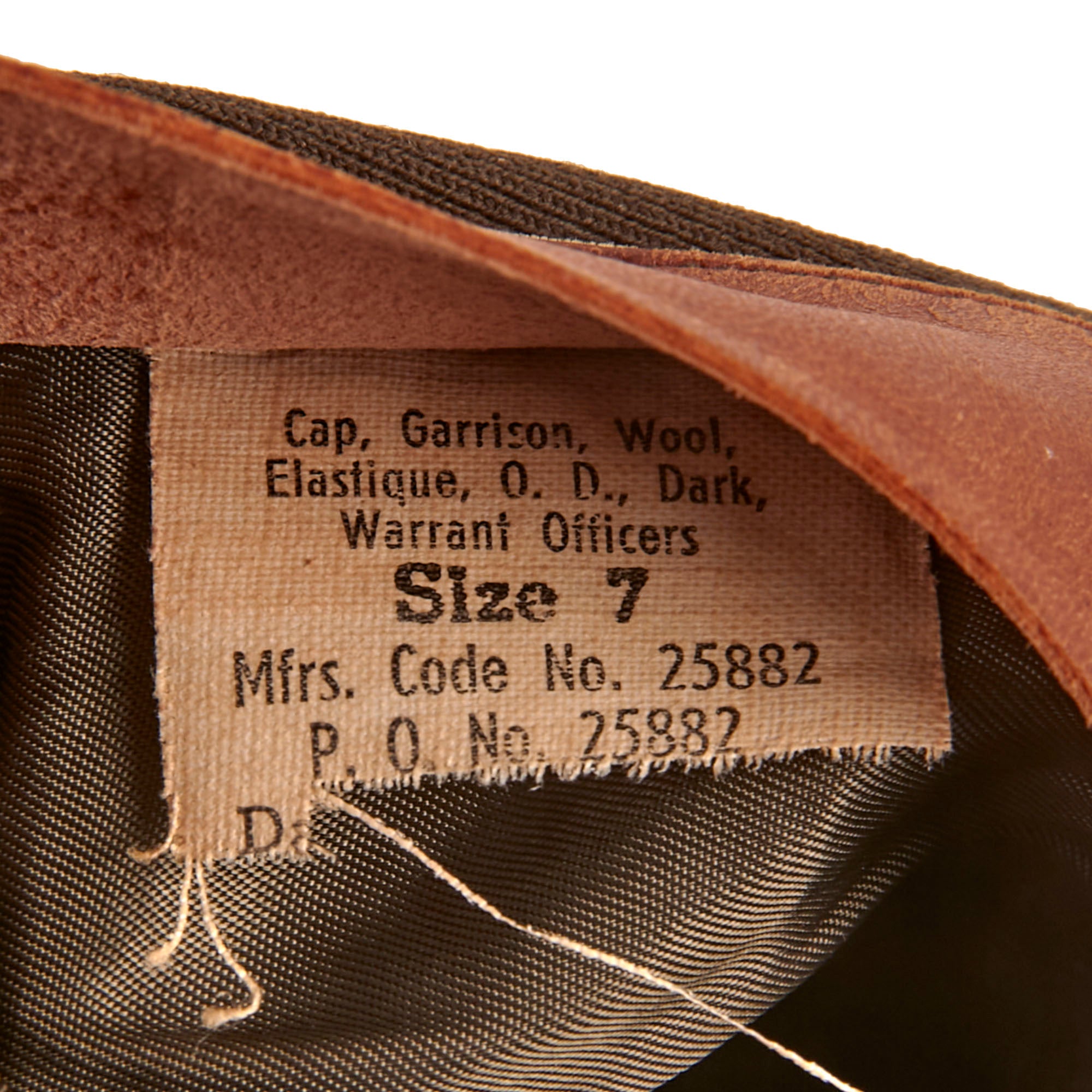 This example in OD Green features the distinctive white piping with red/blue stripes of the First Special Service Force, sewn on with the correct OD green thread. The front of the cap bears a pinback silver Captain's insignia on the left side, which looks to have been with the cap for some time. The interior of the cap is lined with OD green rayon, and features a leather sweatband around the entire circumference. There is a small 7 size tag visible, and under the sweatband is the original label identifying the cap as a Cap, Garrison, Wool, Elastique, O. D., Dark, Warrant Officers in Size 7.