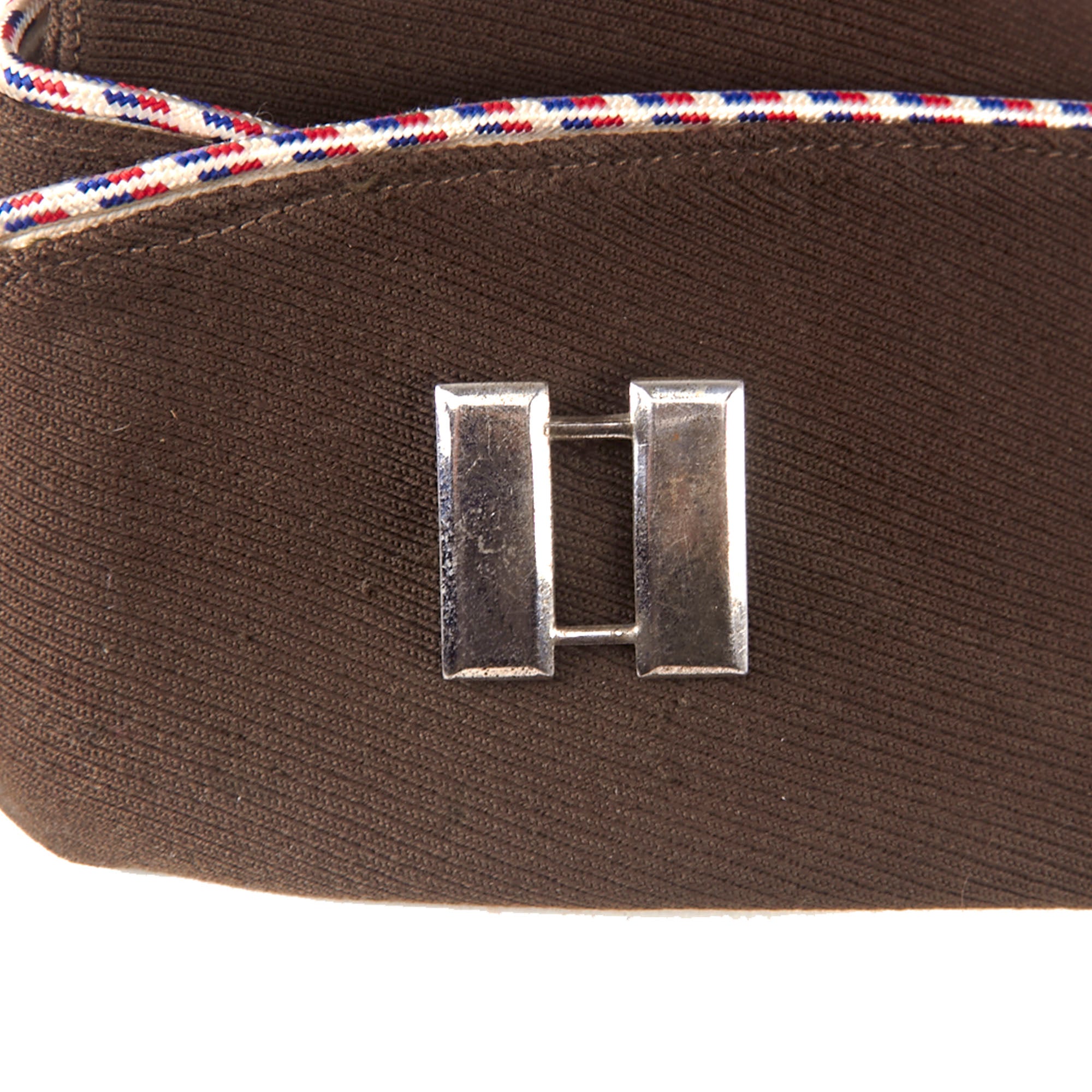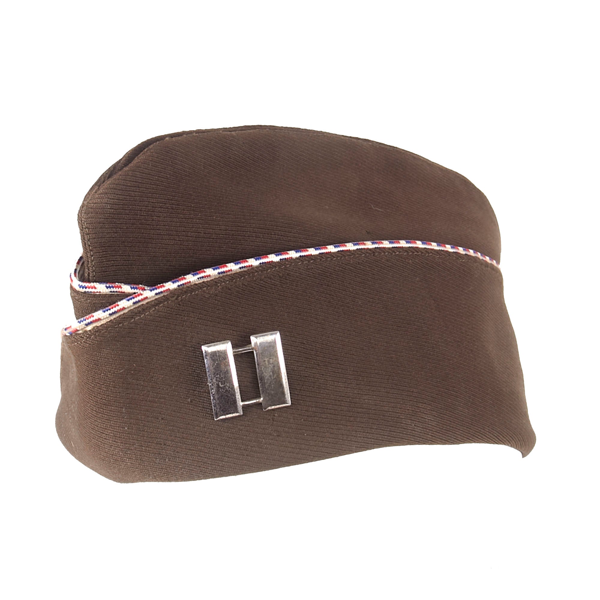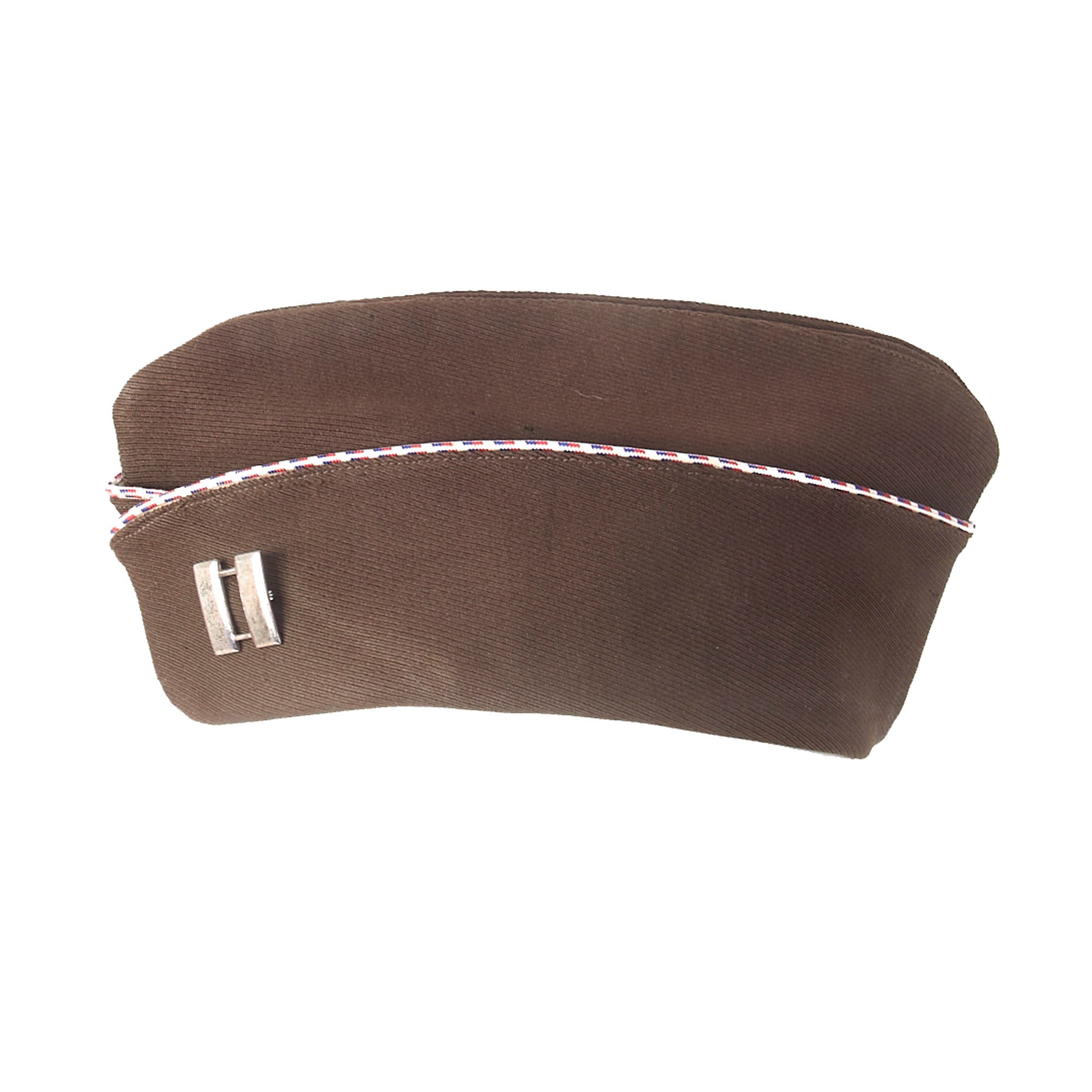 Original Items: Only One Available. This is an excellent Captain’s overseas cap, often referred to as a Side Cap or “Garrison Cover”. A side cap is a military cap that can be folded flat when not being worn. It is also known as a garrison cap or flight cap in the United States, wedge cap in Canada, or field service cap in the United Kingdom; or in vulgar slang as a cunt cap. In form the side cap is comparable to the glengarry, a folding version of the Scottish military bonnet. It has been associated with various military forces since the middle of the 19th century, as well as various civilian organizations.
