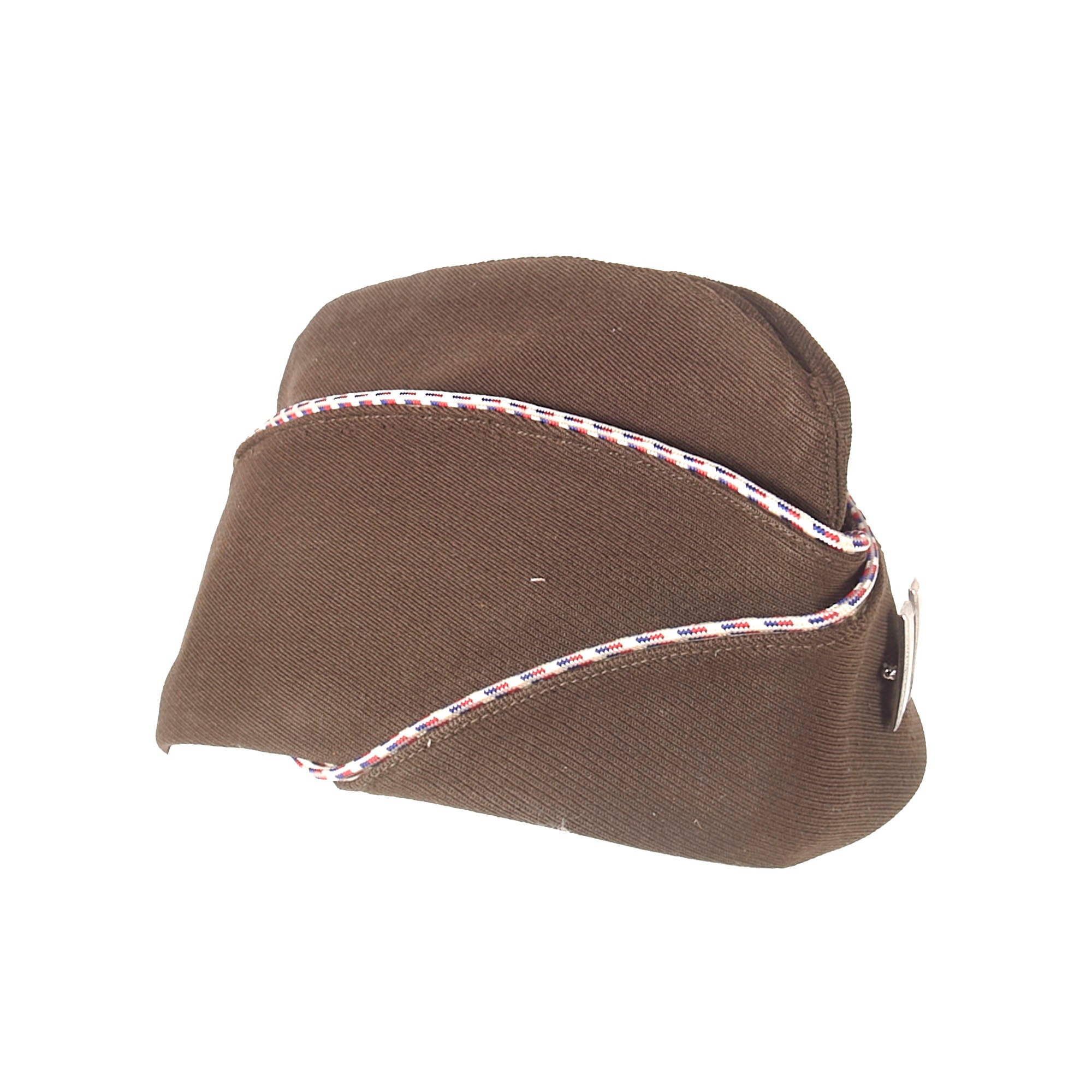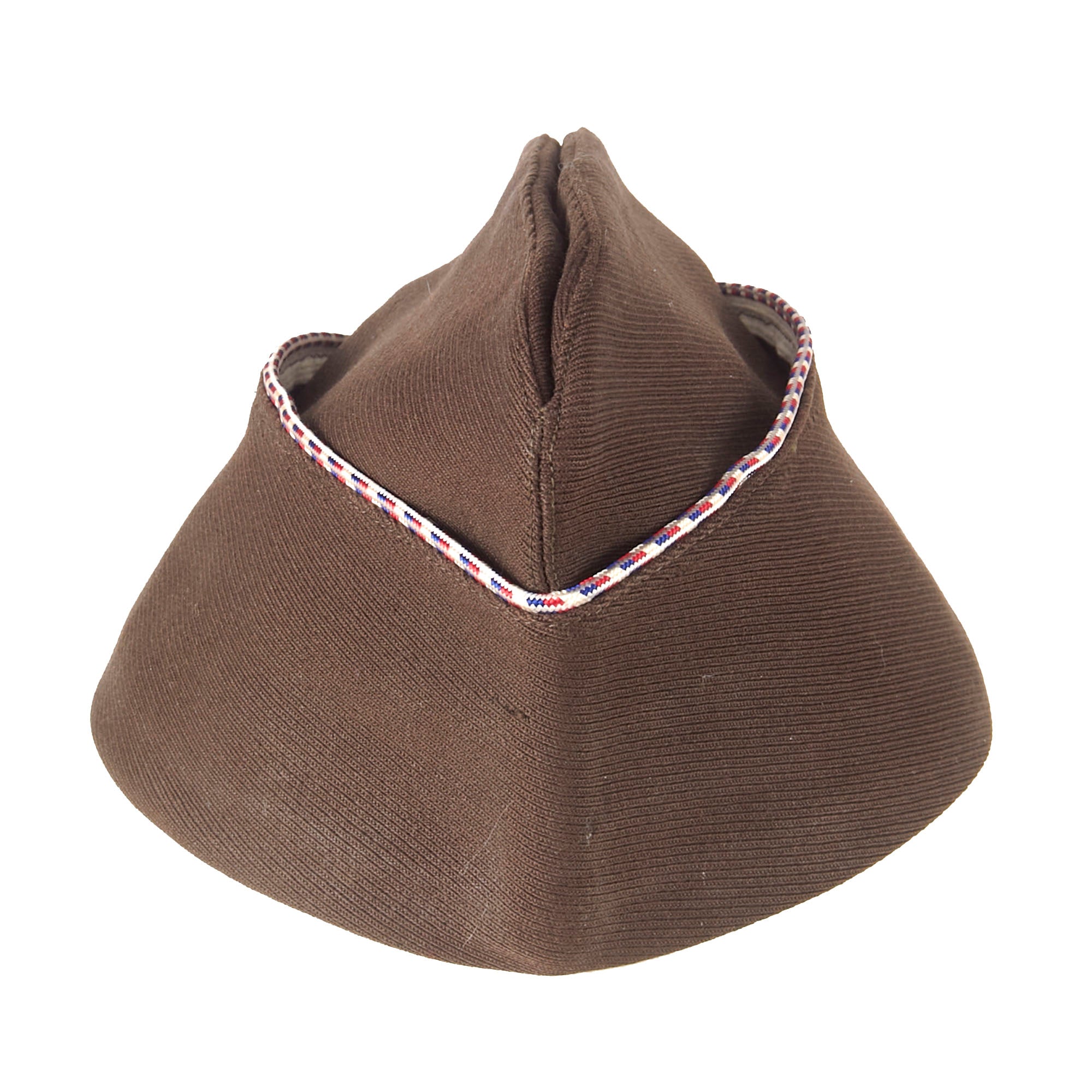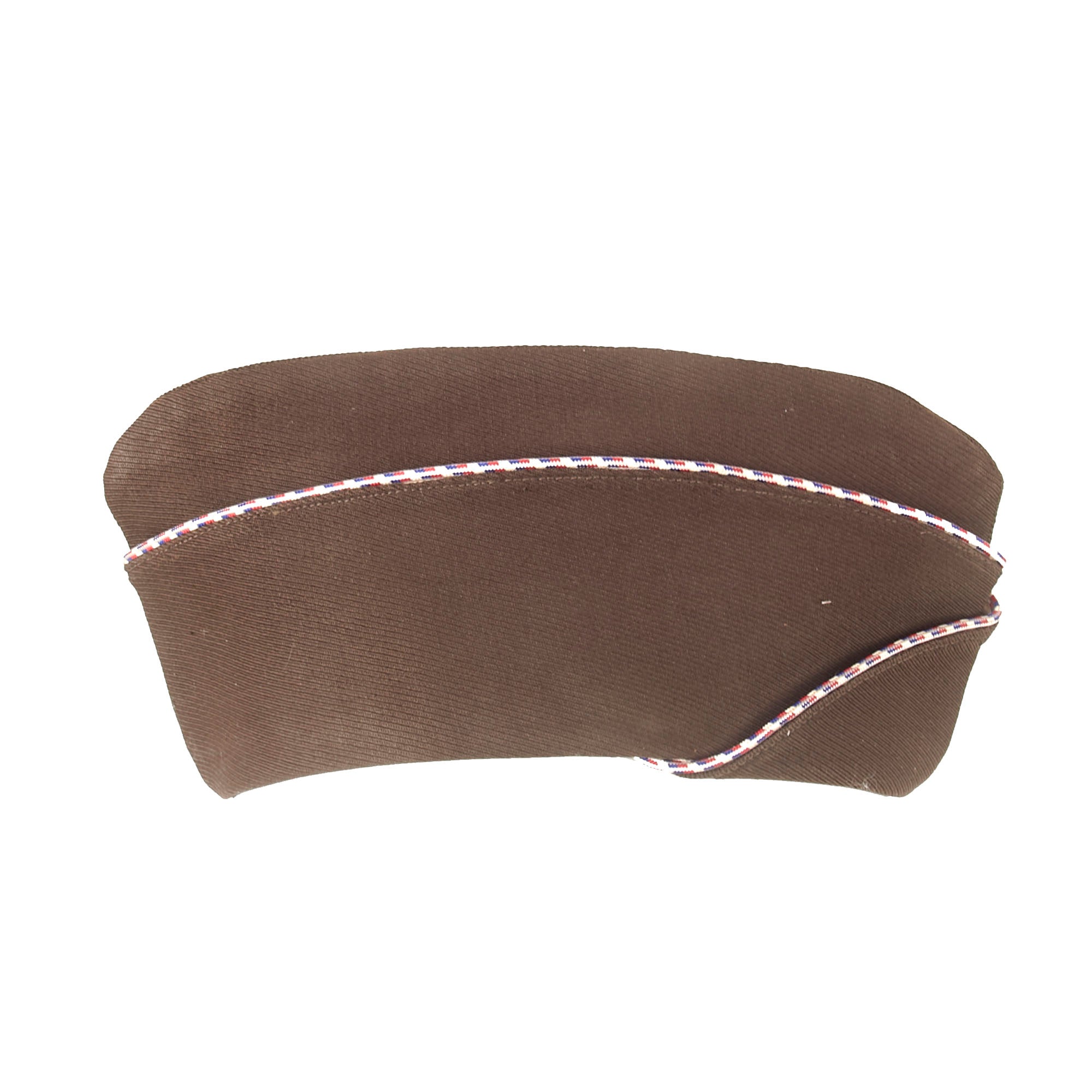 Original Items: Only One Available. This is an excellent Captain’s overseas cap, often referred to as a Side Cap or “Garrison Cover”. A side cap is a military cap that can be folded flat when not being worn. It is also known as a garrison cap or flight cap in the United States, wedge cap in Canada, or field service cap in the United Kingdom; or in vulgar slang as a cunt cap. In form the side cap is comparable to the glengarry, a folding version of the Scottish military bonnet. It has been associated with various military forces since the middle of the 19th century, as well as various civilian organizations.