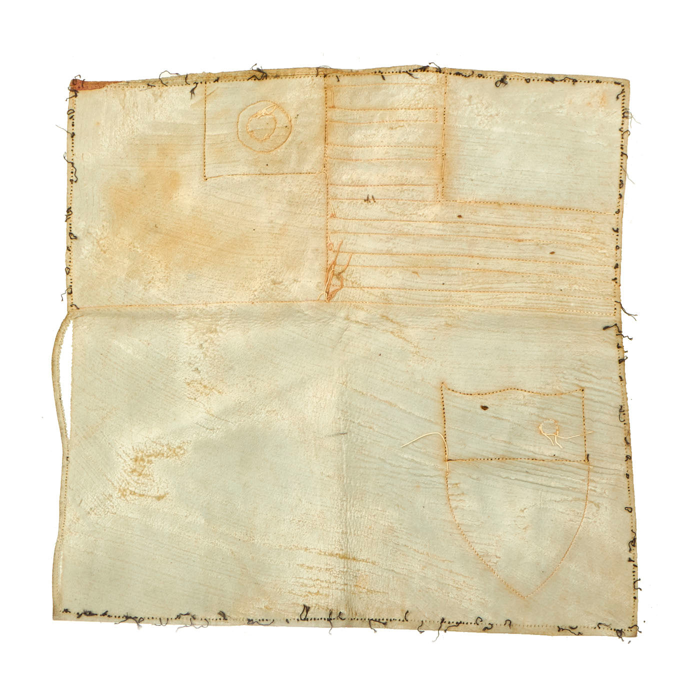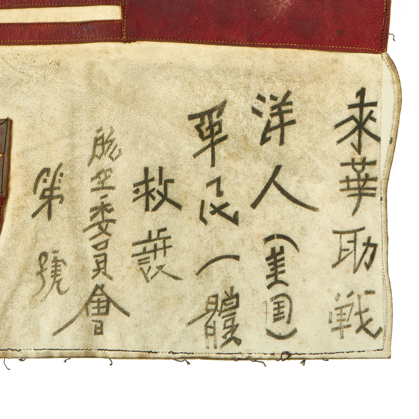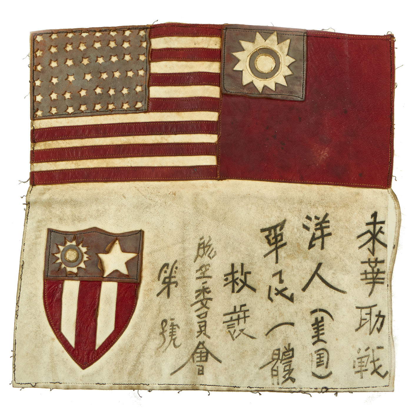 The blood chit is in fantastic condition and shows evidence of having been sewn into the lining of an A2 flight jacket, as does the patch. The leather chit features an American flag to the left of the Chinese National flag with Chinese Characters at the bottom to the right of a leather CBI shield. The chit measures approximately 10” by 9 ⅞” .