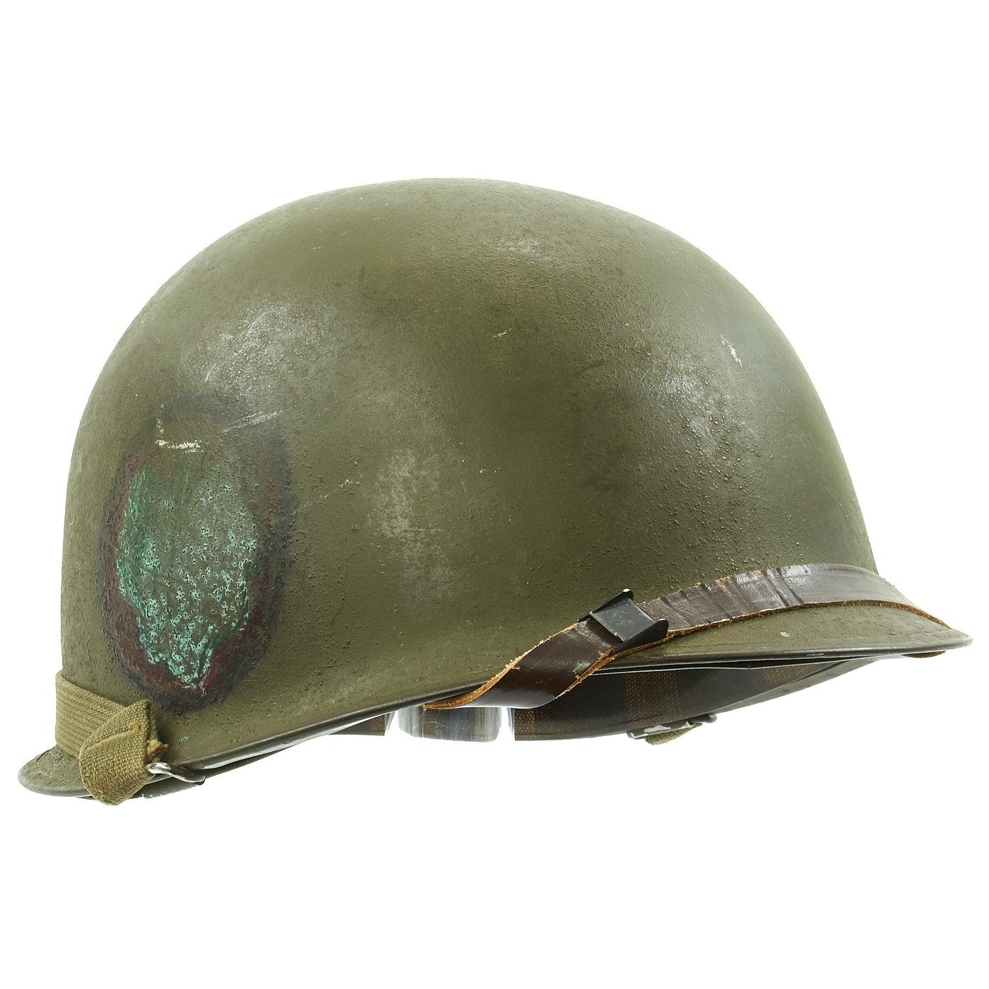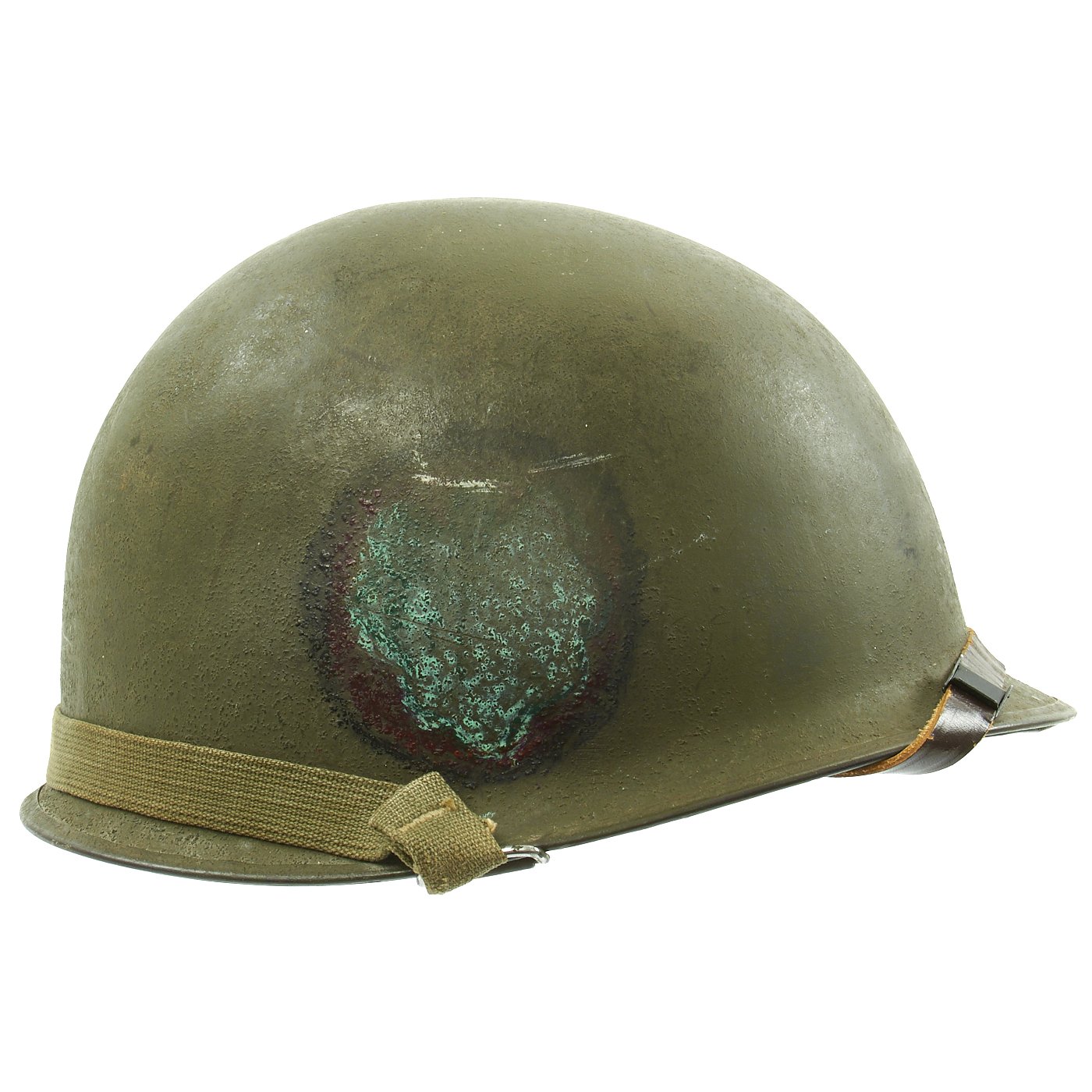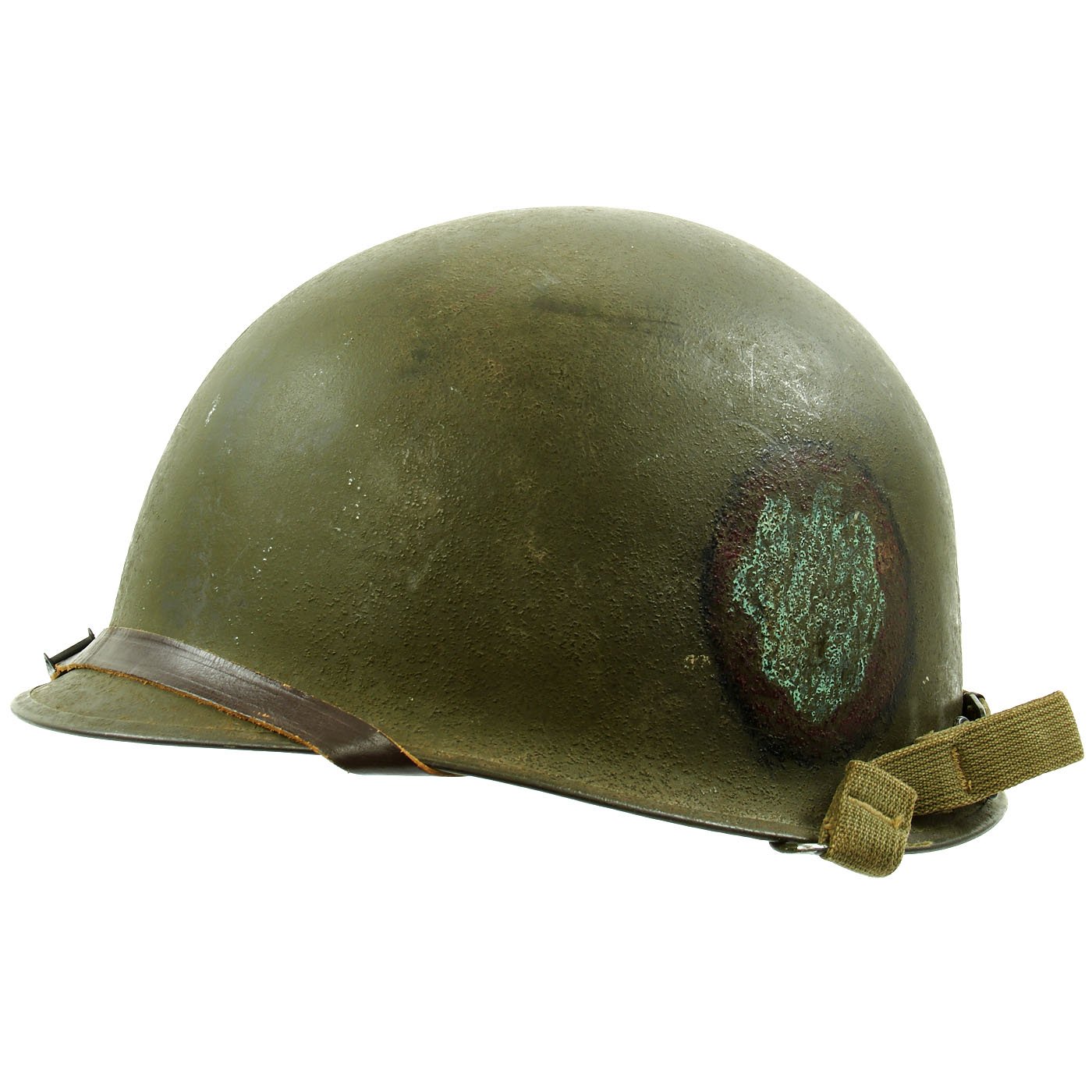 Original Item: One-of-a-kind. This rare helmet is a fine example and still retains all of its original WW2 parts and paint. Of most note are hand painted 24th division insignia to the sides of the shell. The steel shell is stamped S indicating Schlueter manufactured this helmet. The rim is both rust resistant and has "non-magnetic qualities" that reduced the chance of error readings when placed around certain sensitive equipment (such as a compass). This helmet features the correct front seam rim and later war swivel bales.