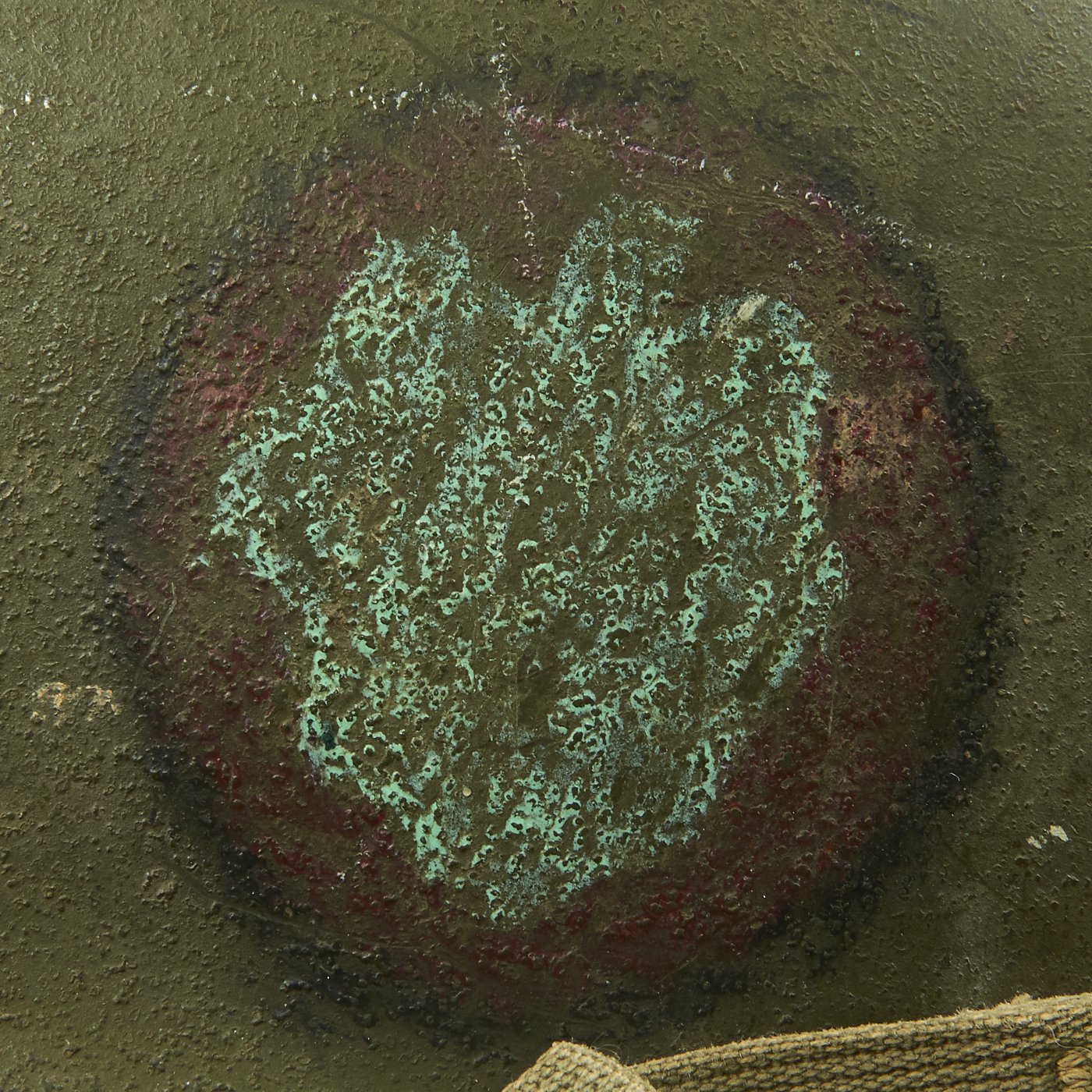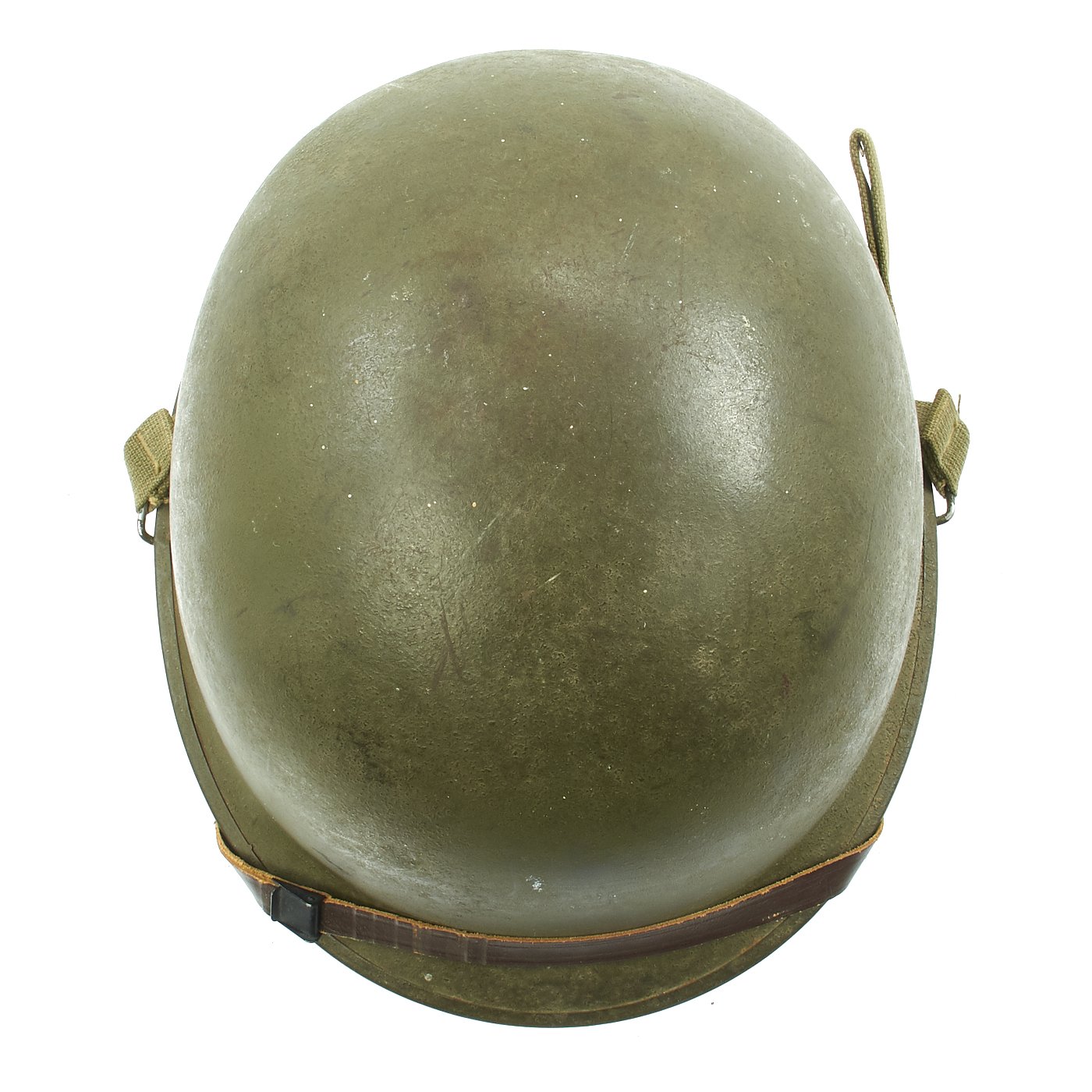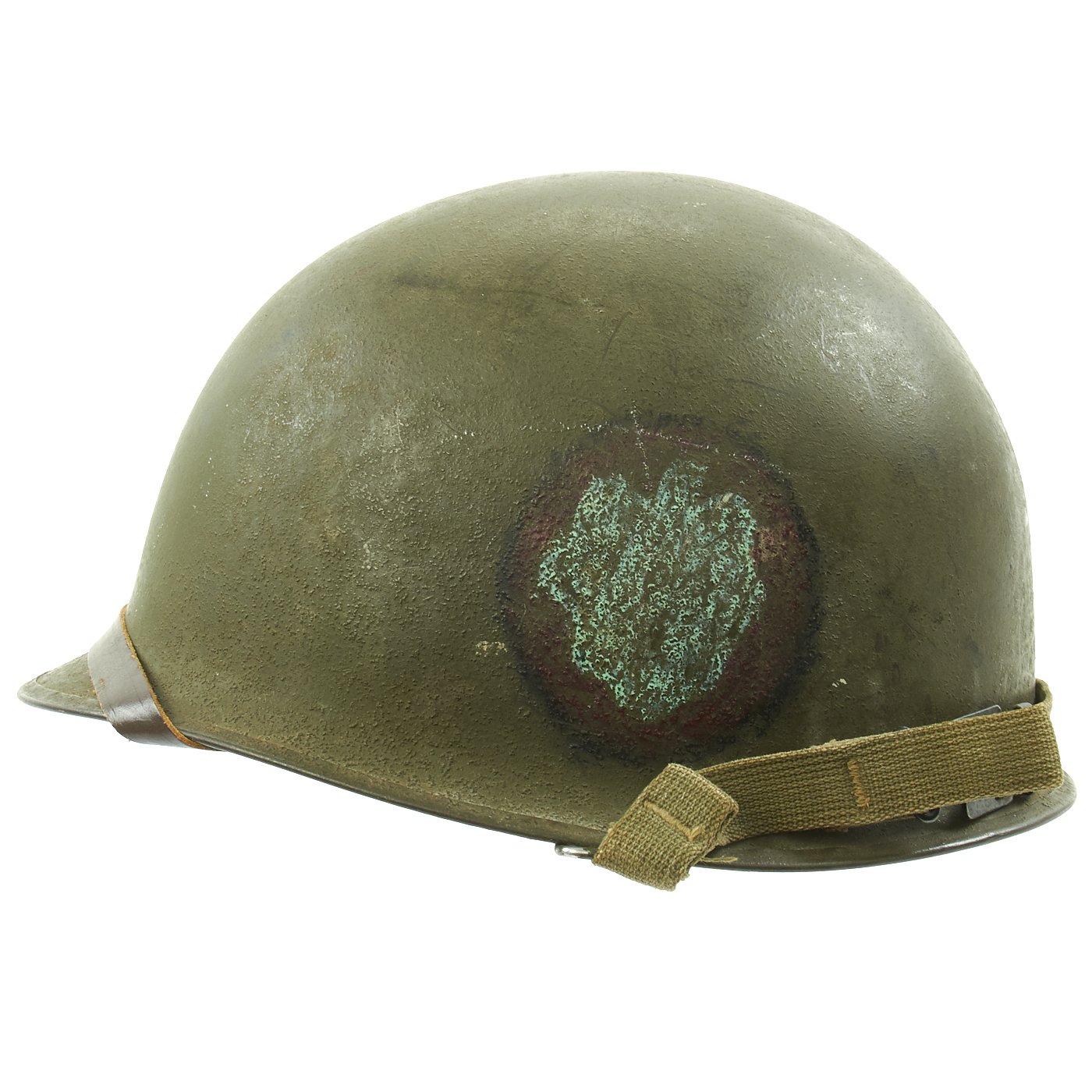 Original Item: One-of-a-kind. This rare helmet is a fine example and still retains all of its original WW2 parts and paint. Of most note are hand painted 24th division insignia to the sides of the shell. The steel shell is stamped S indicating Schlueter manufactured this helmet. The rim is both rust resistant and has "non-magnetic qualities" that reduced the chance of error readings when placed around certain sensitive equipment (such as a compass). This helmet features the correct front seam rim and later war swivel bales.