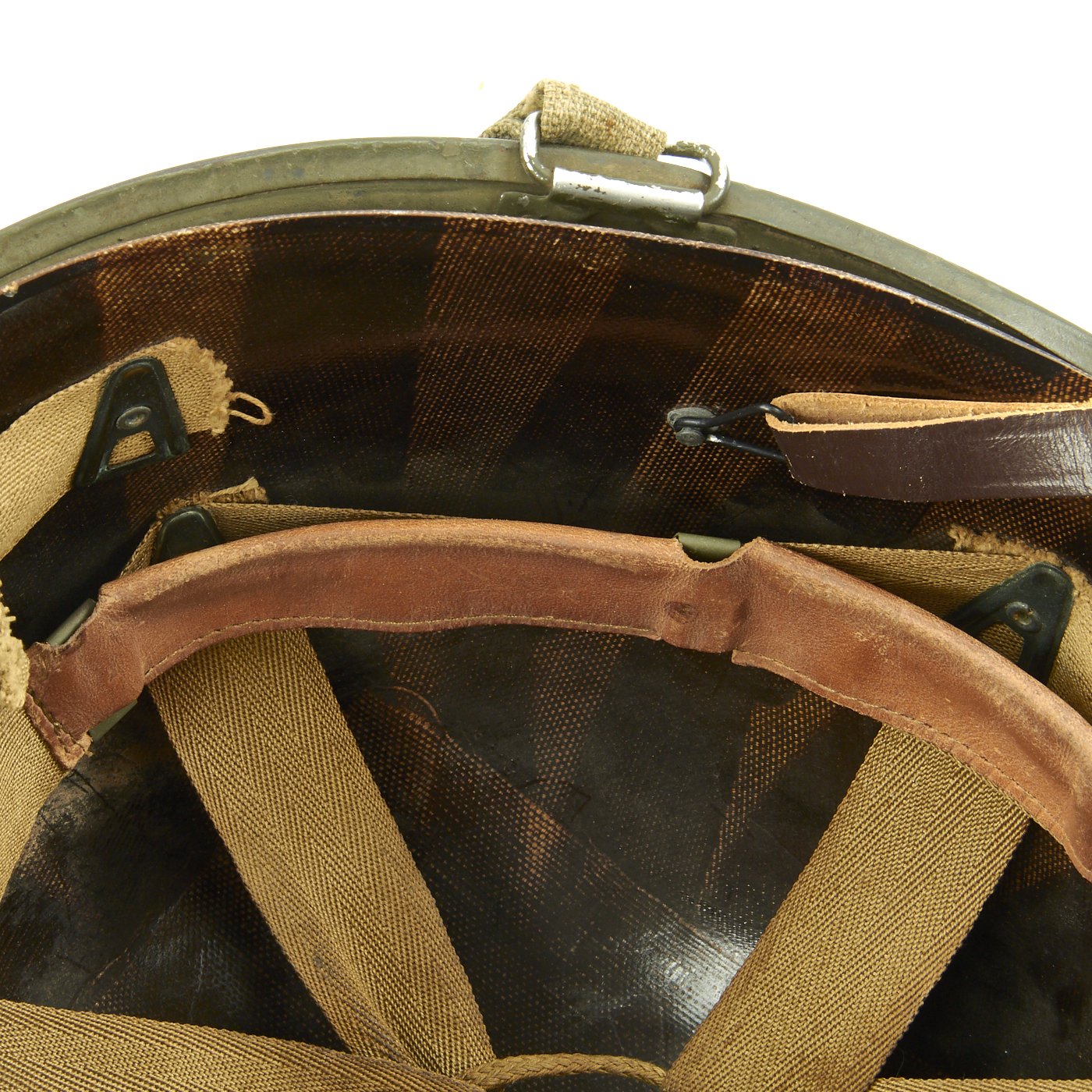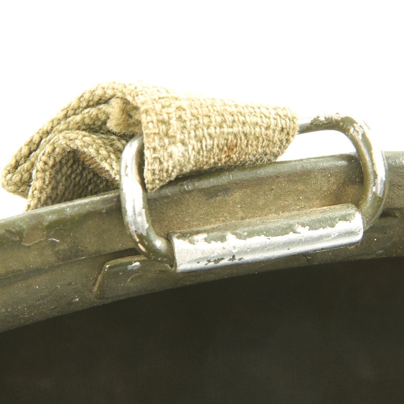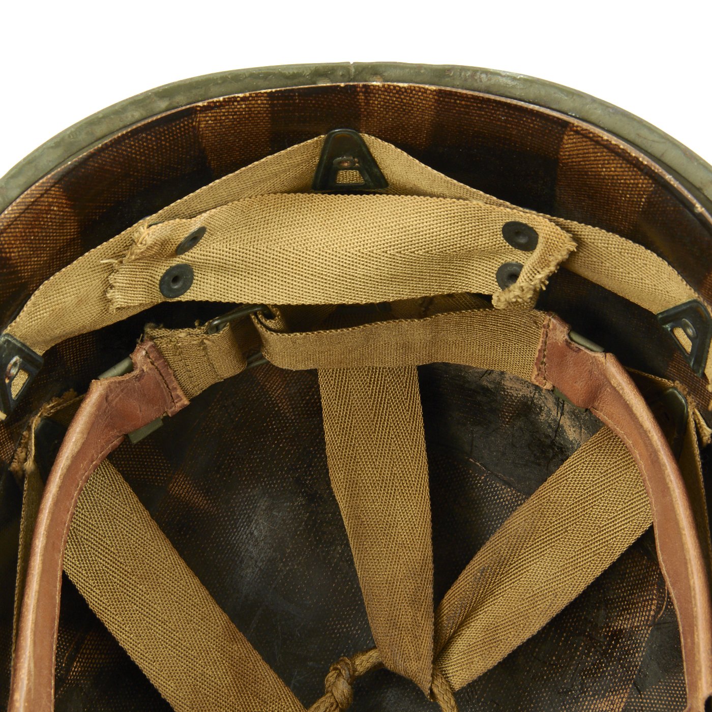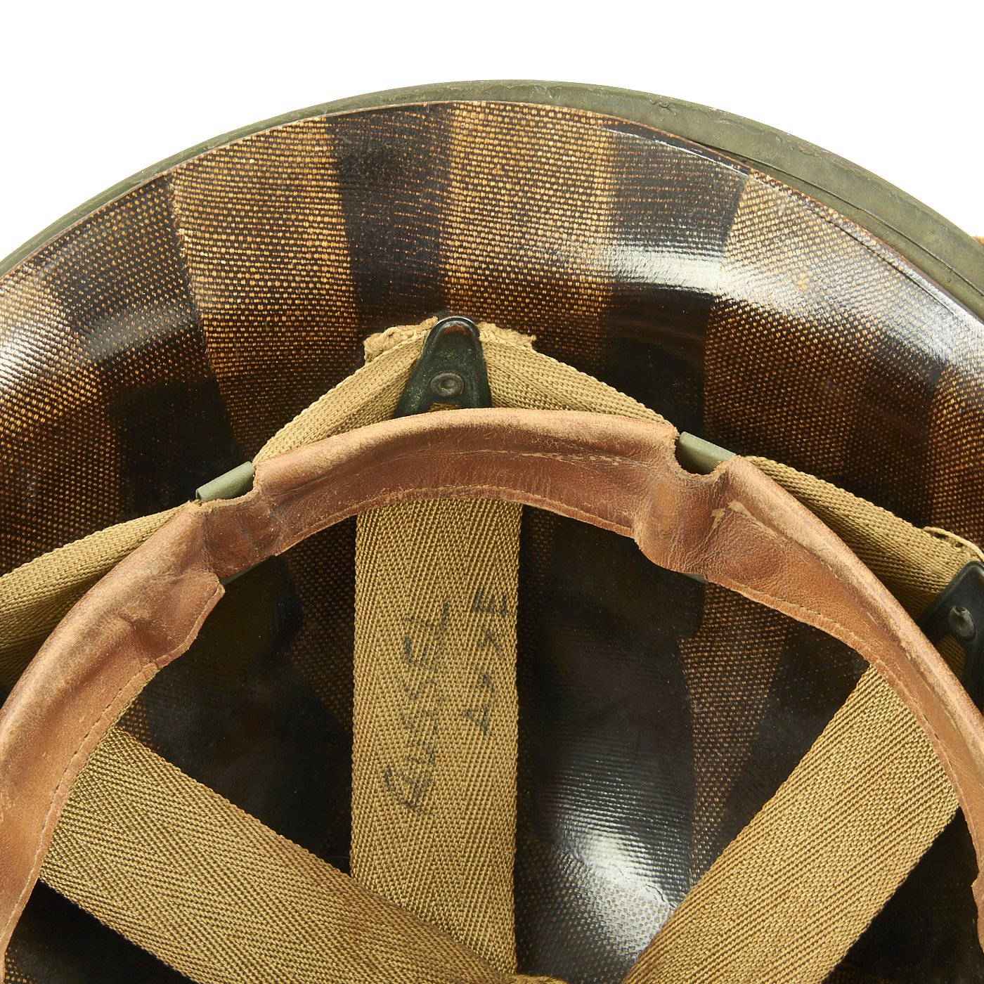 A true US WWII M-1 helmet liner can be identified through the frontal eyelet hole. Other correct WW2 features include cotton herringbone twill (HBT) cloth suspension. This HBT suspension is held tightly within the M-1 helmet liner by rivets and a series of triangular "A" washers. The three upper suspension bands are joined together with a shoestring. This way the wearer could adjust the fit. All parts of this liner are original WWII manufacture and are in excellent condition!
