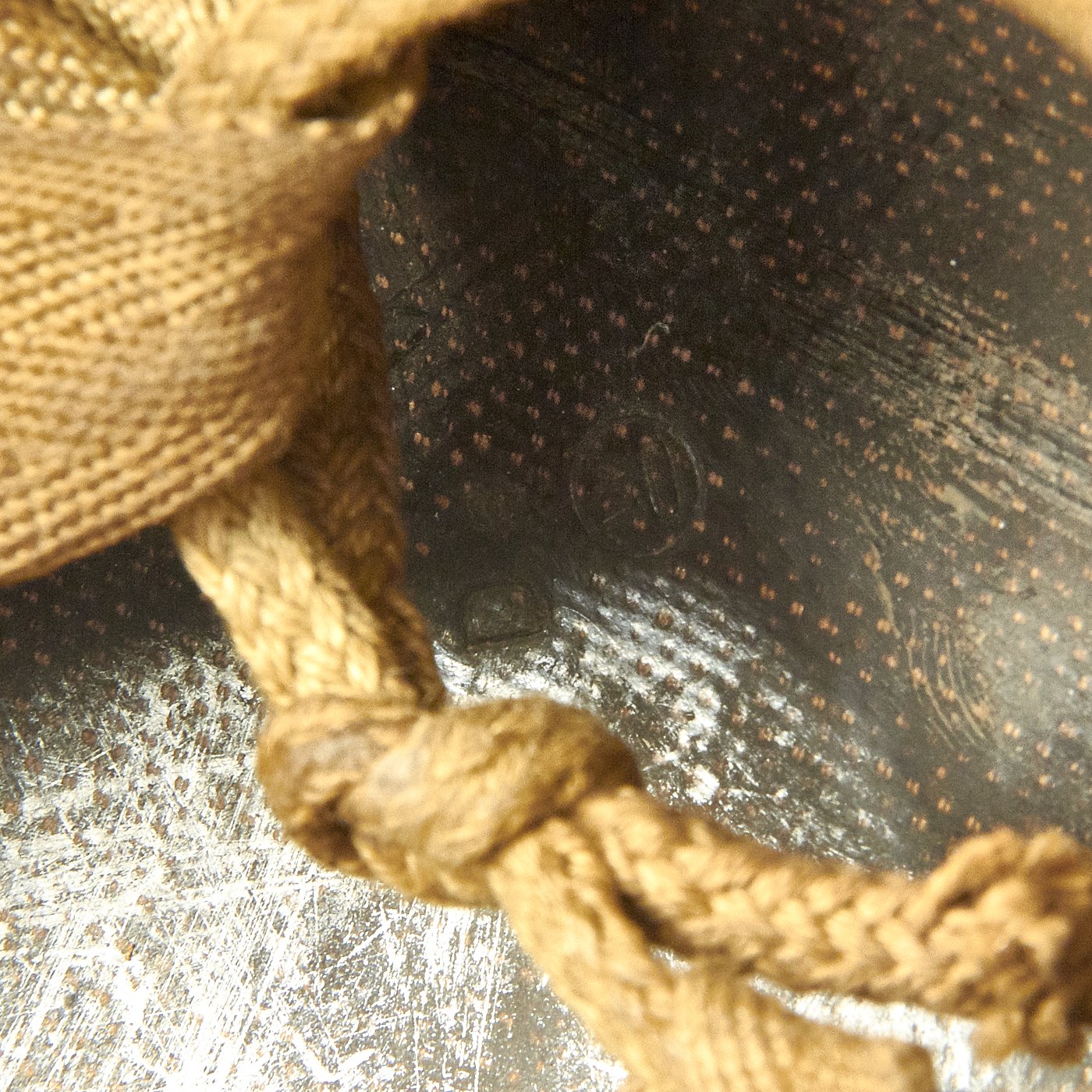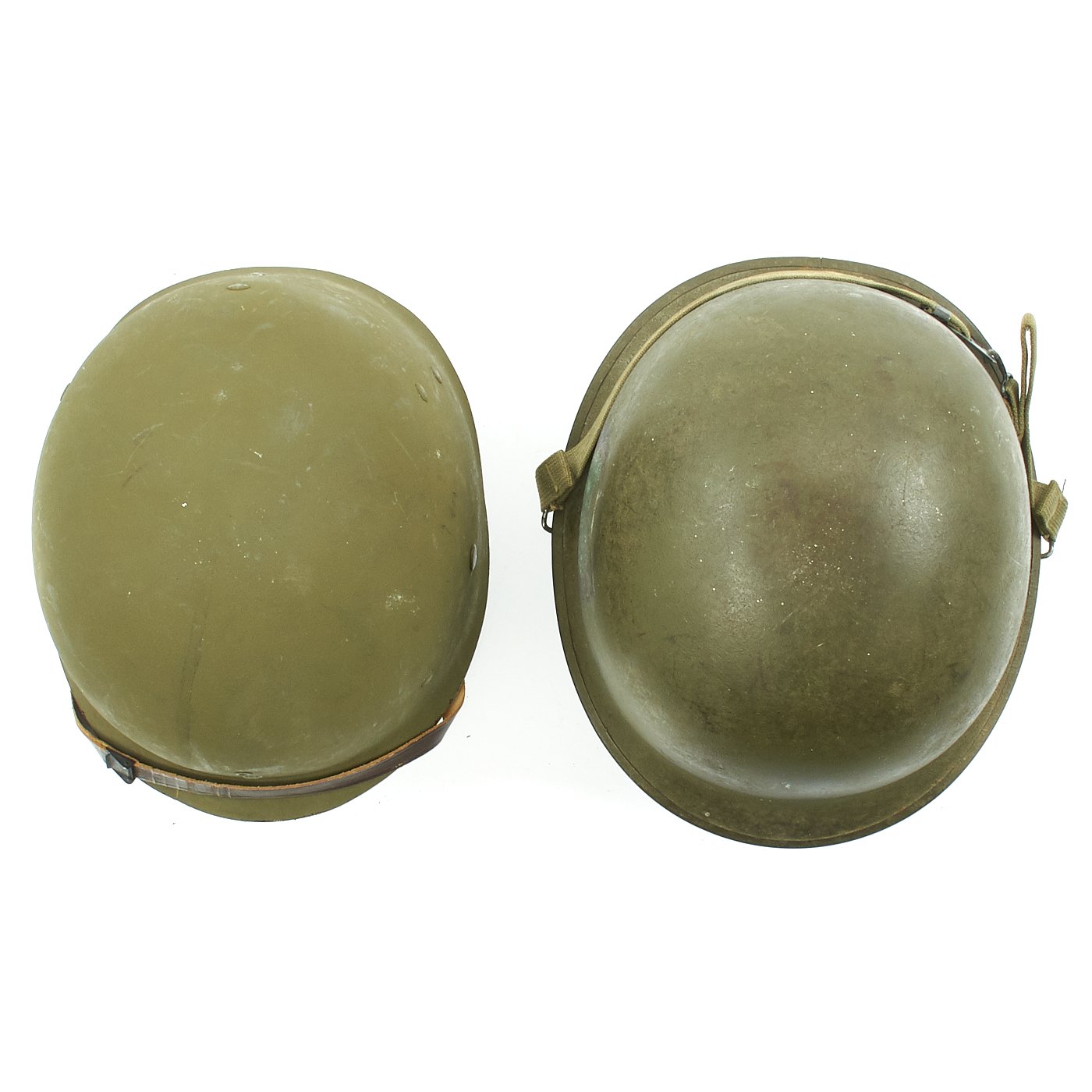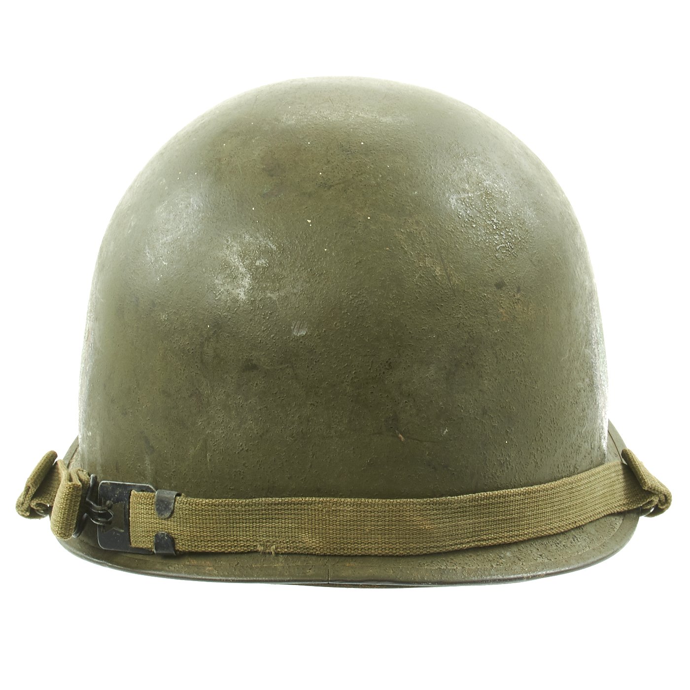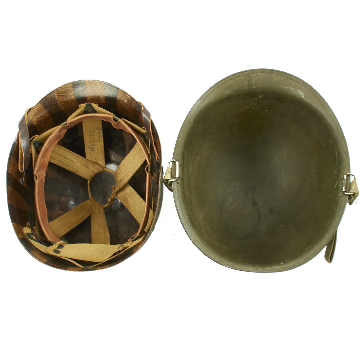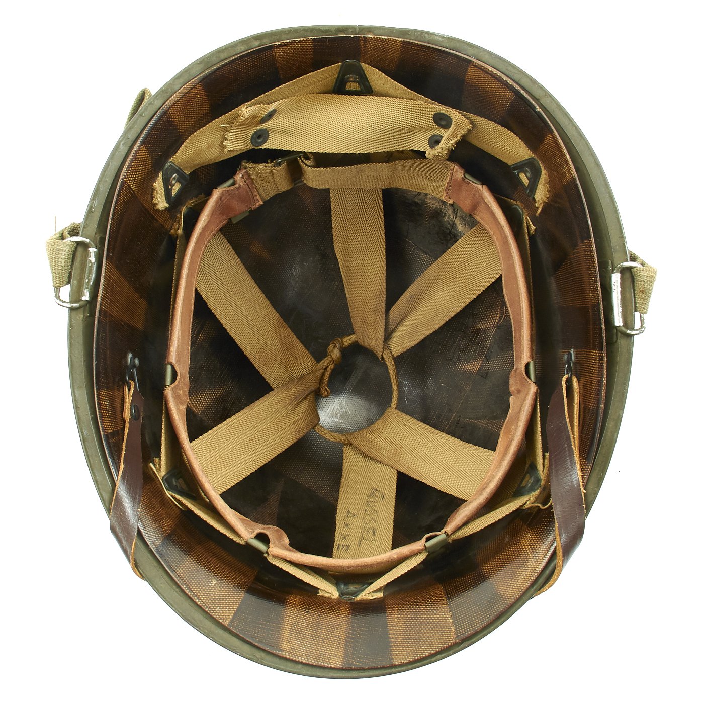A true US WWII M-1 helmet liner can be identified through the frontal eyelet hole. Other correct WW2 features include cotton herringbone twill (HBT) cloth suspension. This HBT suspension is held tightly within the M-1 helmet liner by rivets and a series of triangular "A" washers. The three upper suspension bands are joined together with a shoestring. This way the wearer could adjust the fit. All parts of this liner are original WWII manufacture and are in excellent condition!