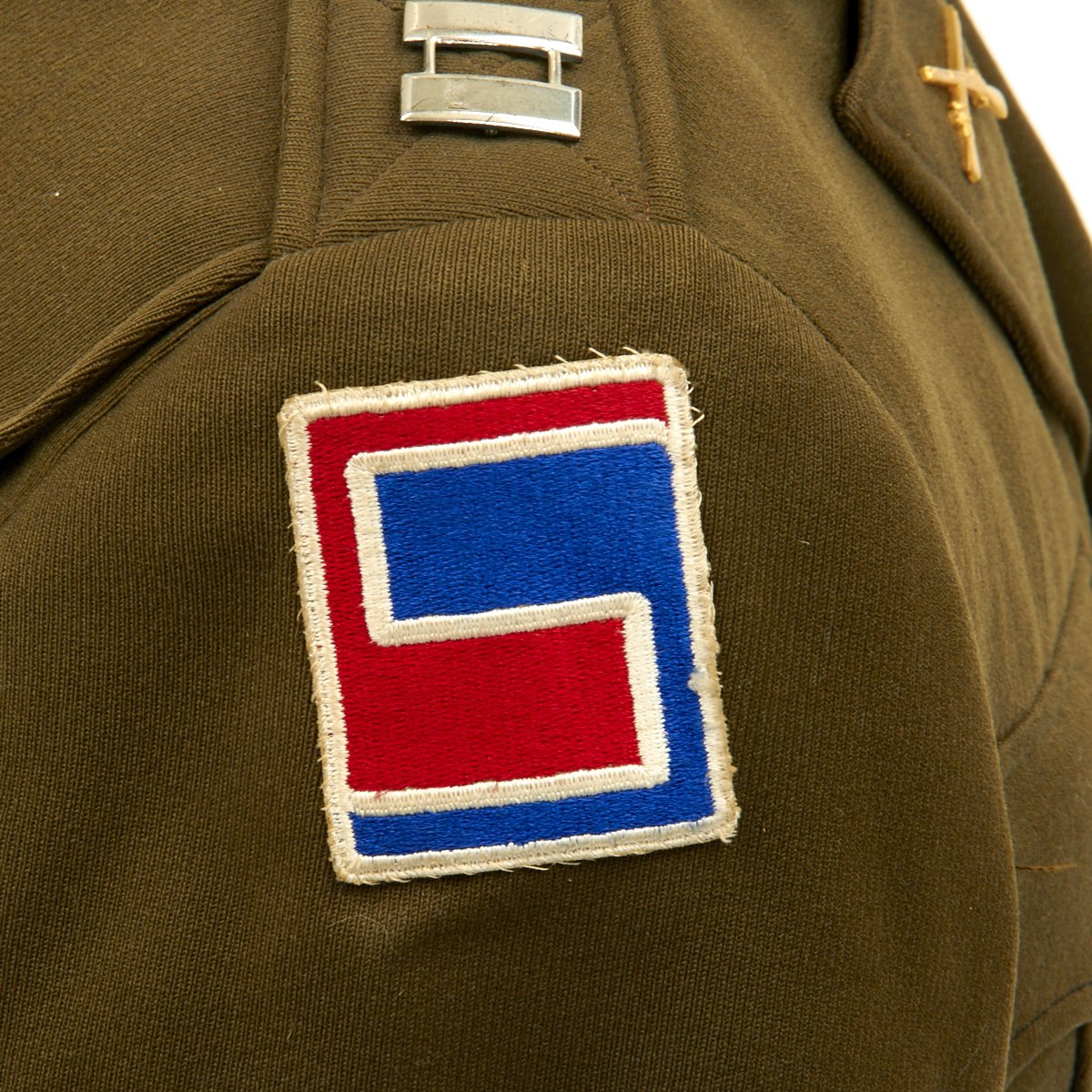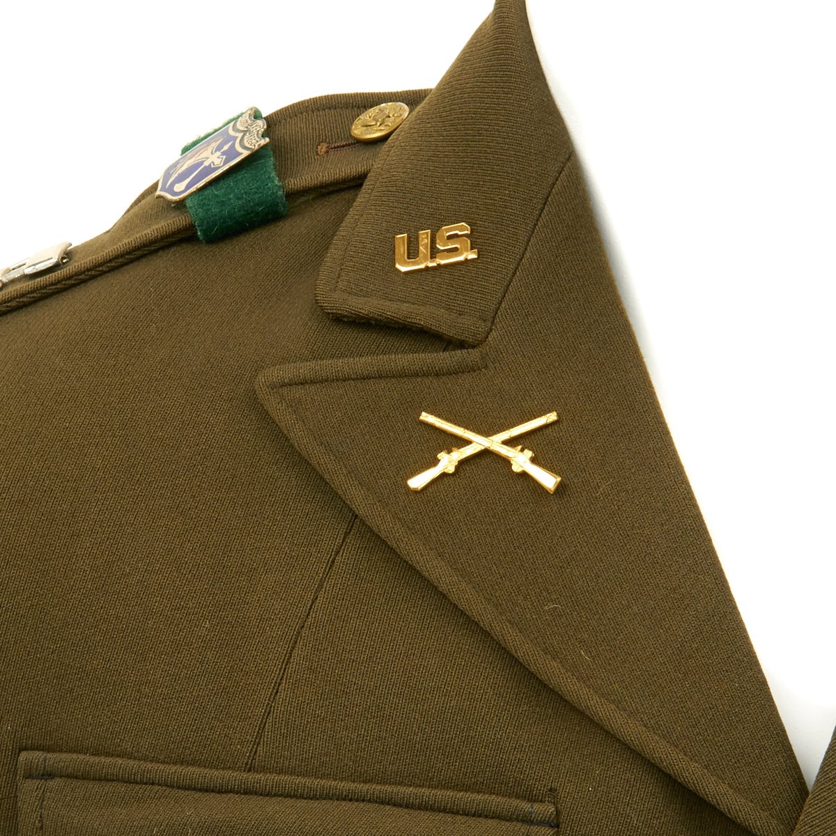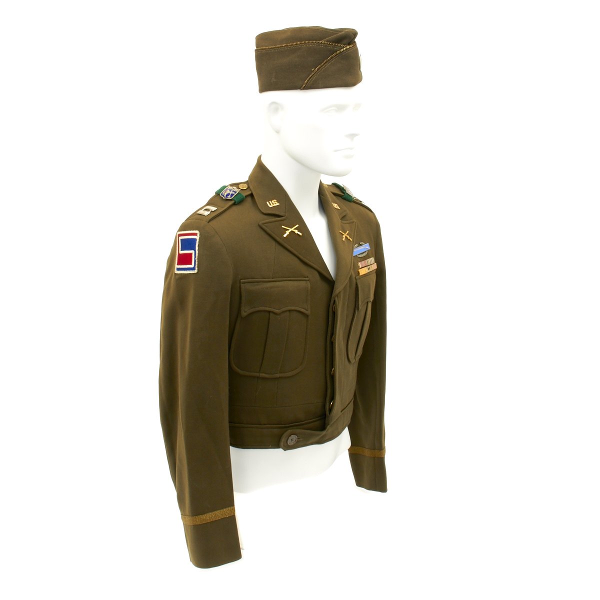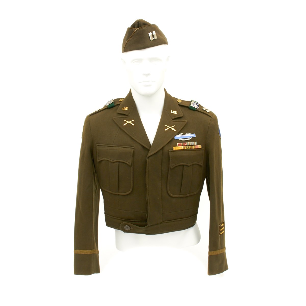- Very high quality Ike jacket in excellent condition with 69th Infantry Division "fighting 69" patch on the right shoulder, 29th Infantry ("Blue and Gray") Division Patch on right shoulder, Lieutenant Bars, 272nd Infantry Regiment ("The Battle Axe Regiment") Distinctive Unit Insignia pins on each shoulder, Sterling Silver Combat Infantryman Badge, Medal ribbons that include: Bronze Star Medal, American Campaign Medal, American Defense Medal, European–African–Middle Eastern Campaign Medal with 2 Bronze Stars, WWII Victory Medal and three overseas service bars on the left sleeve indicating 18+ months of overseas service. The inside pocket bears a label with typed DONALD F. SPRY in two locations..
