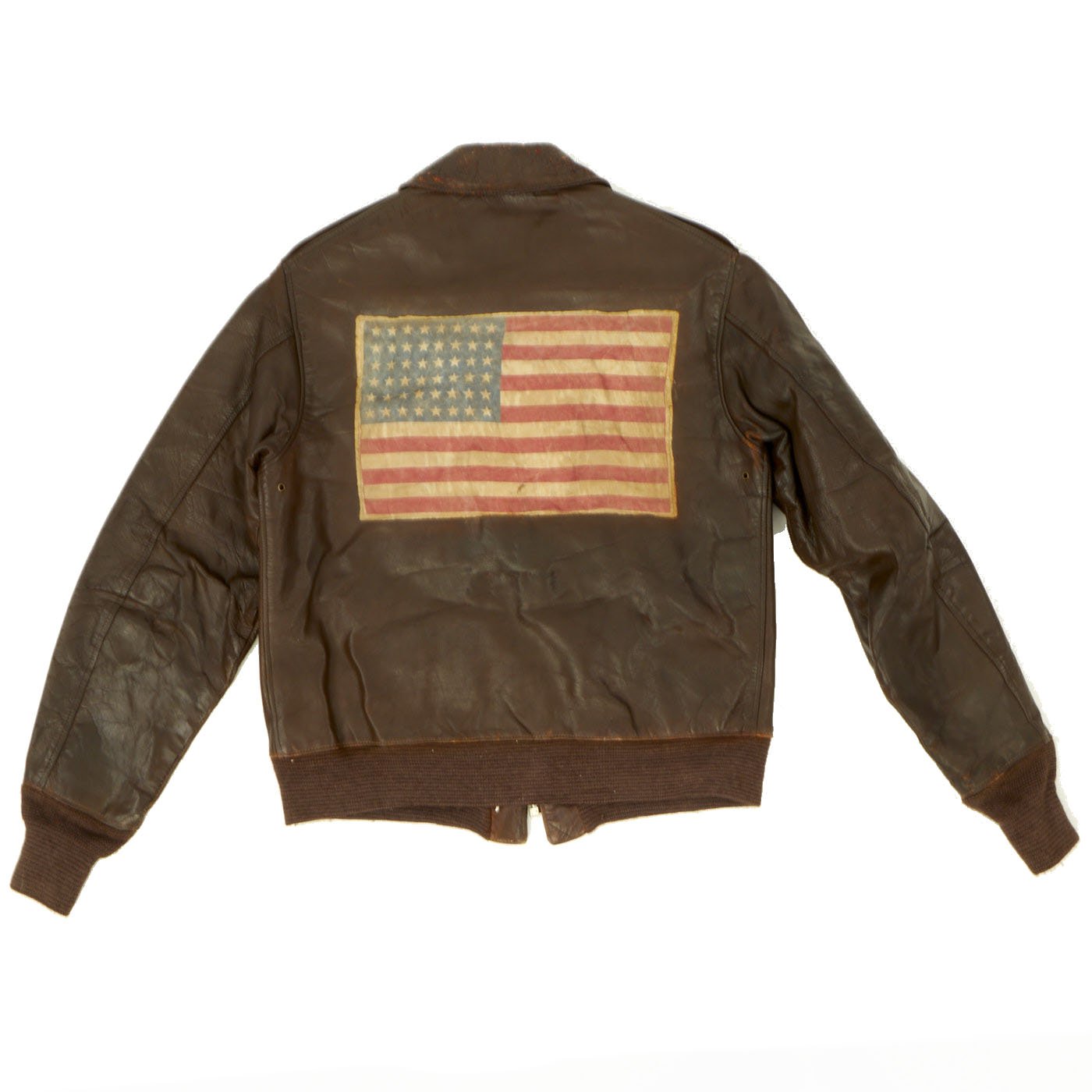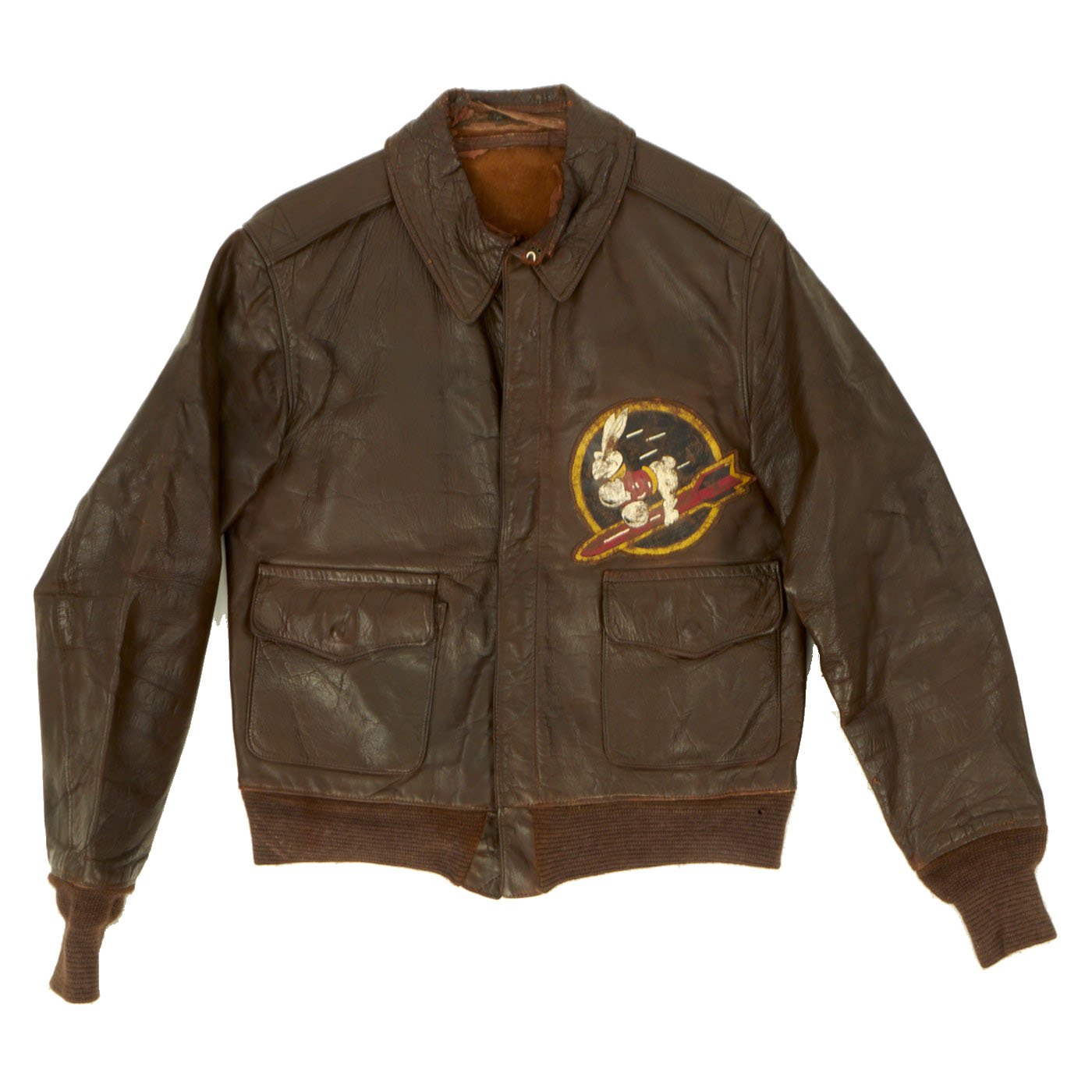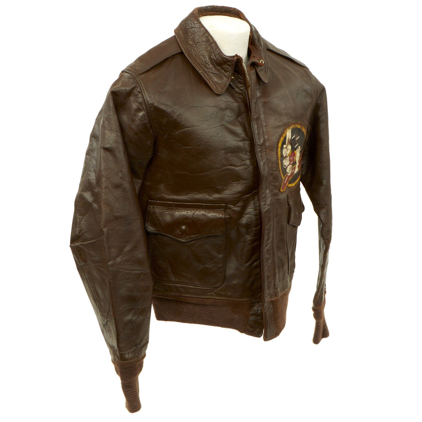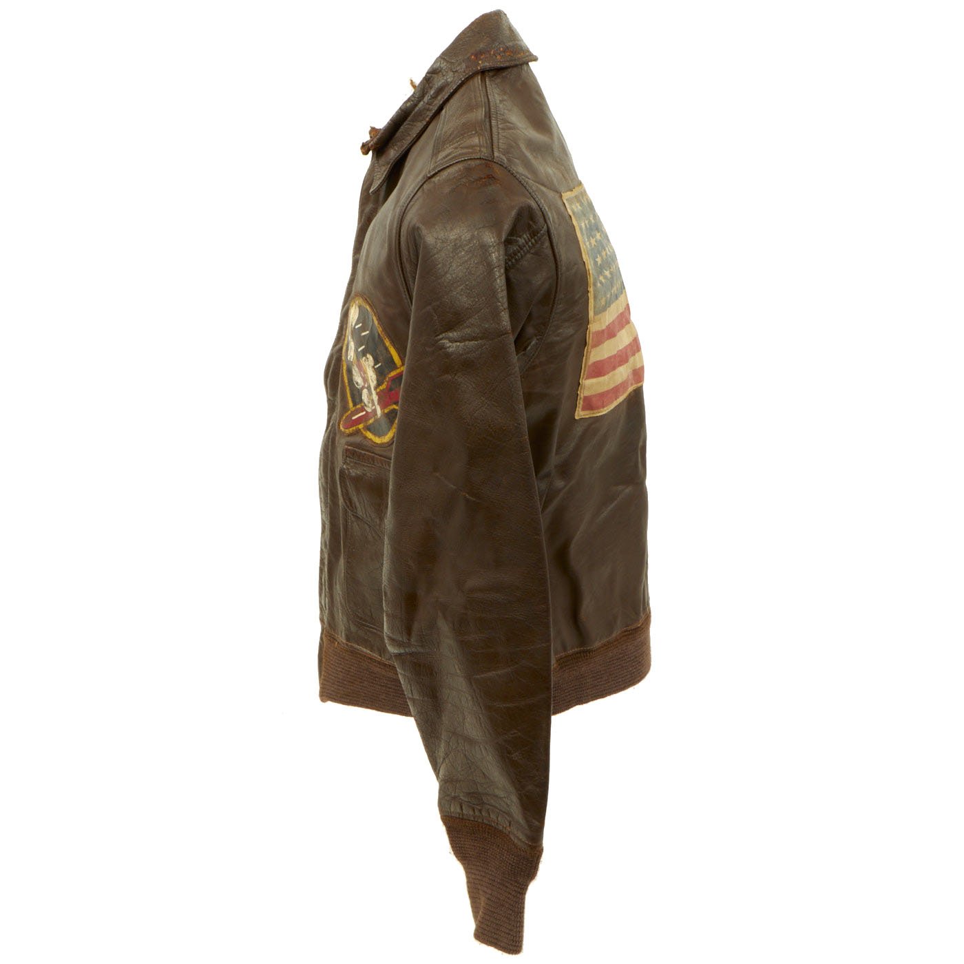 This is a wonderful genuine WW2 issue A-2 leather flight jacket in overall very good condition and extremely desirable due to its provenance and the presence of the ultra rare hand painted squadron patch. The reverse side has a large cotton American flag stitched to the back. There is typical minor cracking to the leather, primarily on the sleeves and the collar edge. The leather remains supple and pliable. The zipper is complete and functional, the cuffs and waist bands appear to be post war replacements.