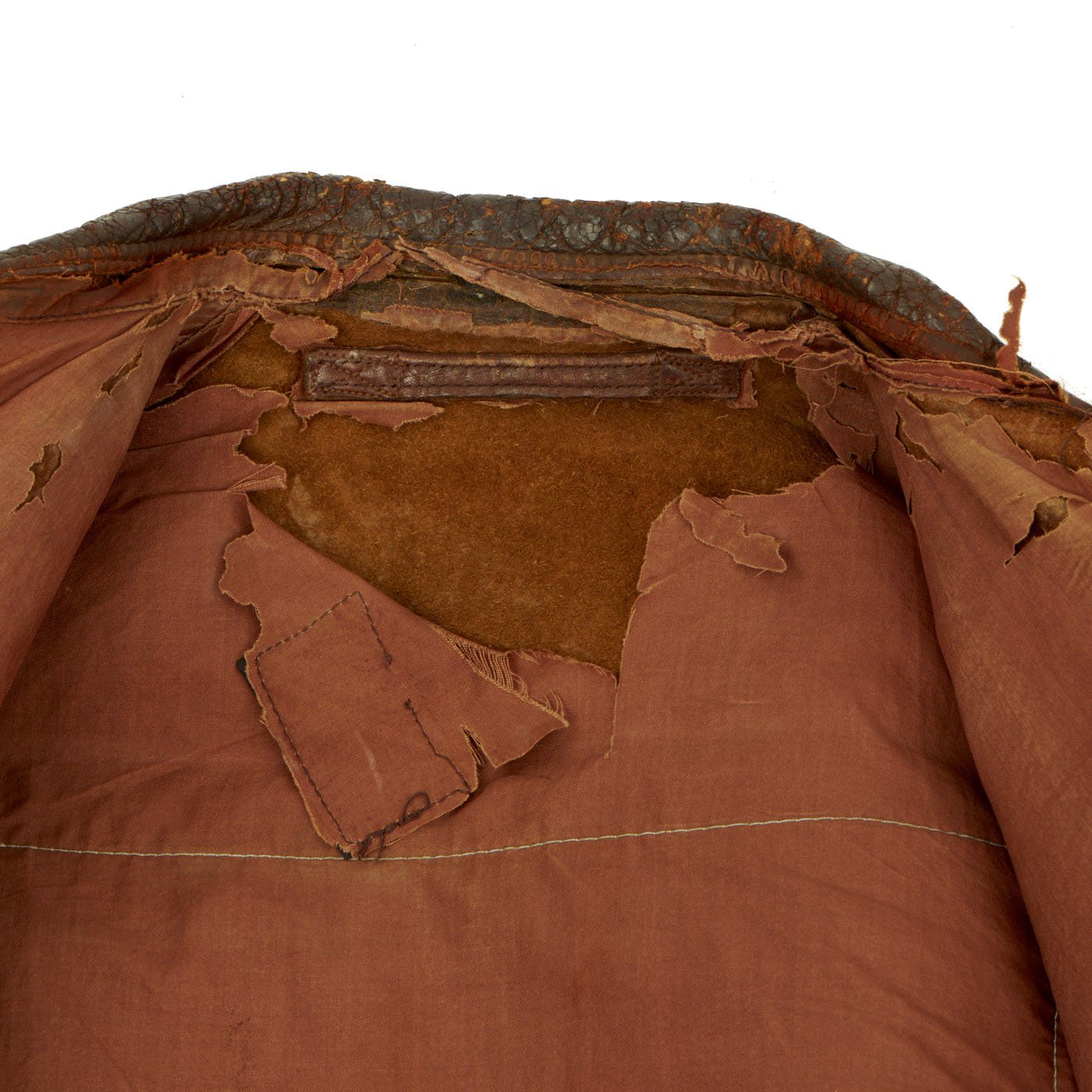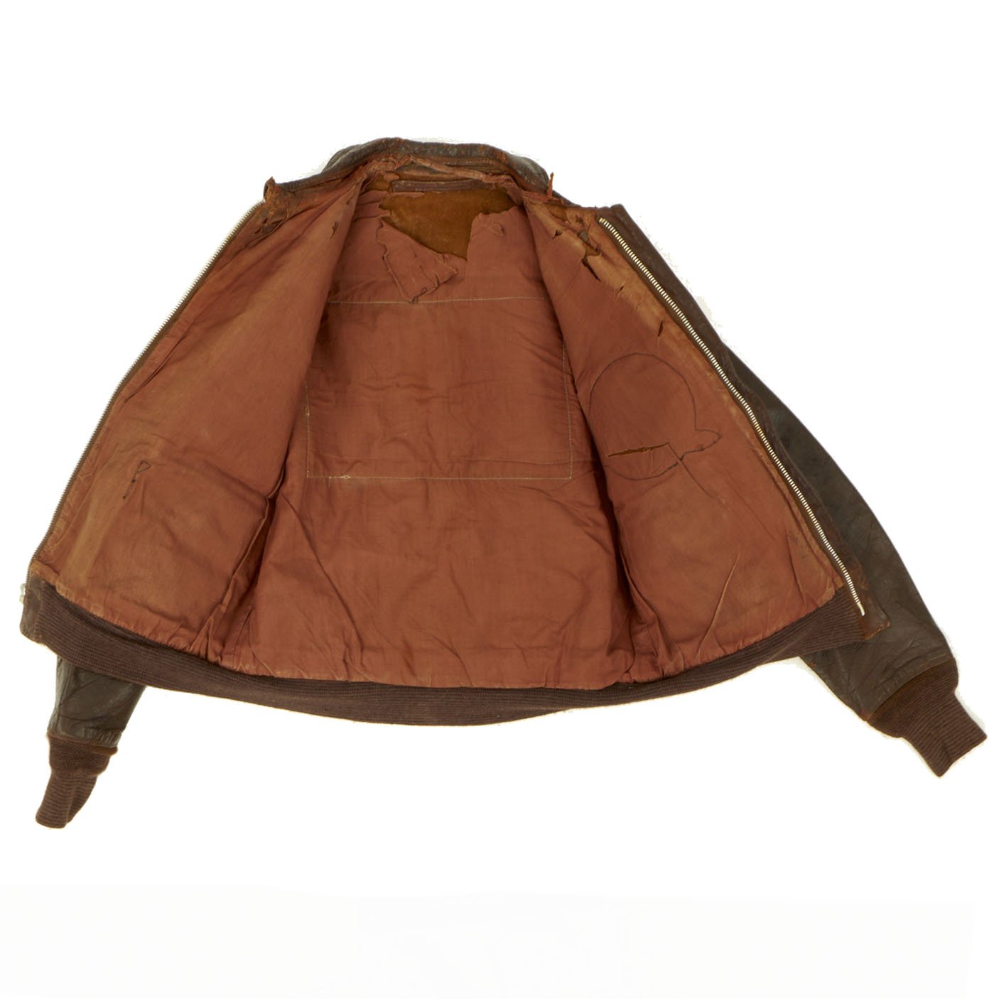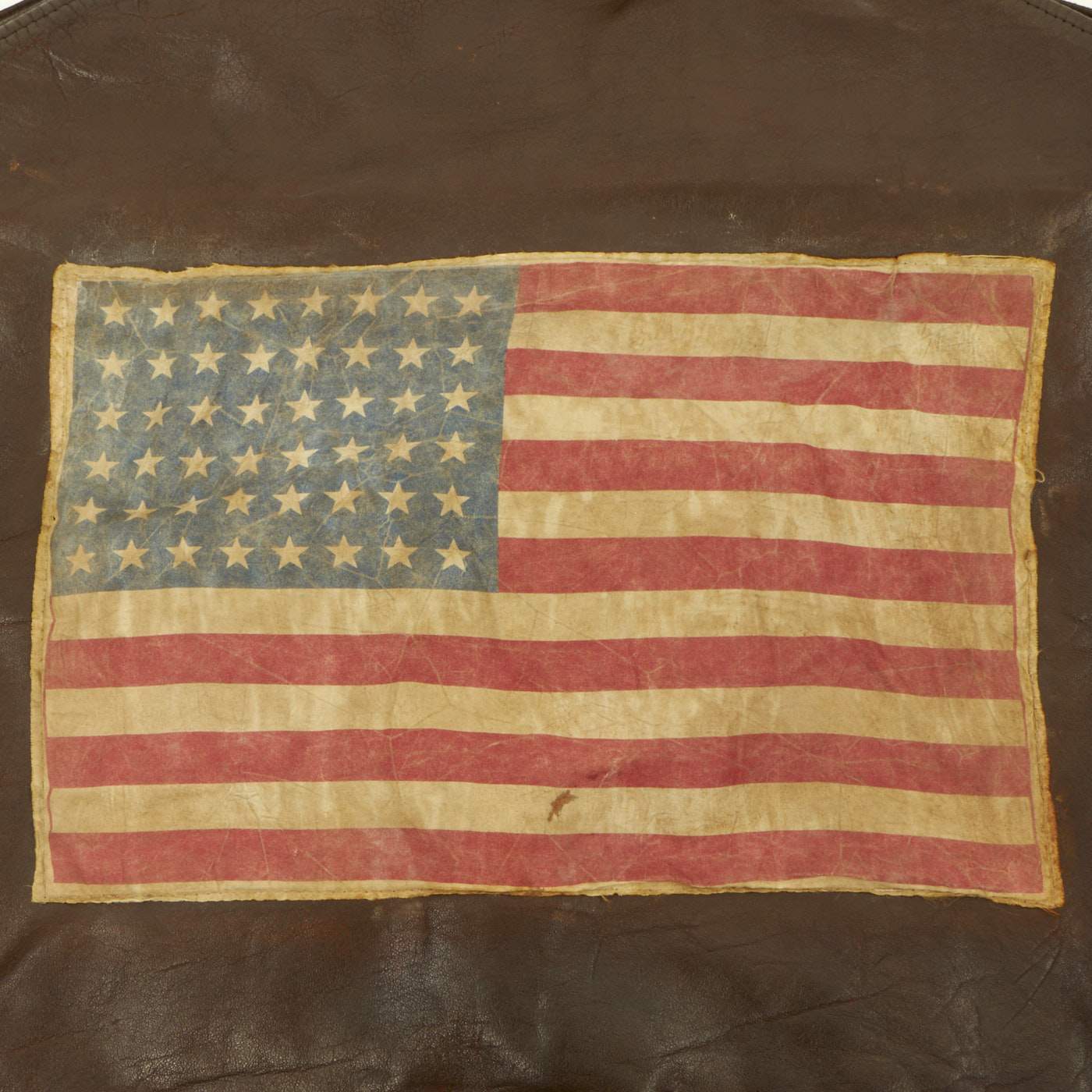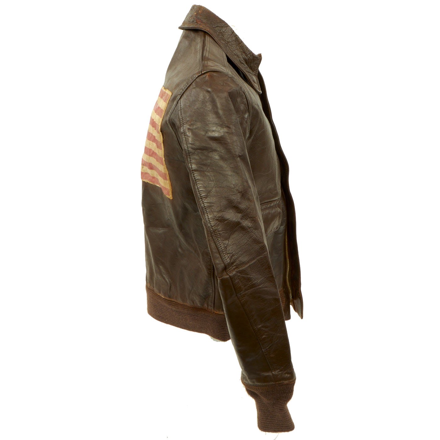 This is a wonderful genuine WW2 issue A-2 leather flight jacket in overall very good condition and extremely desirable due to its provenance and the presence of the ultra rare hand painted squadron patch. The reverse side has a large cotton American flag stitched to the back. There is typical minor cracking to the leather, primarily on the sleeves and the collar edge. The leather remains supple and pliable. The zipper is complete and functional, the cuffs and waist bands appear to be post war replacements.