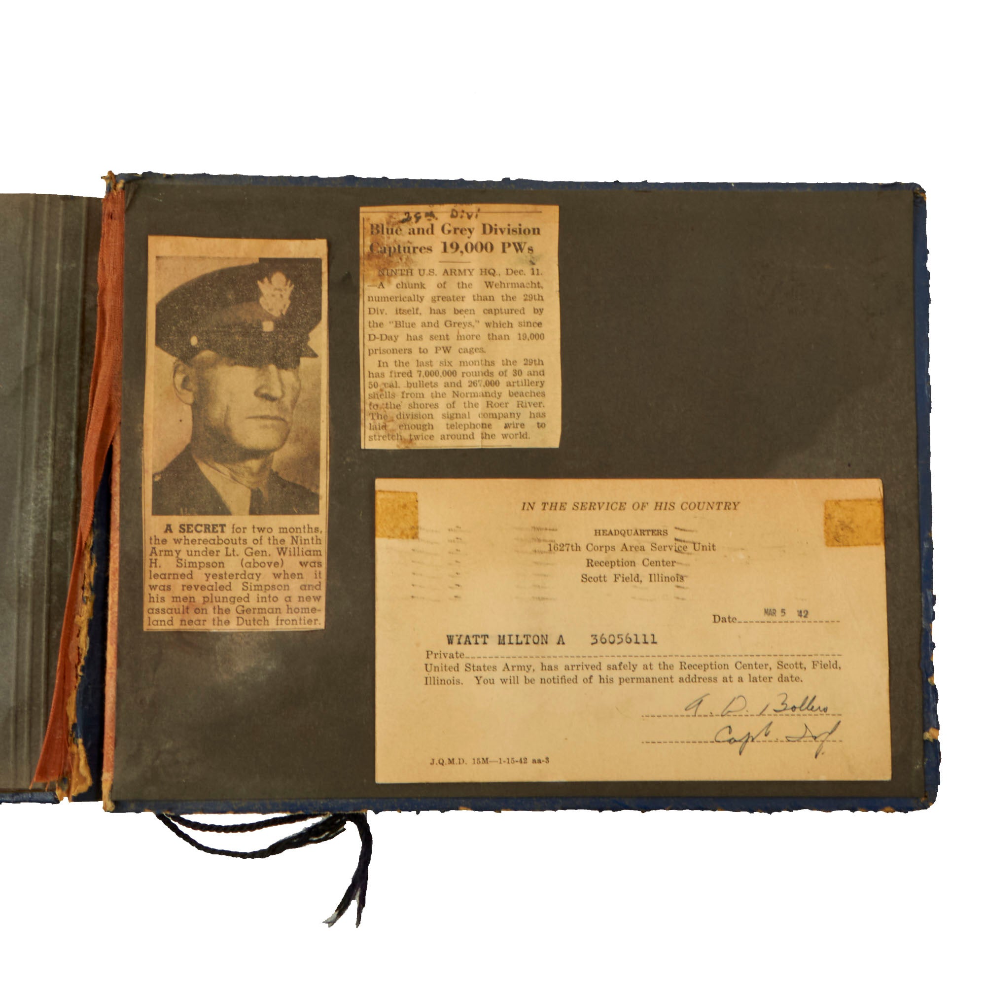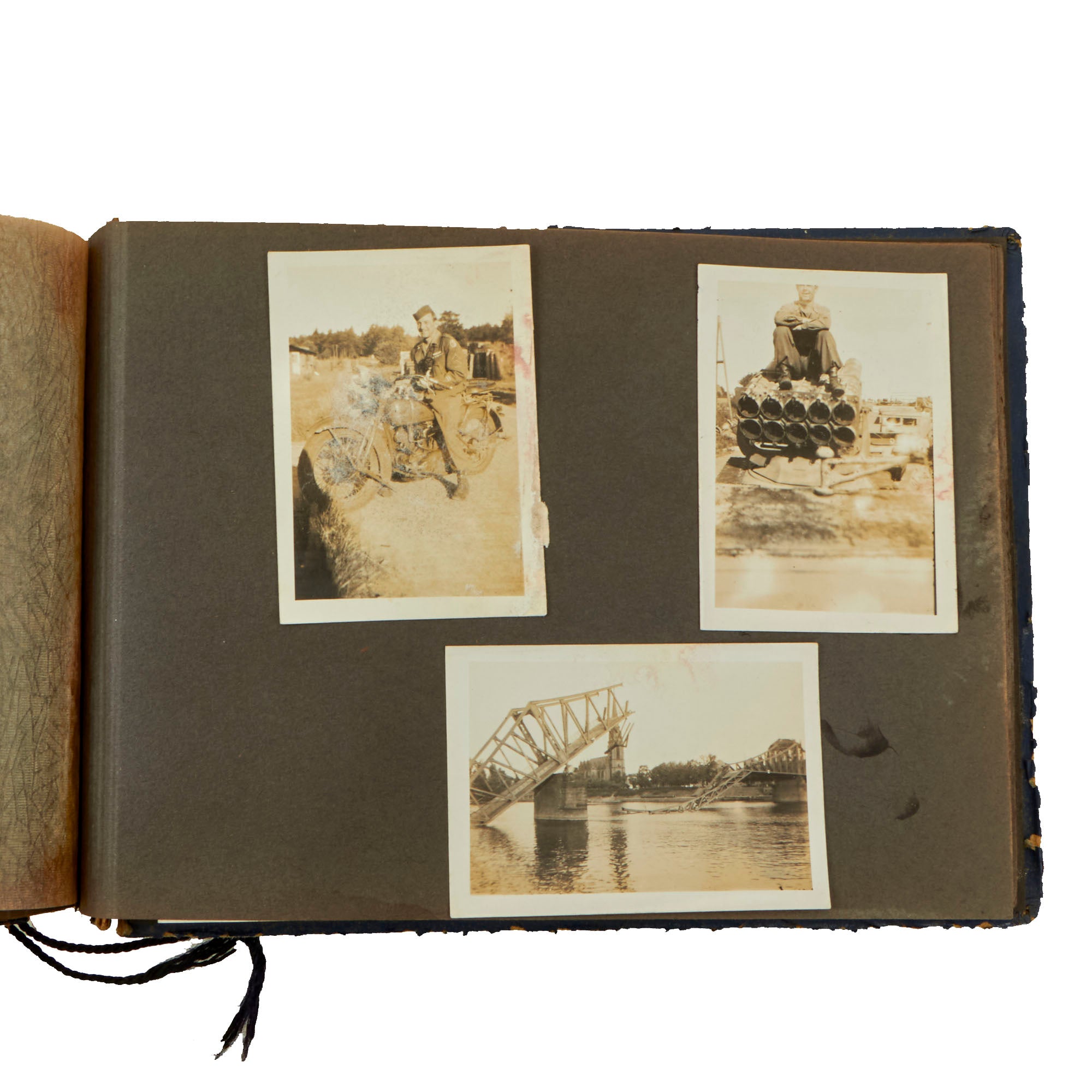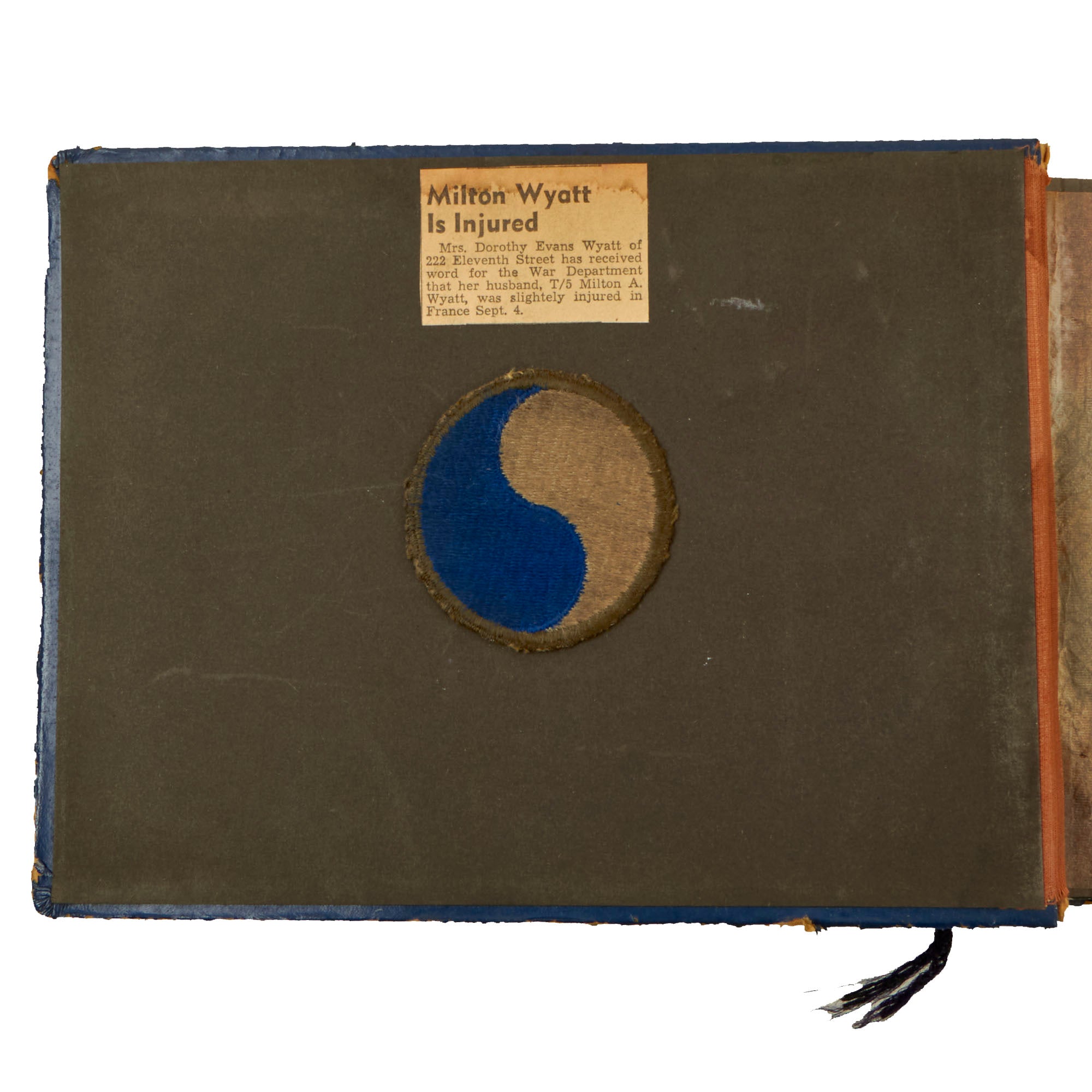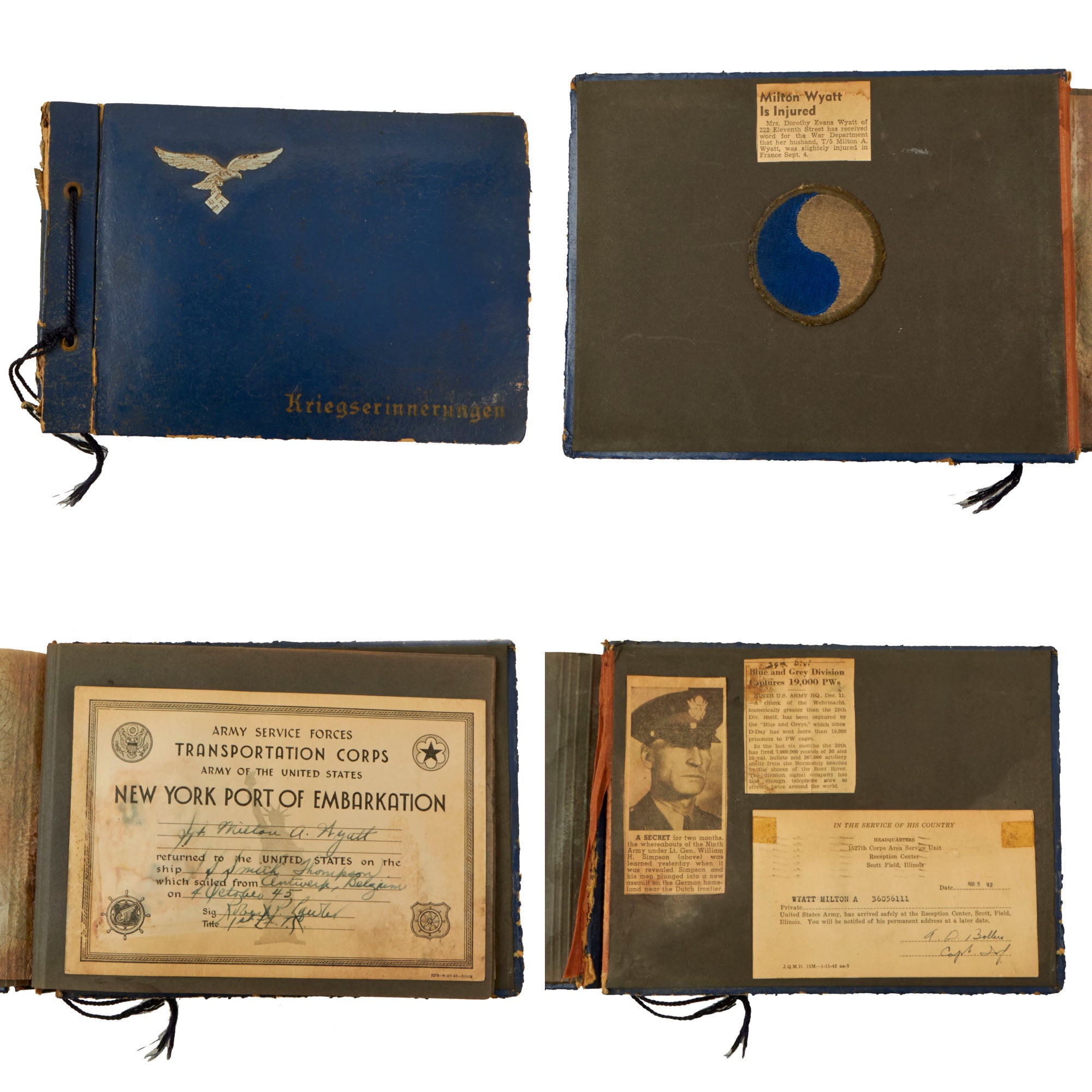 Original Item. One-of-a-Kind. This is a German Luftwaffe photo album that was captured by Technical Sergeant Milton A. Wyatt, 332nd Engineer General Service Regiment, 9th Army. While with the 9th Army, Wyatt served alongside many soldiers of the 29th Infantry Division, and a great many of his photographs are of men from the 29th, with a gorgeous patch of the 29th affixed to the interior cover. The album measures roughly 7 x 10” and the back cover is close to coming off from heavy wear.