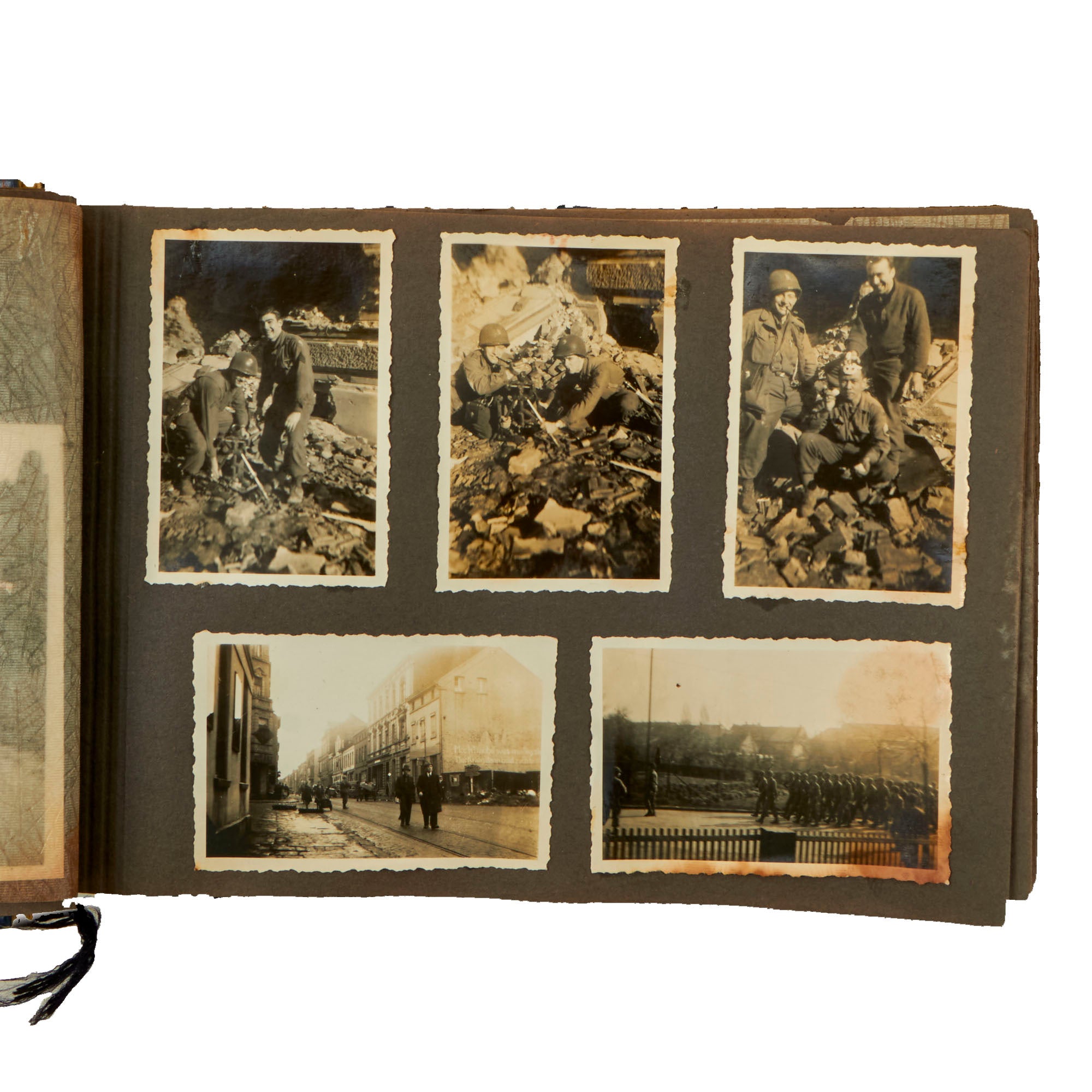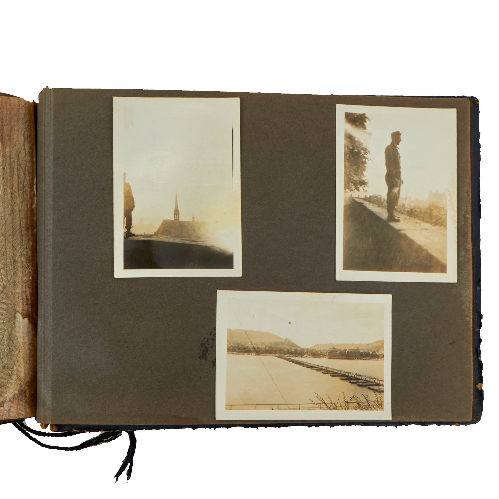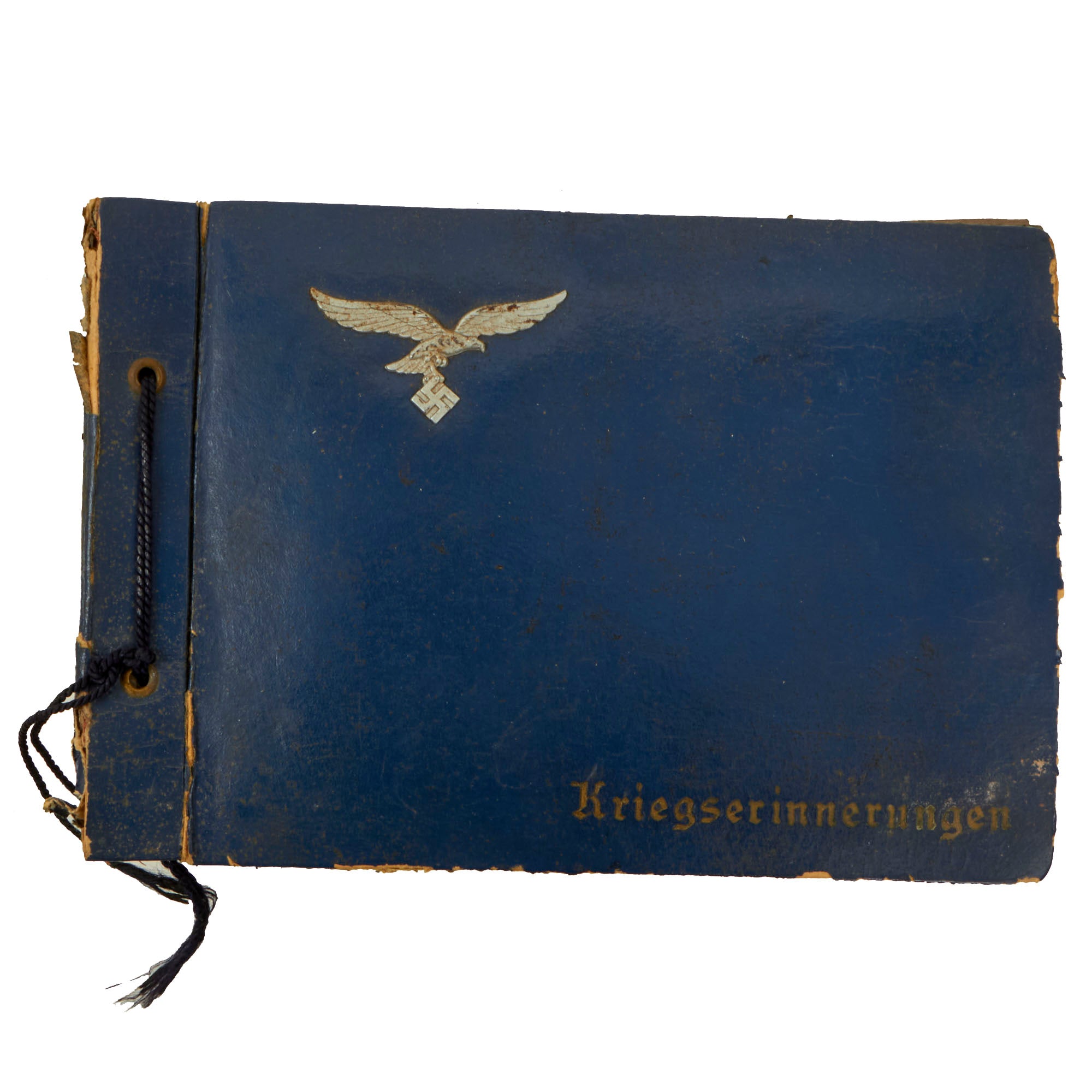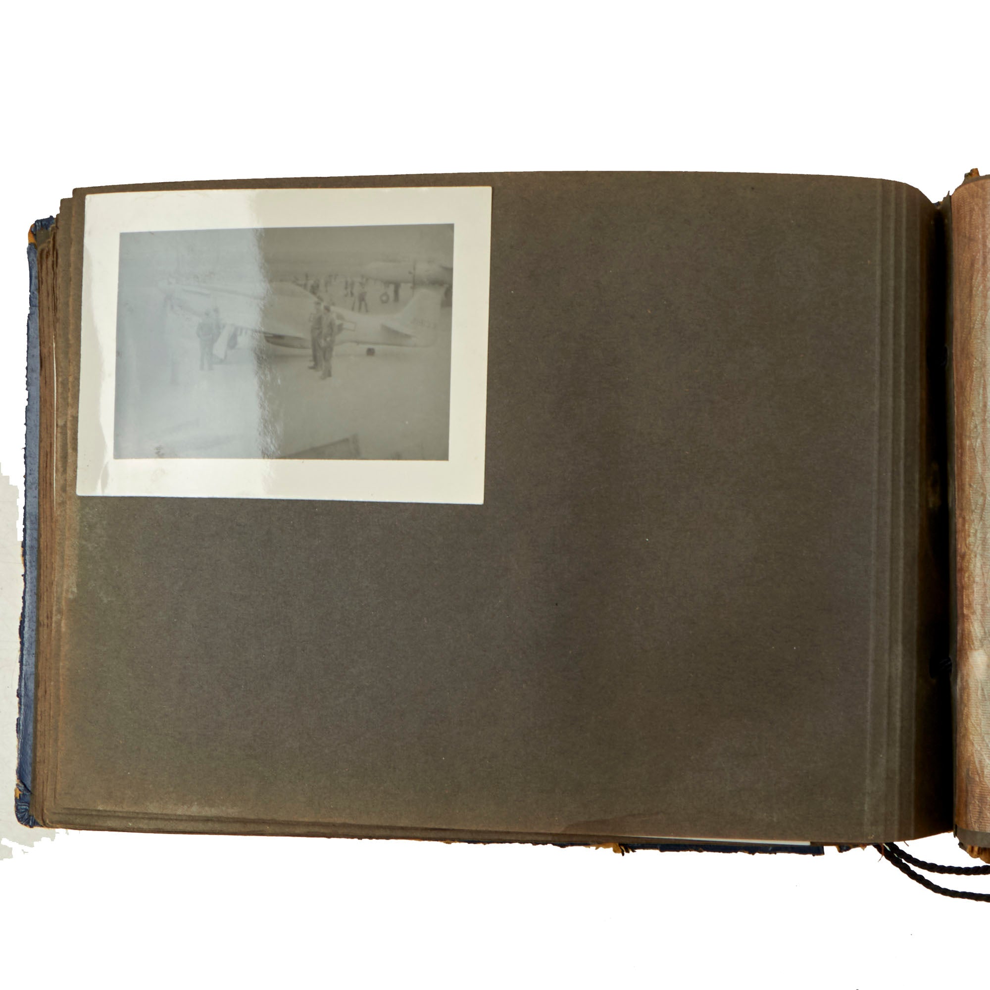 Original Item. One-of-a-Kind. This is a German Luftwaffe photo album that was captured by Technical Sergeant Milton A. Wyatt, 332nd Engineer General Service Regiment, 9th Army. While with the 9th Army, Wyatt served alongside many soldiers of the 29th Infantry Division, and a great many of his photographs are of men from the 29th, with a gorgeous patch of the 29th affixed to the interior cover. The album measures roughly 7 x 10” and the back cover is close to coming off from heavy wear.