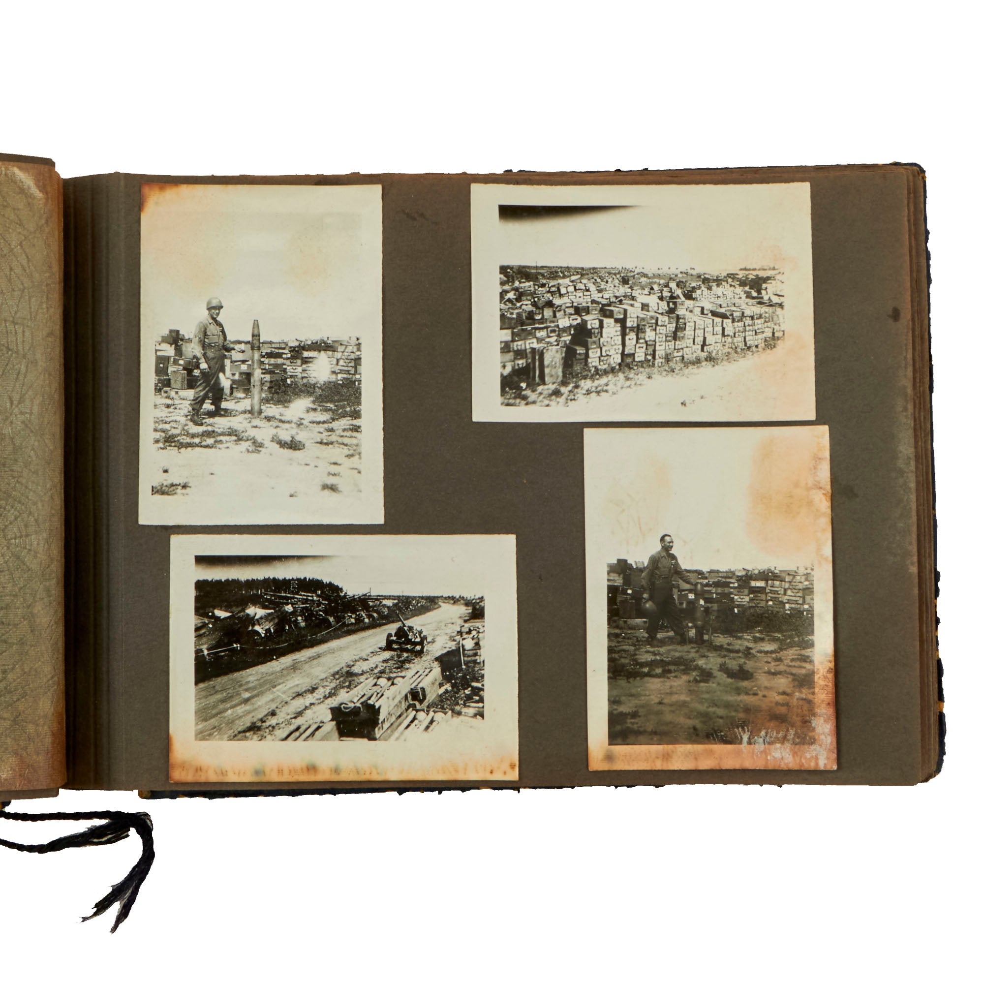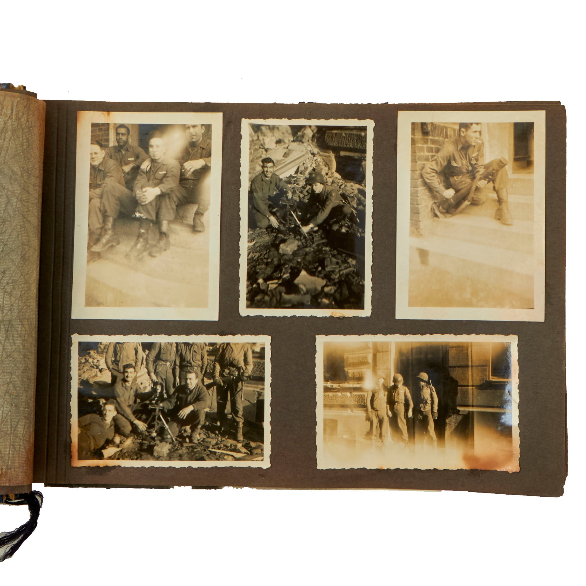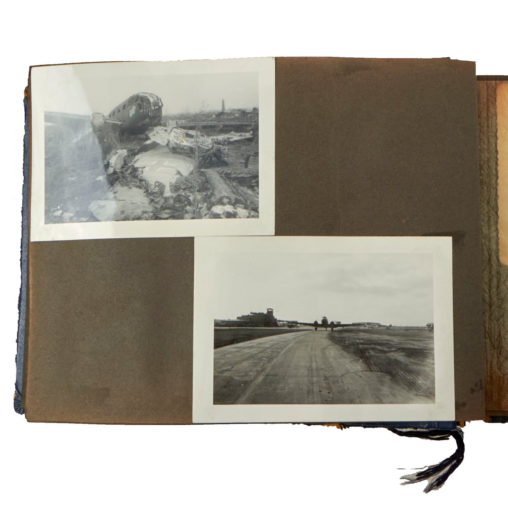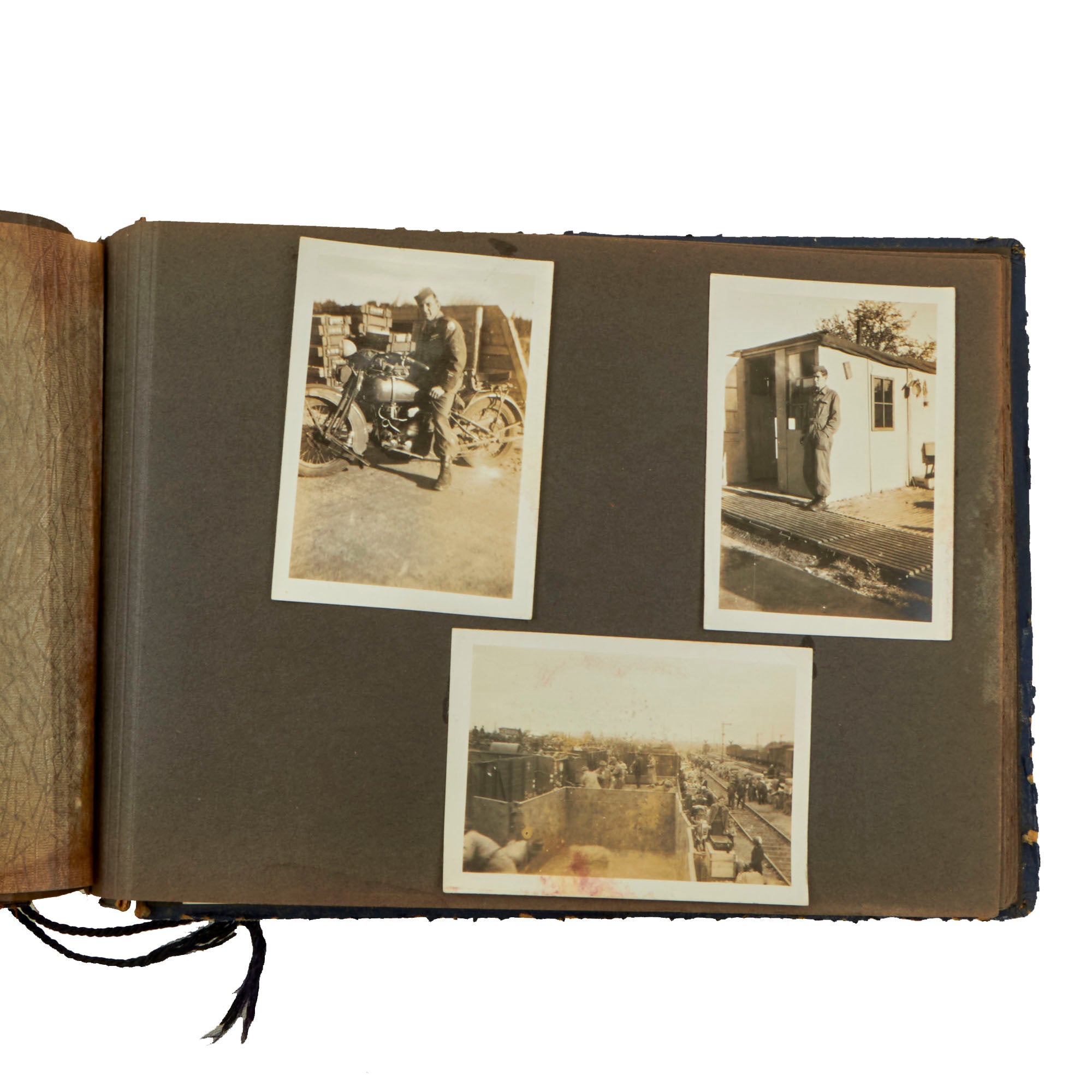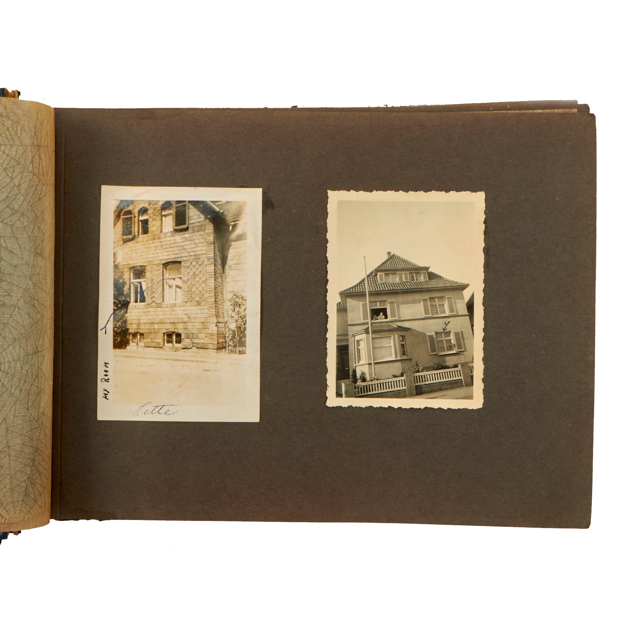 Original Item. One-of-a-Kind. This is a German Luftwaffe photo album that was captured by Technical Sergeant Milton A. Wyatt, 332nd Engineer General Service Regiment, 9th Army. While with the 9th Army, Wyatt served alongside many soldiers of the 29th Infantry Division, and a great many of his photographs are of men from the 29th, with a gorgeous patch of the 29th affixed to the interior cover. The album measures roughly 7 x 10” and the back cover is close to coming off from heavy wear.